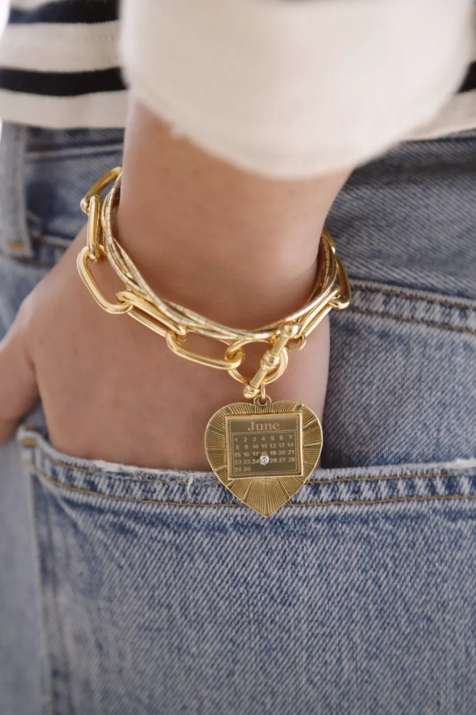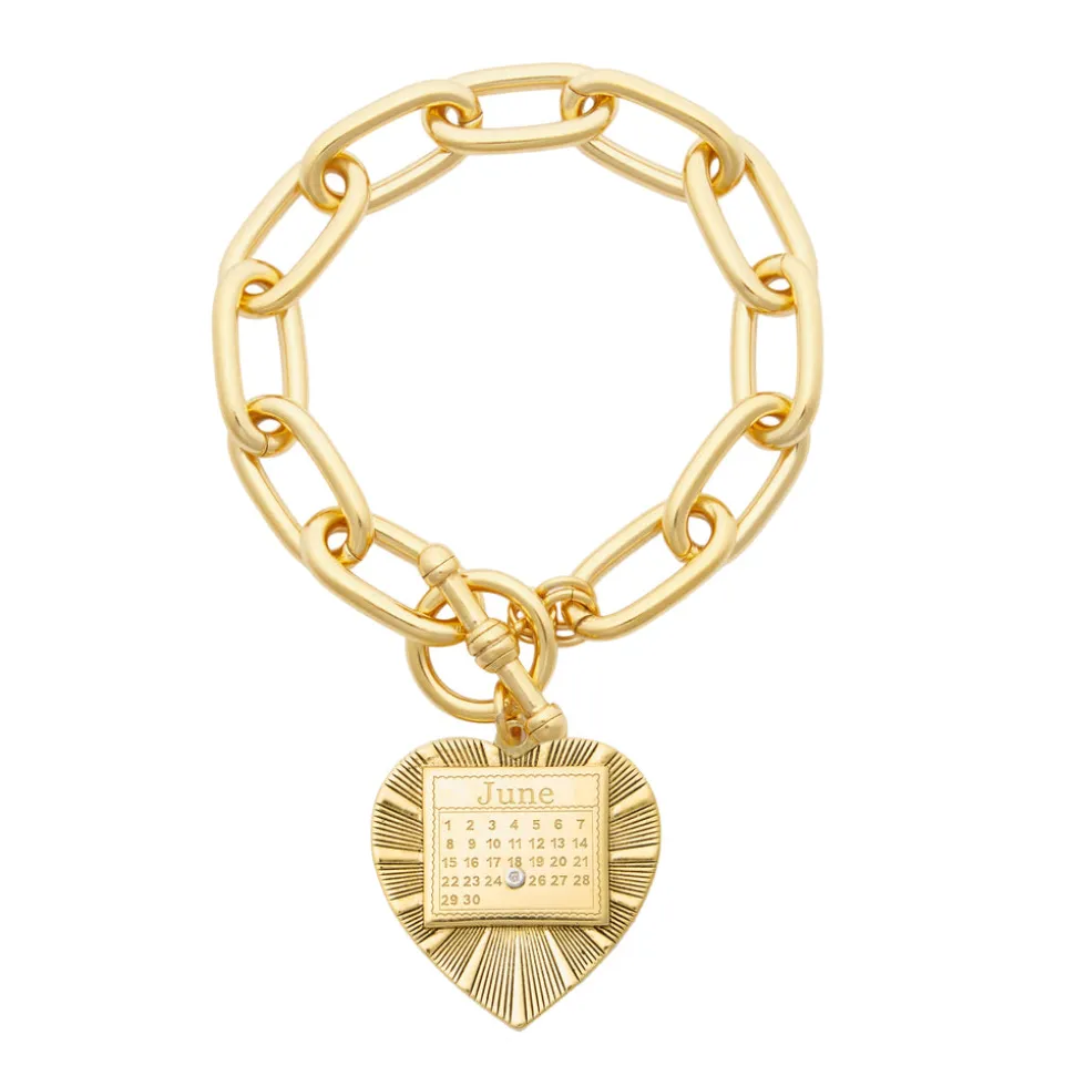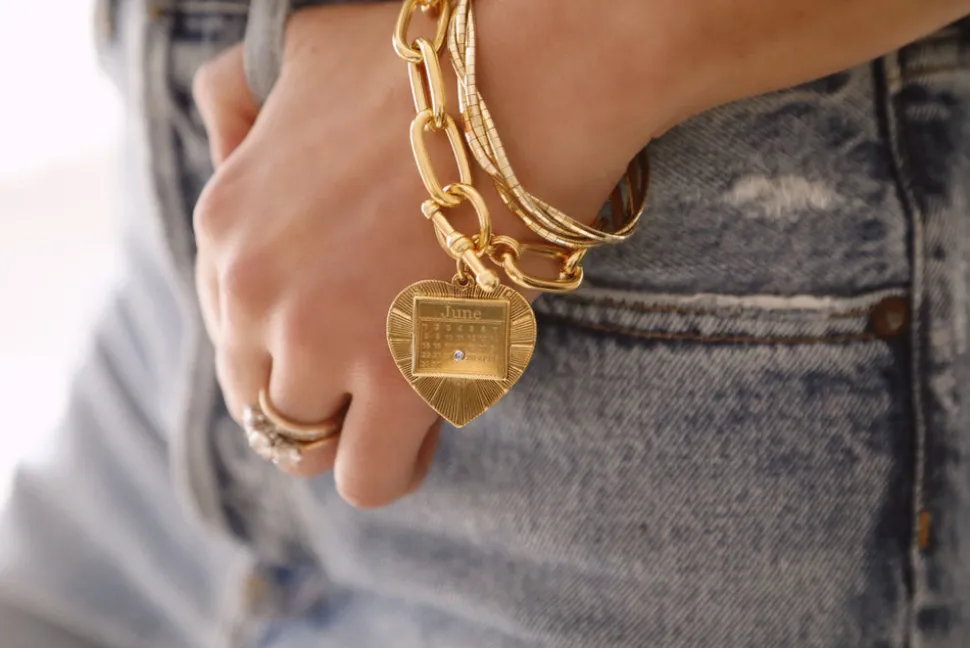 The mother-daughter duo behind Brinker + Eliza combine their experience in metalsmithing and fashion to create incredibly unique jewelry that feels custom-made. Employing pearls, shells, and earth’s most prized organic forms, these are pieces to be not just worn but treasured. Mark your wedding, or another special day, with the Best Day Bracelet. A small diamond creates a forever memory of a date of your choice on a calendar-inscribed golden bezel, which hangs from a chunky 24K chain.