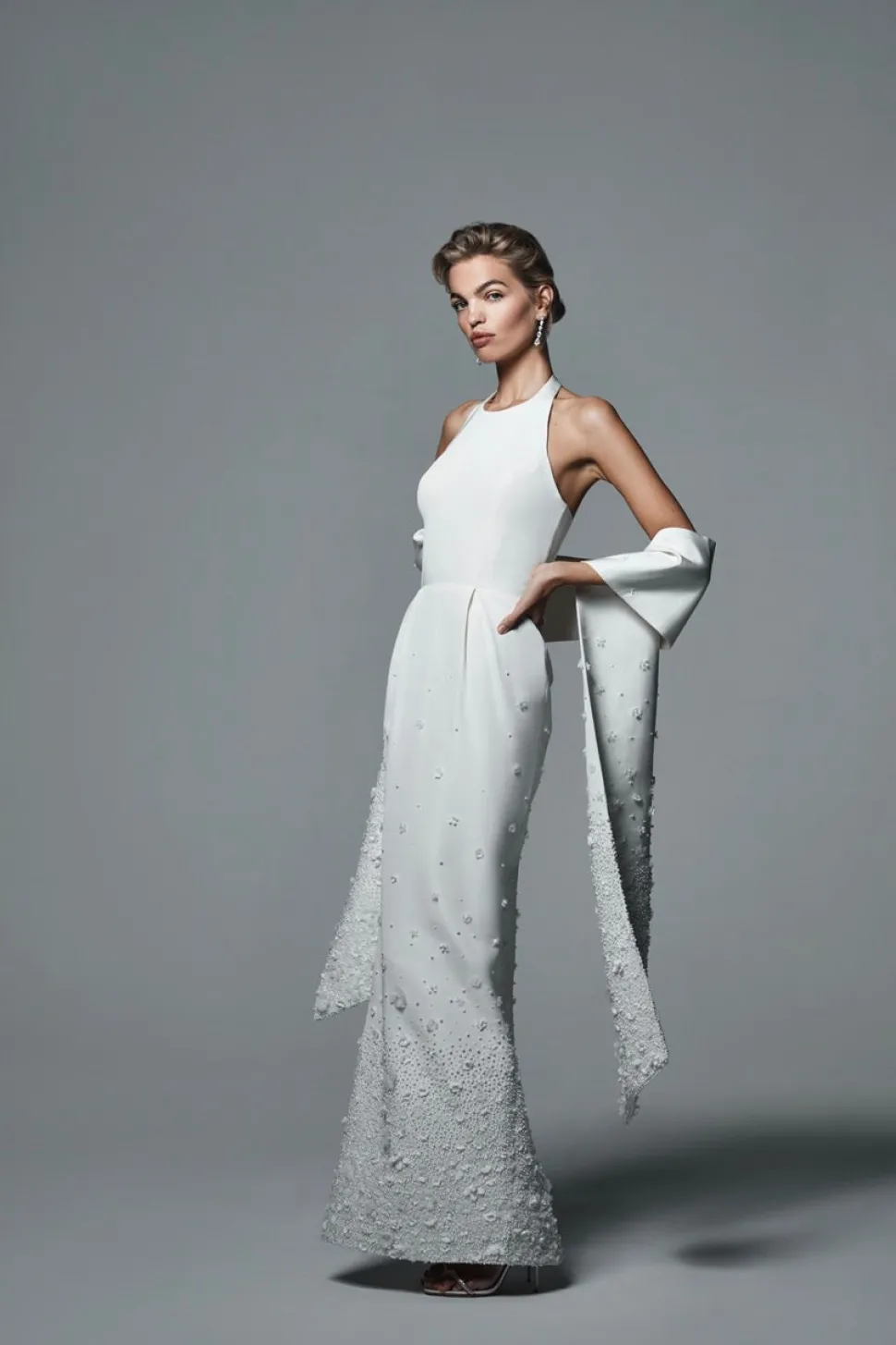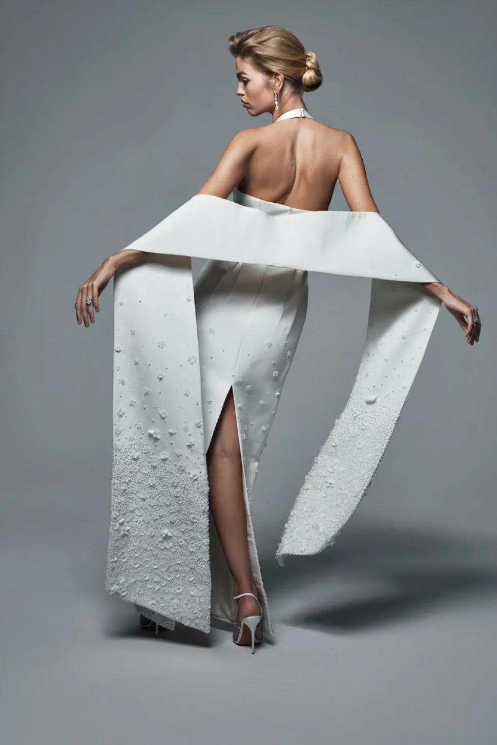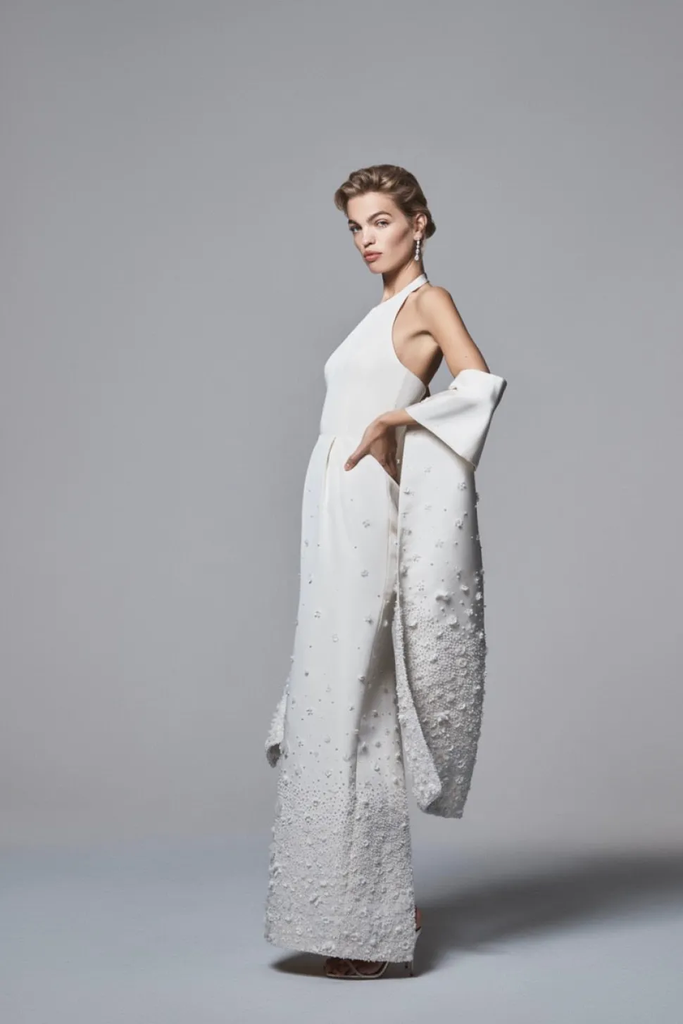 Born in India and raised in New York, where she eventually worked in finance, Natasha Das’s diverse background is at the essence of Danarys New York, a luxury womenswear label that asks its wearer to embrace their strength and fearlessness of their femininity. The Bianca Shawl dazzles with hand-embroidered pearls and fabric flowers. Crafted from luxurious silk faille, this shawl is meant to be paired along with the Olympia Gown.