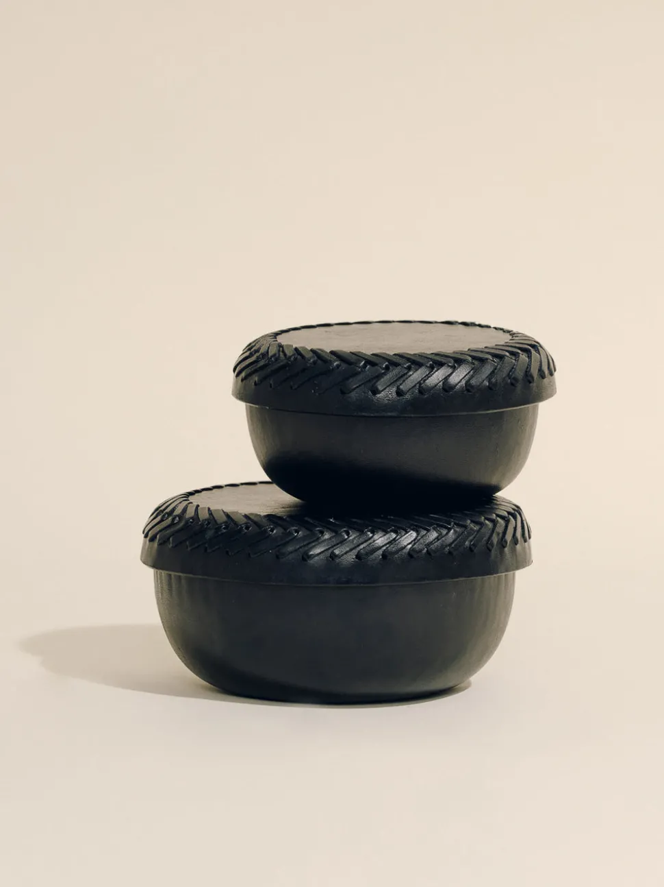 Every Hunting Season collection includes a selection of woven handbags crafted by female artisans in Colombia, furthering the brand’s mission to promote heritage craft to a luxury level while supporting the livelihoods of fellow creative women. The Box in Black Leather Lace Trim, Set of 2 is an heirloom-quality addition to any home decor collection. Crafted using a time-honored Colombian molding technique, each circular box is shaped into an organic, biomorphic silhouette and finished with smooth, buffed leather that recalls the look of Japanese lacquerware. Sold as a coordinating pair, the boxes can be styled together or separately, ideal for storing jewelry, keepsakes, or other treasures while adding a sculptural touch to your space.