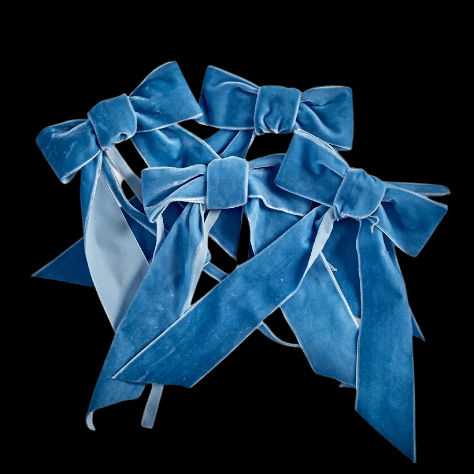 Set of 1 Matilda Tablecloth, 4 Peony White Placemats with Blue Embroidery, 4 Poppy White Napkins with Blue Embroidery, and 4 Blue Velvet Napkin Bows. Tablecloth: Linen/cotton blend.