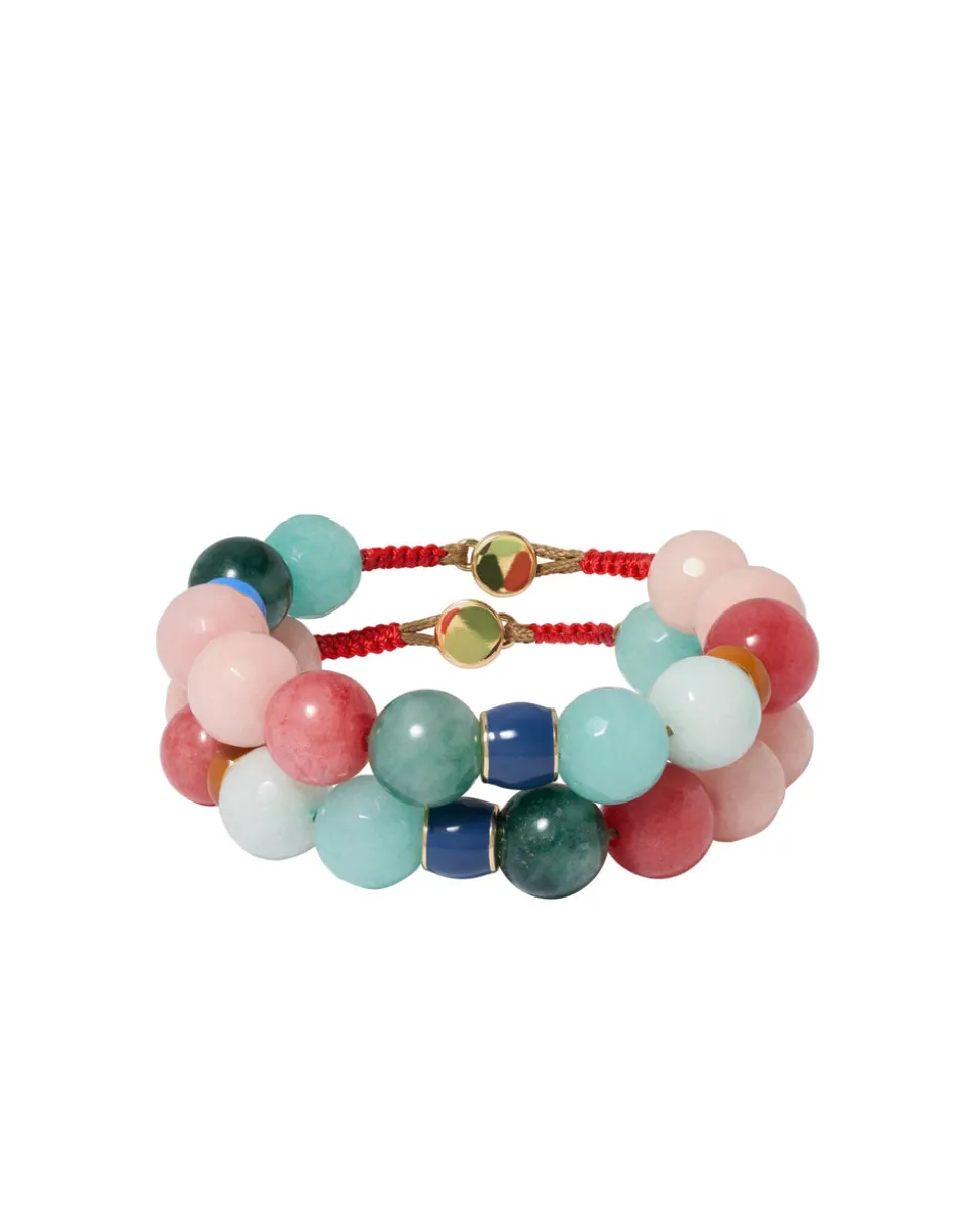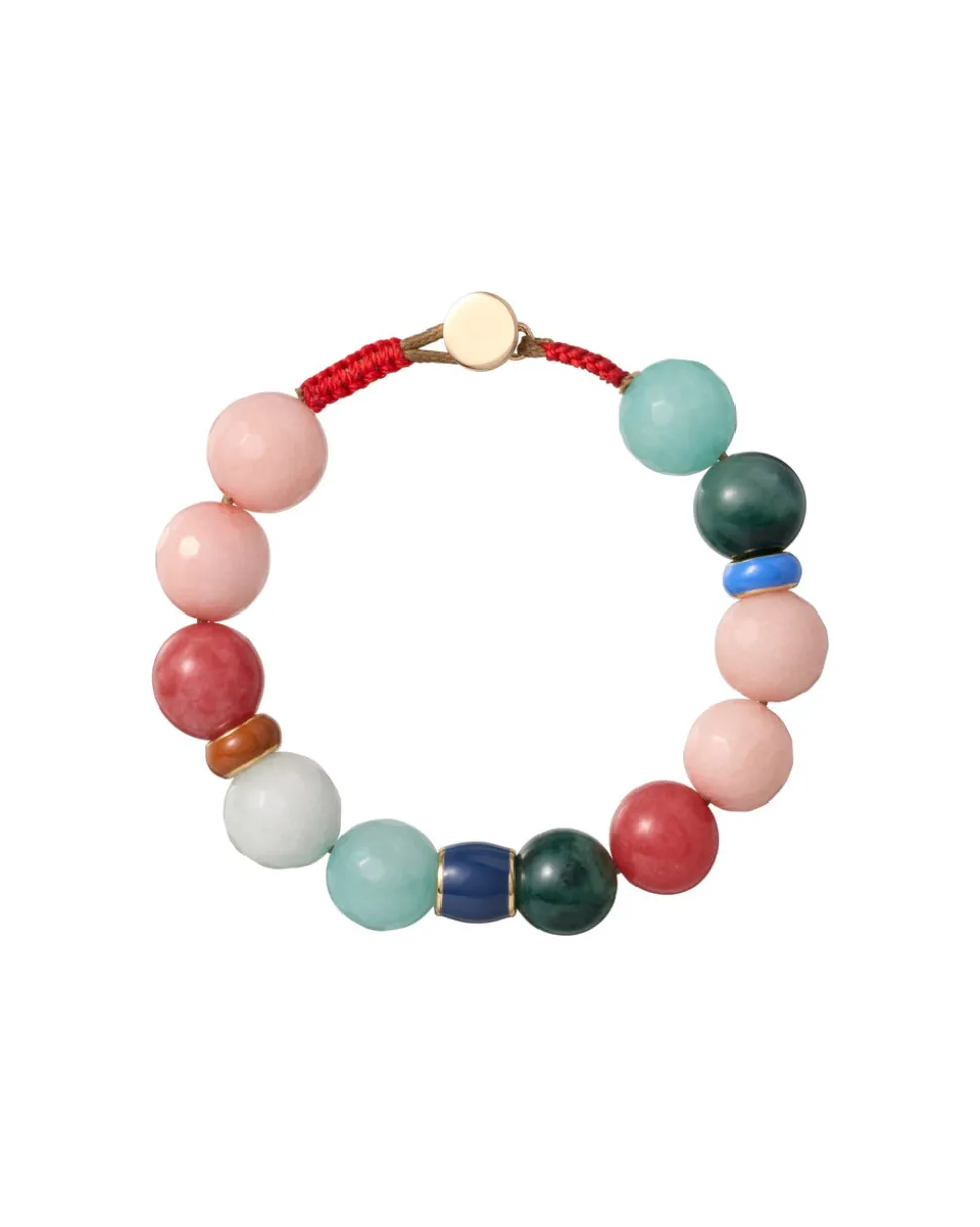 Mix of semi-precious beads and enamel rondelles. Button closure with macrame detail.