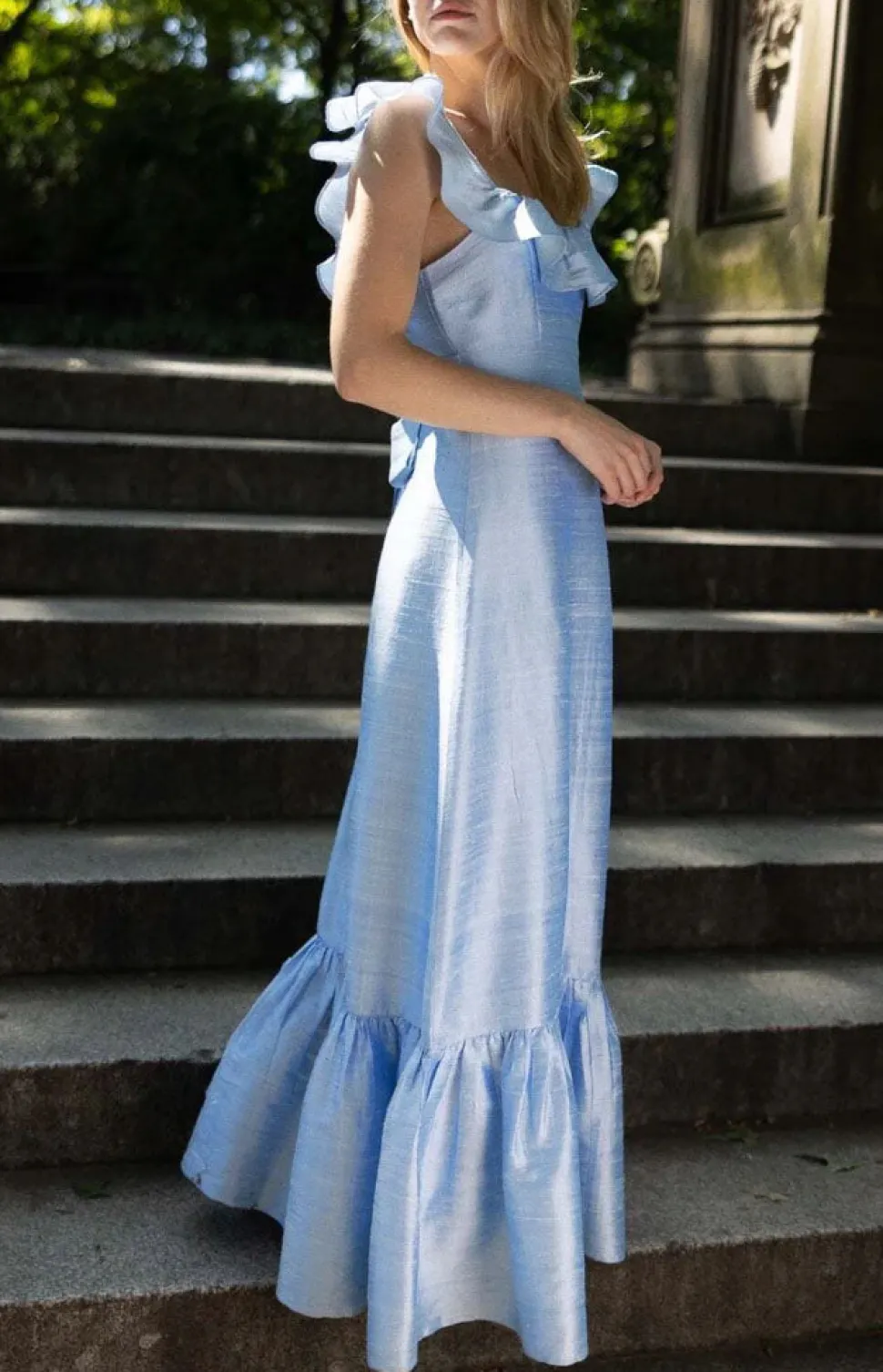 Louise New York creates its collection with the past and present in mind. Inspired by timeless glamour instead of trends, when you slip into a Louise New York dress, you carry all the confidence and carefree attitude that femininity can acclaim. The Camille Dress in Powder Blue sits at the natural waist with a bow tie back and has an elastic ruffle neckline that can be worn on or off the shoulders. From there, the Camille is finished with a ruffled hem for added flourish.