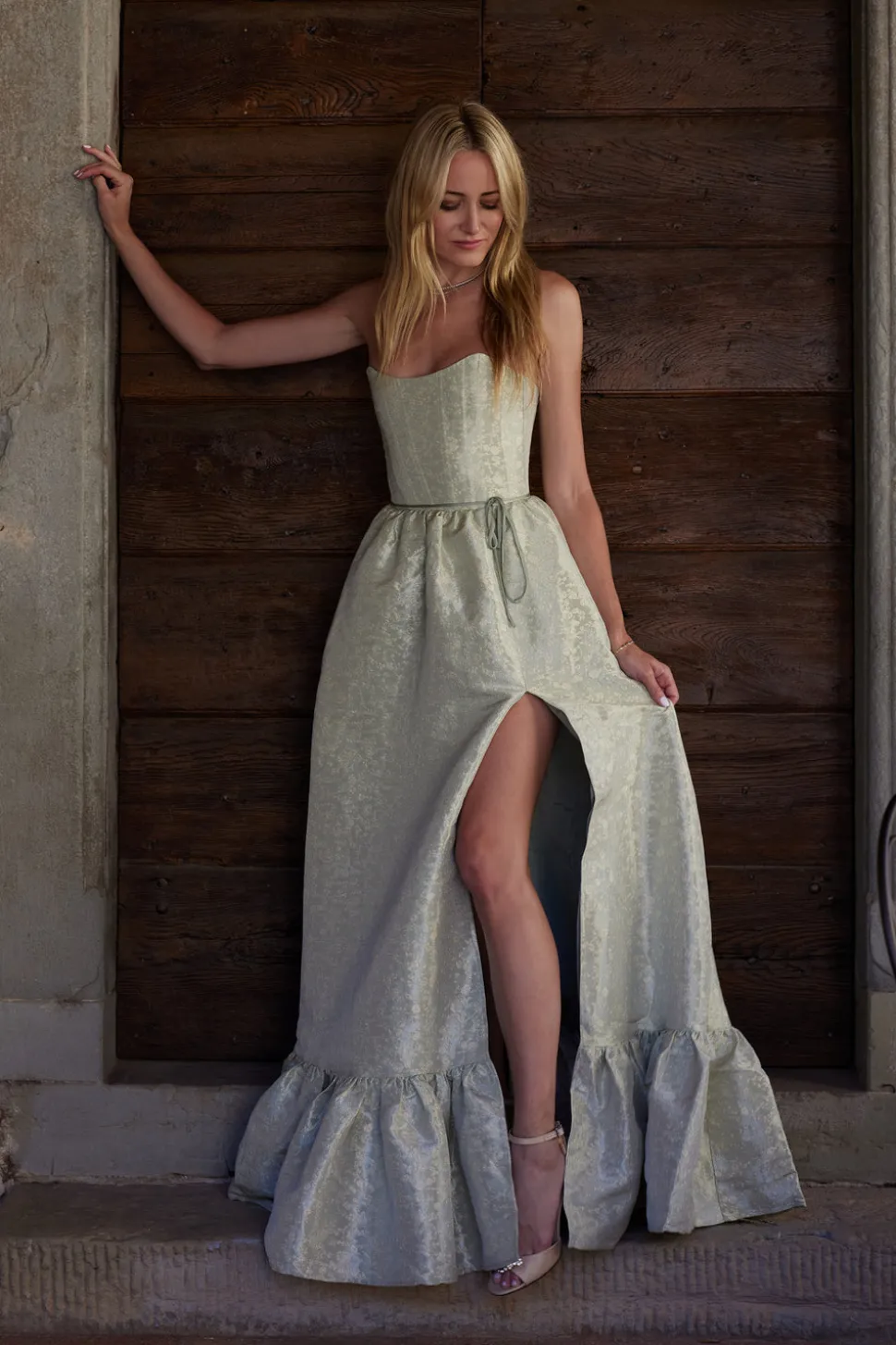 Named for her grandmother who taught her to sew, Victoria Salisbury founded V. Chapman to bring unique, structured, feminine clothing to a new generation of women. Based in Los Angeles, V. Chapman masterfully updates vintage silhouettes with a modern flair and contemporary touches. Crafted in duchess brocade, the Charlotte Dress in Sage Duchess is strapless perfection, with a flirty side-front slit, a gathered bottom, and a stunningly laced corset back.