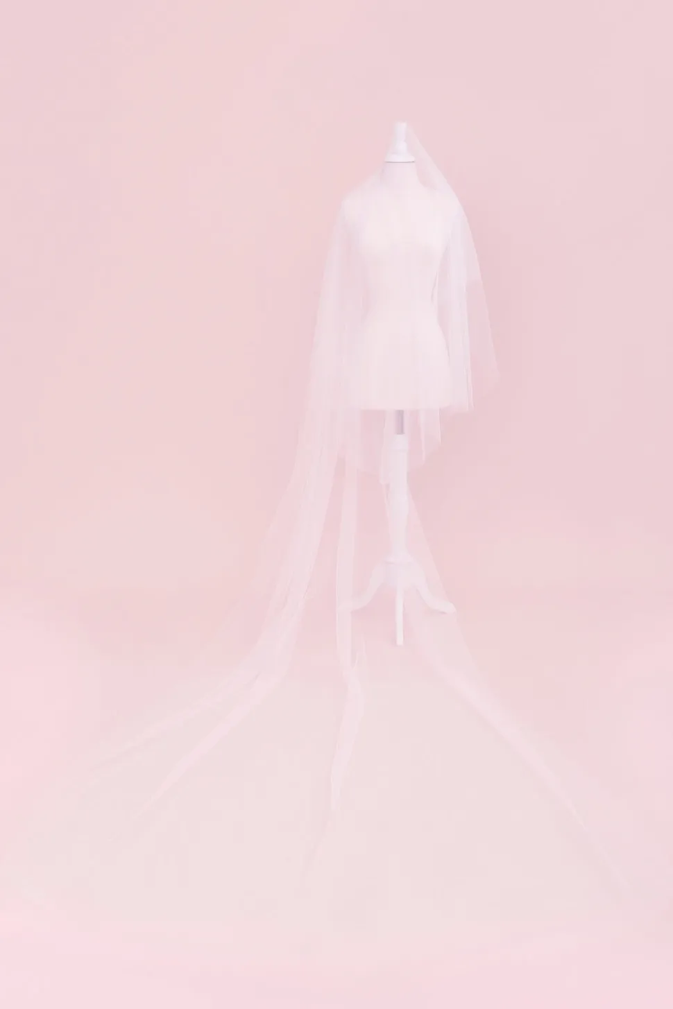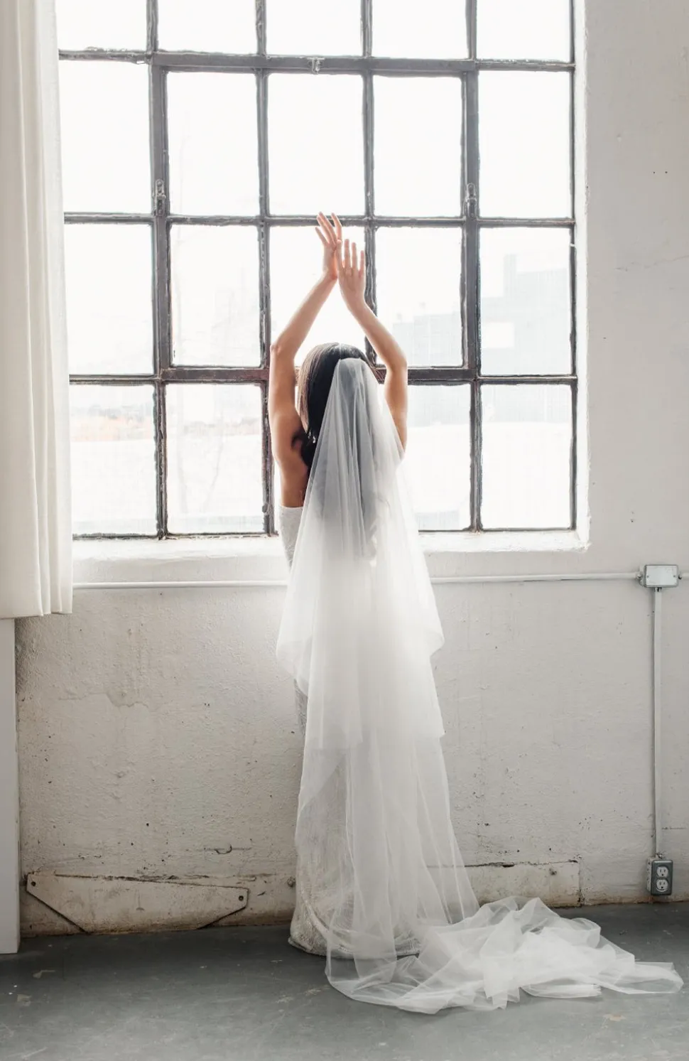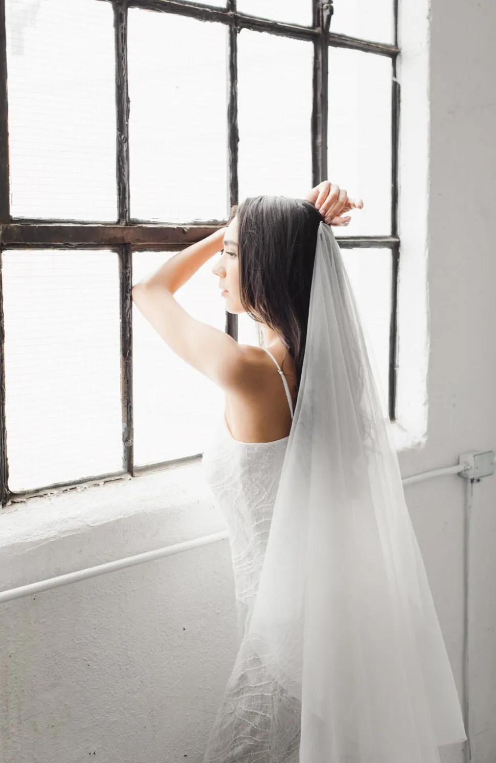 Weightless, ethereal, and utterly romantic. The Classic Silk Tulle Drop Wedding Veil features a 40″ blusher to softly drape over your face as you walk down the aisle. Secured with two invisible combs, this drop veil lays flush on your head as if it was floating. The ultimate accessory for soft minimalism and perfectly balanced drama.