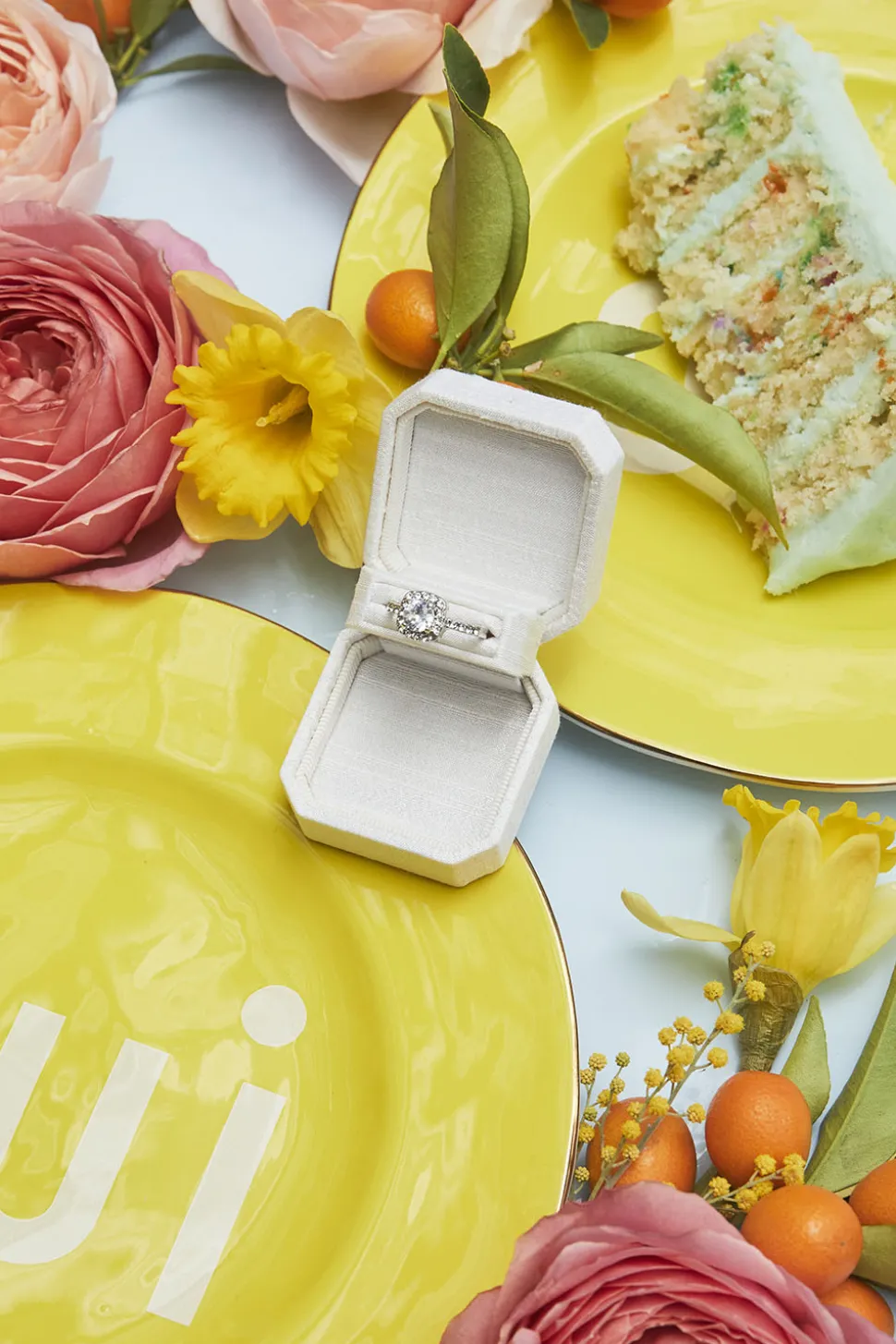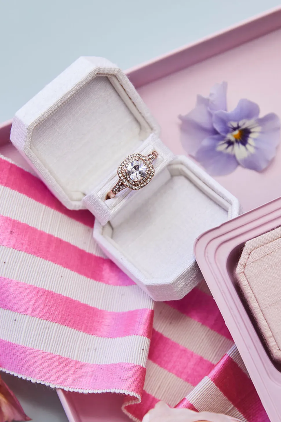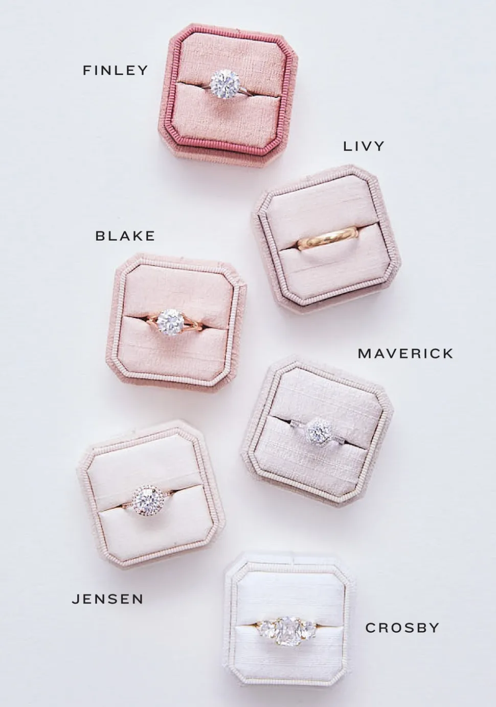 The Mrs. Box creates elegant, colorful, and limited edition velvet heirloom ring boxes. These vintage-inspired designs make wonderful engagement and wedding gifts, personalized with custom monograms. The Crosby Proposal is individually handmade using what the brand considers to be the world’s most extraordinary velvet. Featuring custom colors made exclusively for The Mrs. Box, these new boxes are so exquisite they truly sparkle in person, reflecting light in the most glorious way possible. The first ever viral proposal box, made to fit in a pocket discretely without giving away the big reveal. The small 1-inch width allows you to put the ring in your pocket without it sticking out. Make your proposal that much more special with a custom engraved proposal box to get down on one knee with.