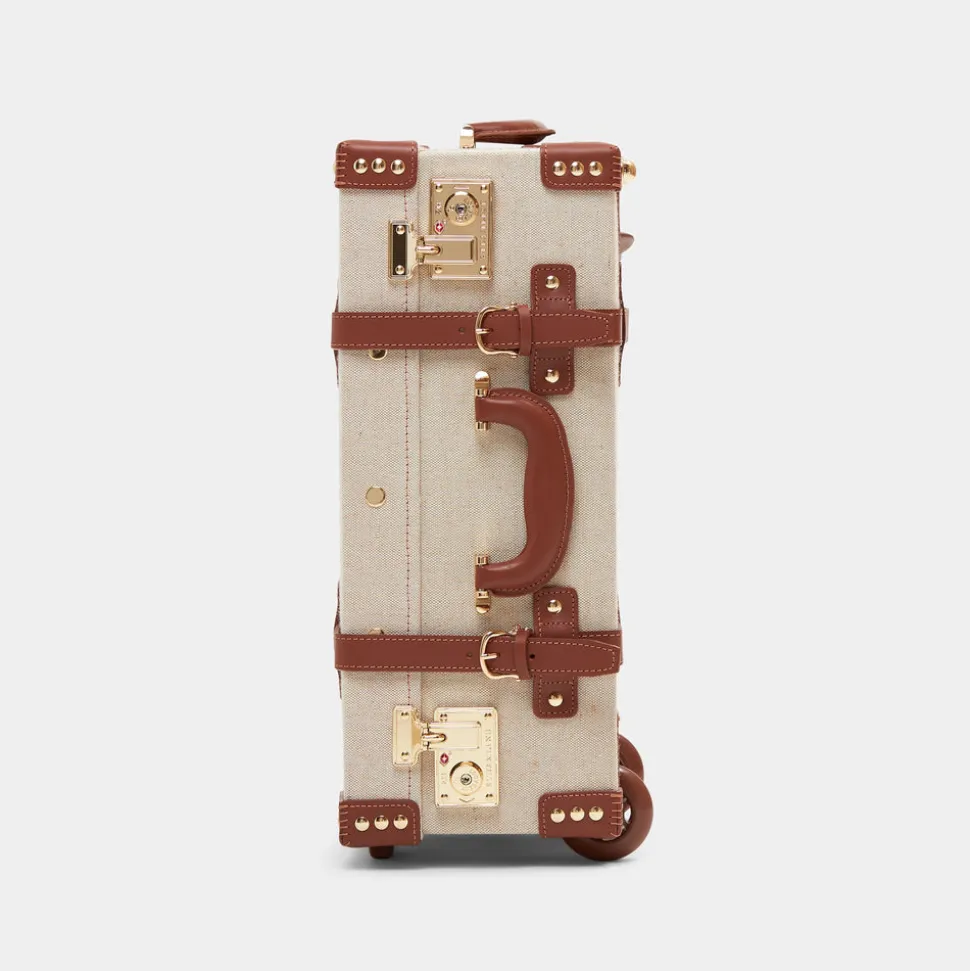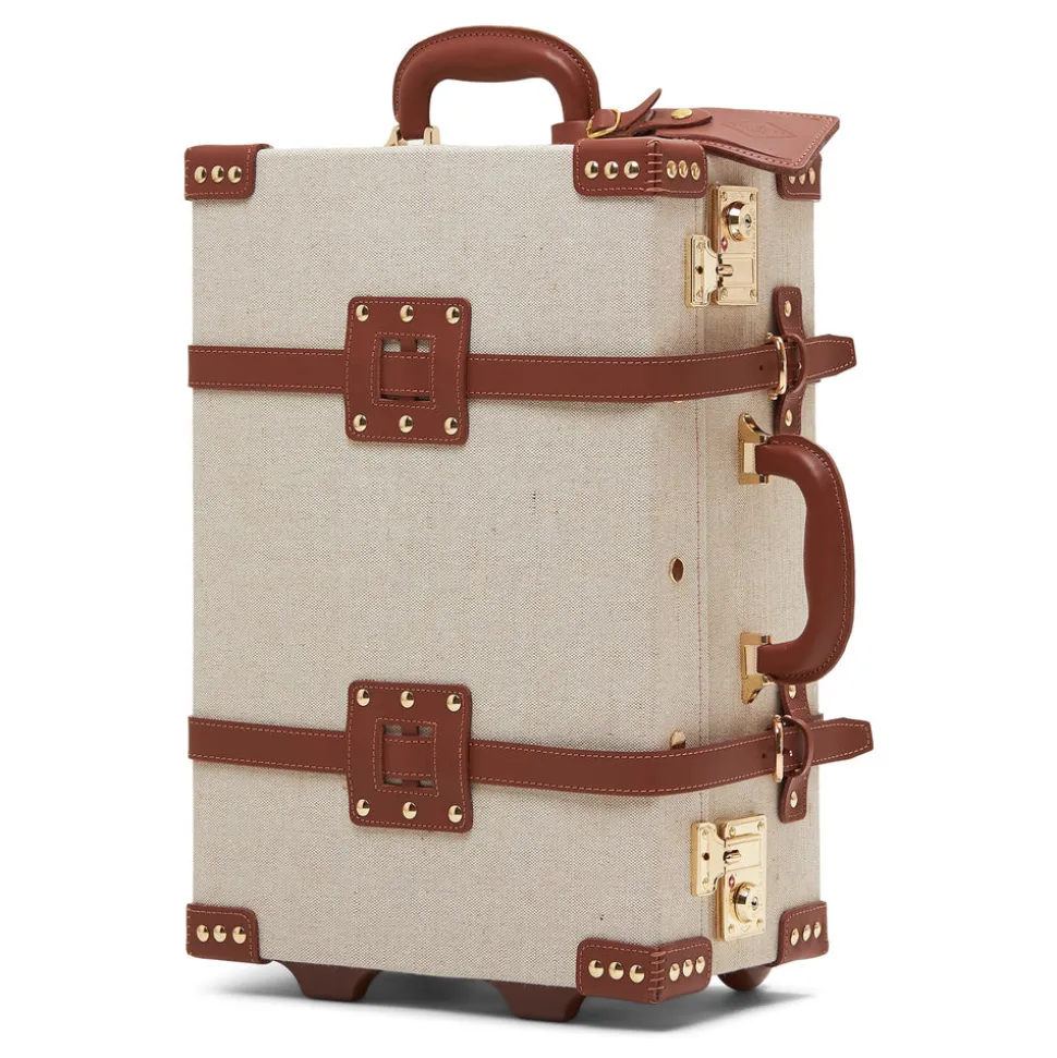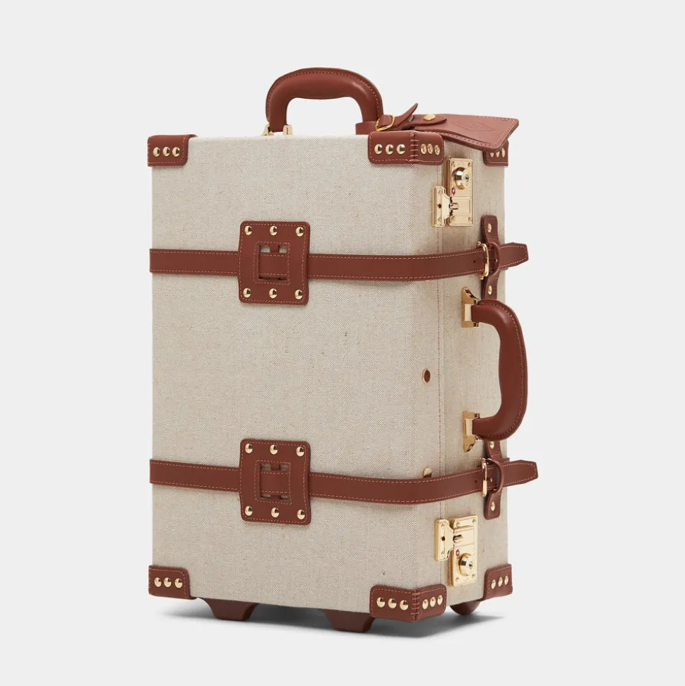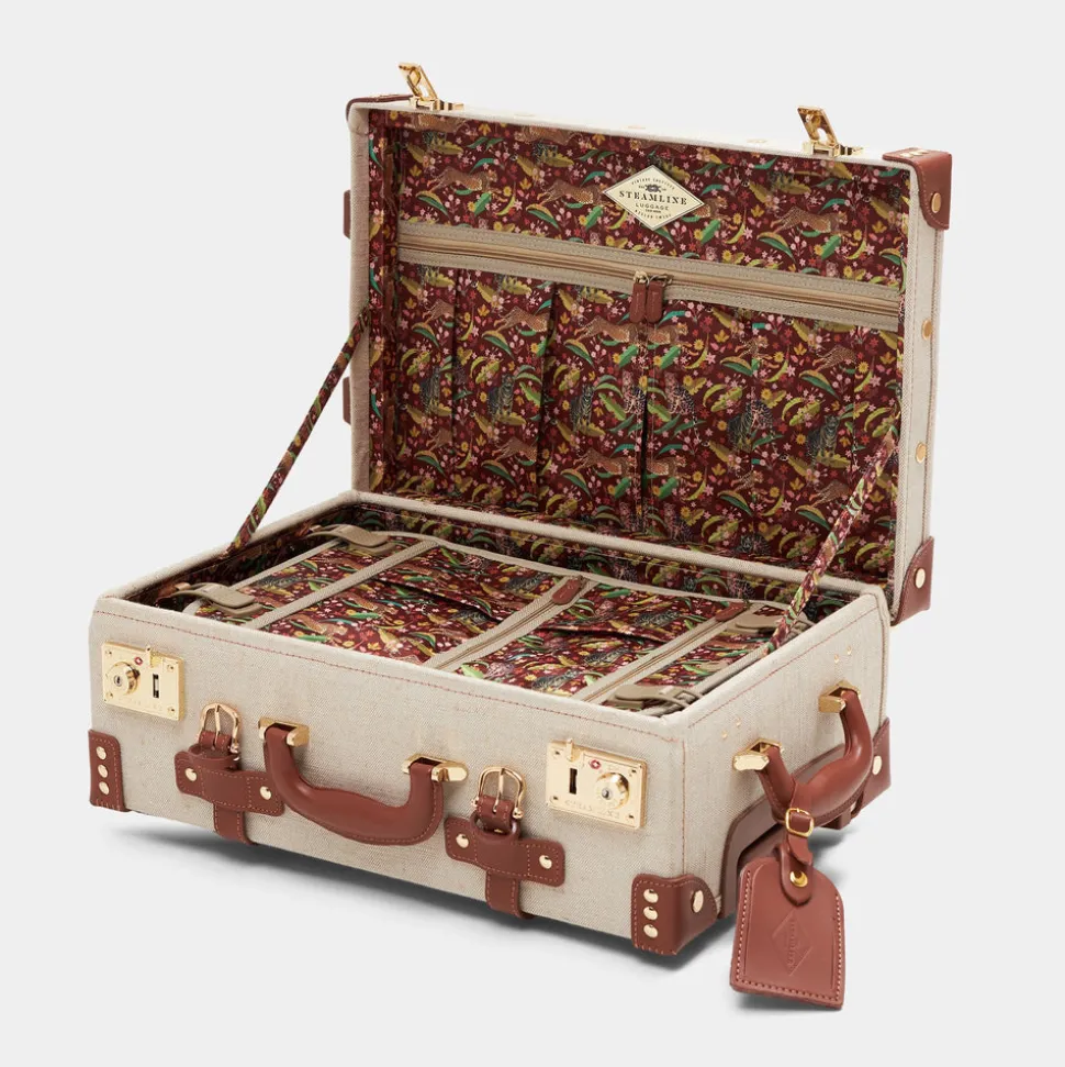 Meet the Editor Carryon. The ivory-colored body is accented with brown leather straps and opens to reveal Louis Barthelemy’s hand-painted brown cheetah print. This vintage-style cabin-size luggage boasts the modern amenities of an extendable trolley handle, buckled leather straps, two TSA-approved locks, and two silent-glide wheels for elegant mobility. The interior zippered lid pockets and detachable door-hangar washbag keep the packed contents organized, while the included ripstop cover ensures gentle stowage should you need to check in your Carryon. SteamLine Carryons meet the cabin size requirements on all major airlines. When not in transit, your Editor Carryon makes for stunning home storage and decor.
