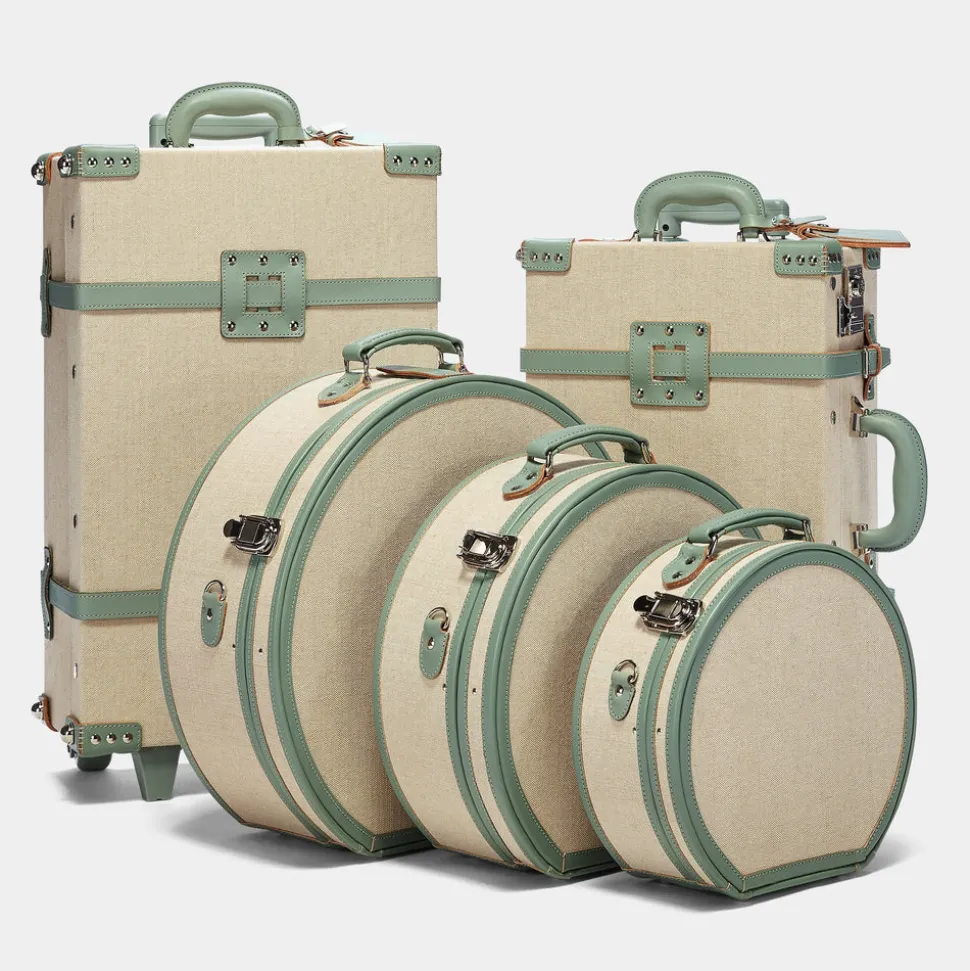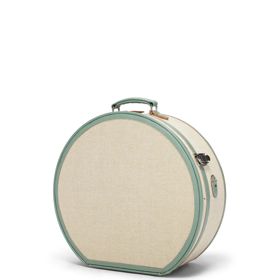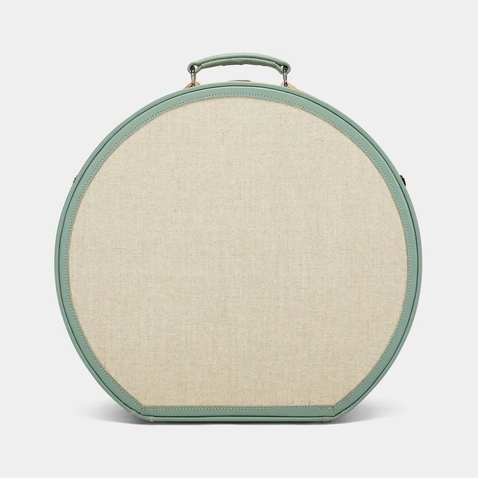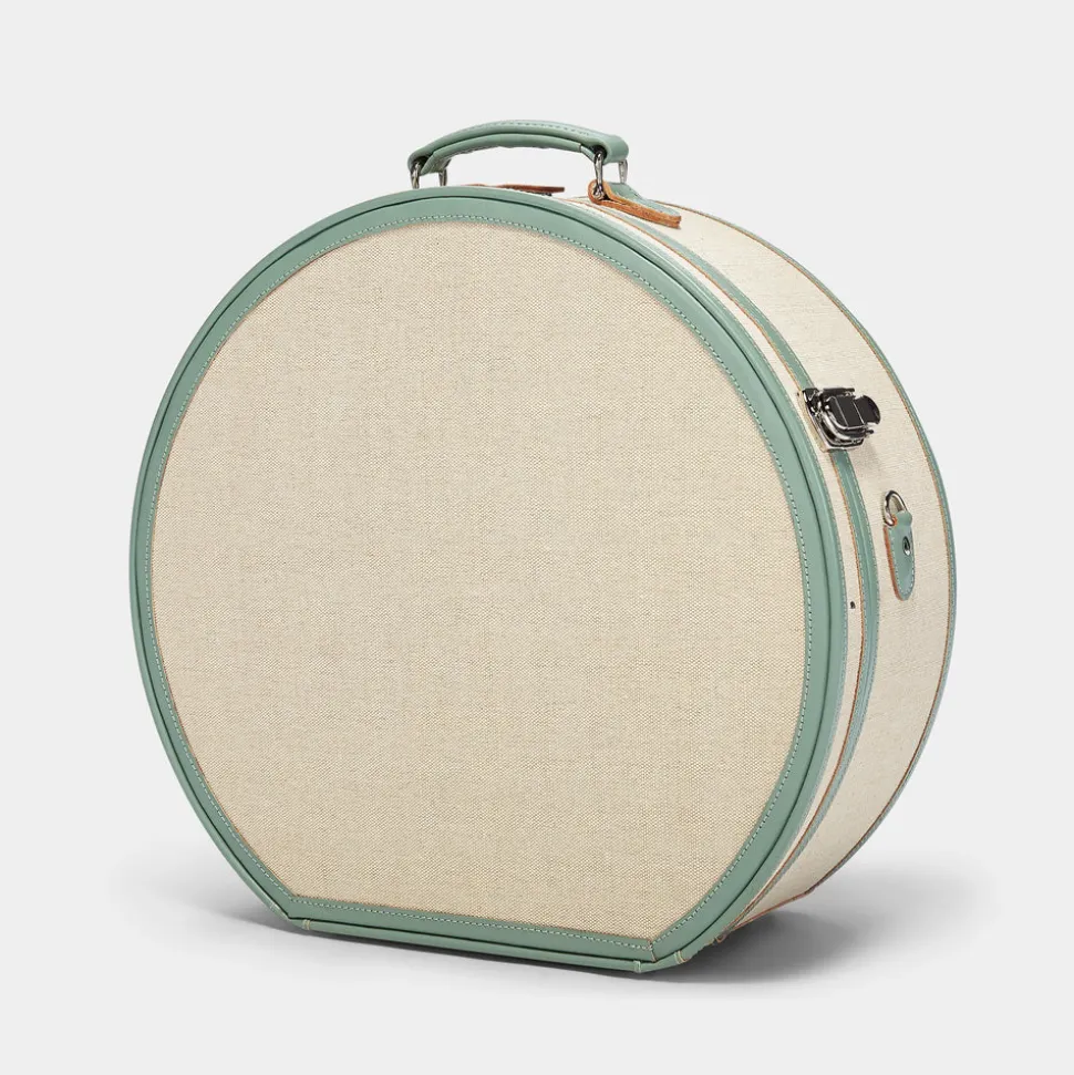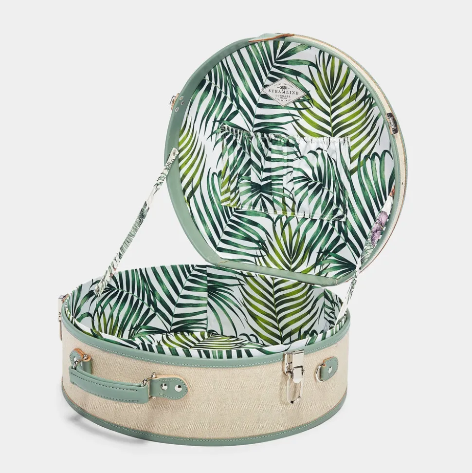 The Editor Hatbox features a quintessentially nostalgic design. The hatbox is not only the chicest way to protect your hats but also an impossibly charming caddy for your favorite things. The sleek ivory body is accented with silver latches and sea-green straps that open to reveal Eoin Dillon and Meryl Pardoen’s hand-painted palm-leaf print with an elasticated pocket. When not in transit, your Editor Hatbox makes for stunning home storage and decor.