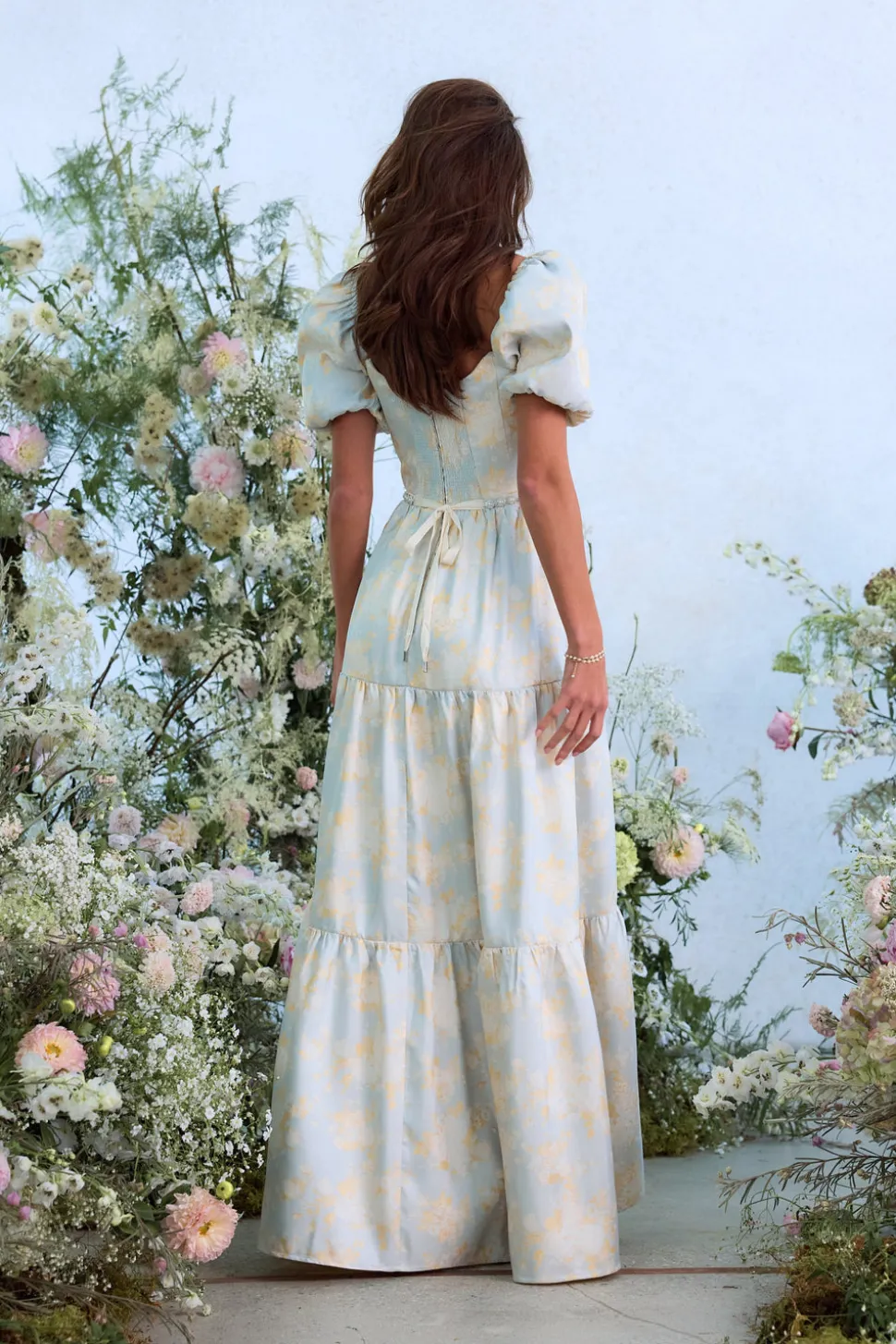 Named for her grandmother, who taught her to sew, Victoria Salisbury founded V. Chapman to bring unique, structured, feminine clothing to a new generation of women. Based in Los Angeles, V. Chapman masterfully updates vintage silhouettes with a modern flair, and contemporary touches. The Emma Dress in Sky Windsor Brocade is a full-length gown featuring a stunning cutout bodice, high-low hem, and embellished with ornate pearl and crystal beaded trim. Fall in love with sweet poof sleeves, side pockets, ruched back panel and zipper closure, and gorgeously gathered tiers. Made from beautiful Sky Windsor Brocade linen, which flaunts light pink florals on a light blue background, this dress is truly a dream.