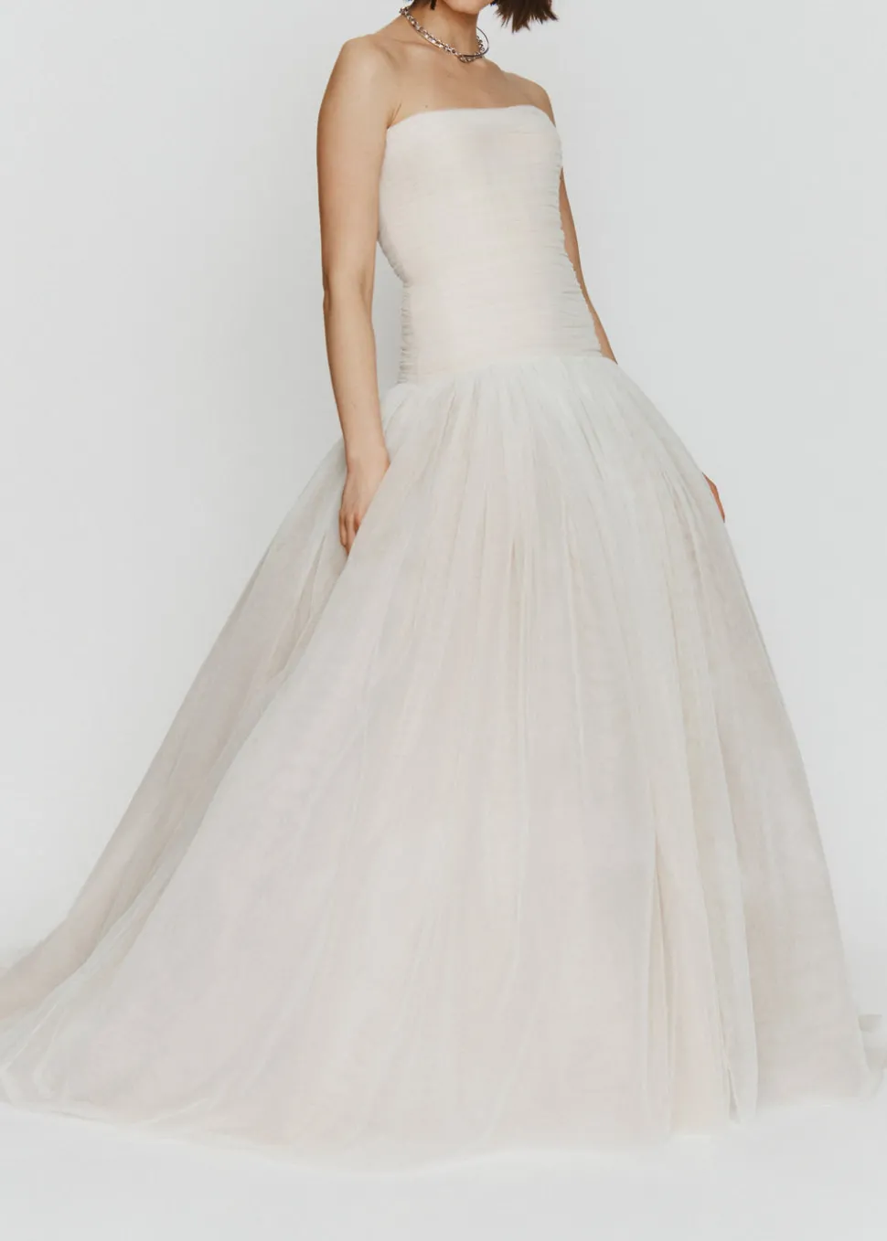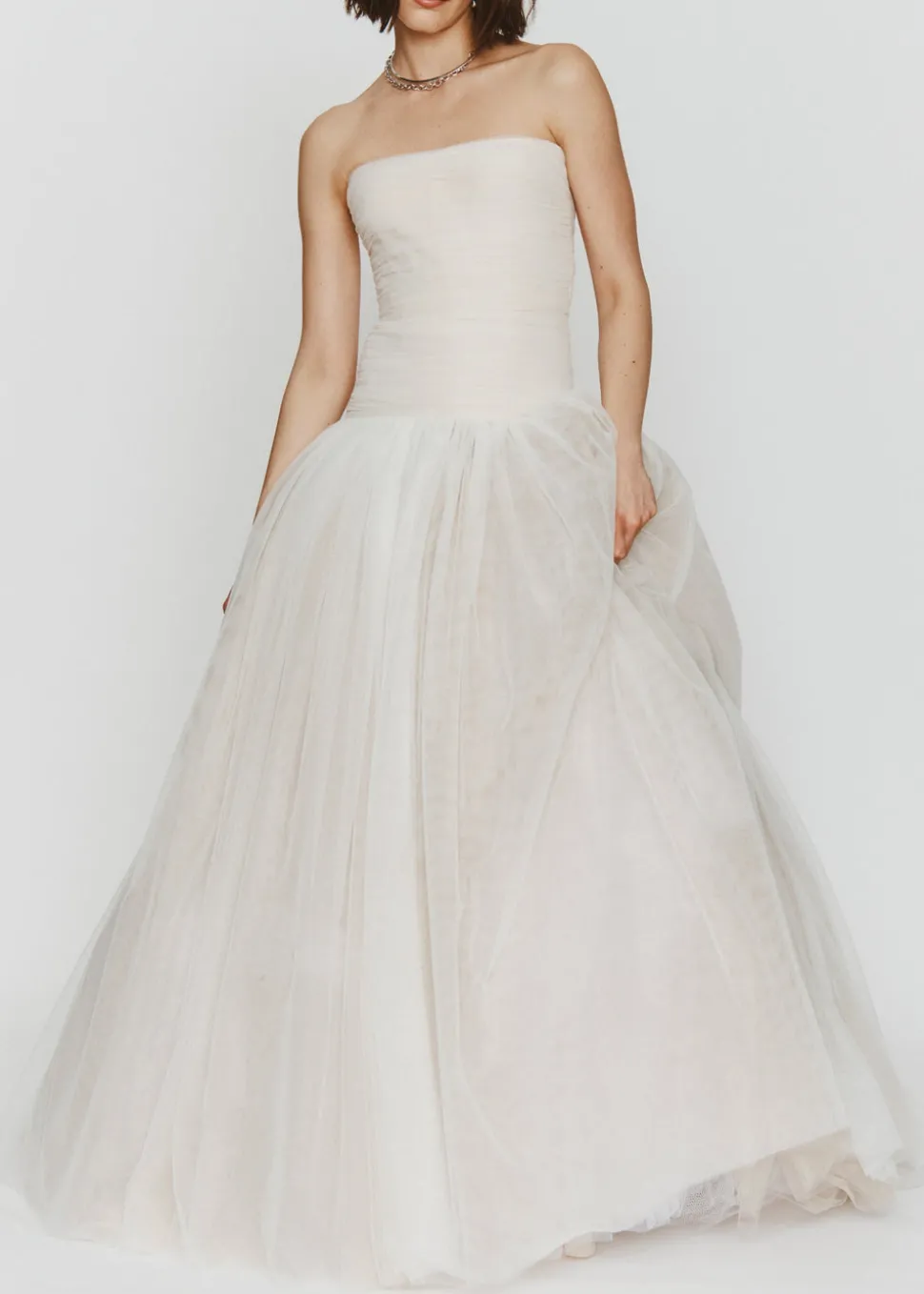 After honing her design vision and couture experience at Zac Posen, Narciso Rodriguez, and Chanel, Meredith Stoecklein emerges on her own with LEIN. The brand offers a new concept of tasteful, stylish wedding wear for the thoroughly modern bride. Cut exactly to your measurements and silhouette, The Emma boasts french tulle, a corseted bustier, and detachable sleeves for a customized look.