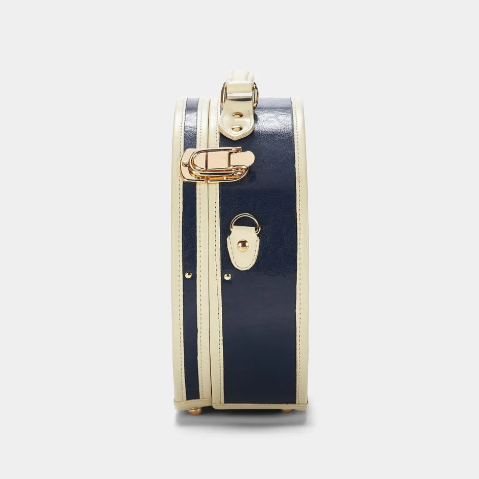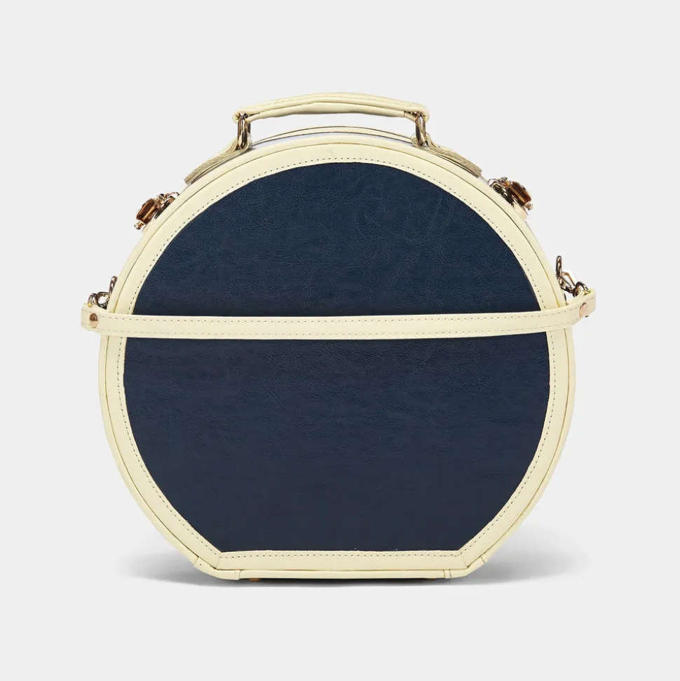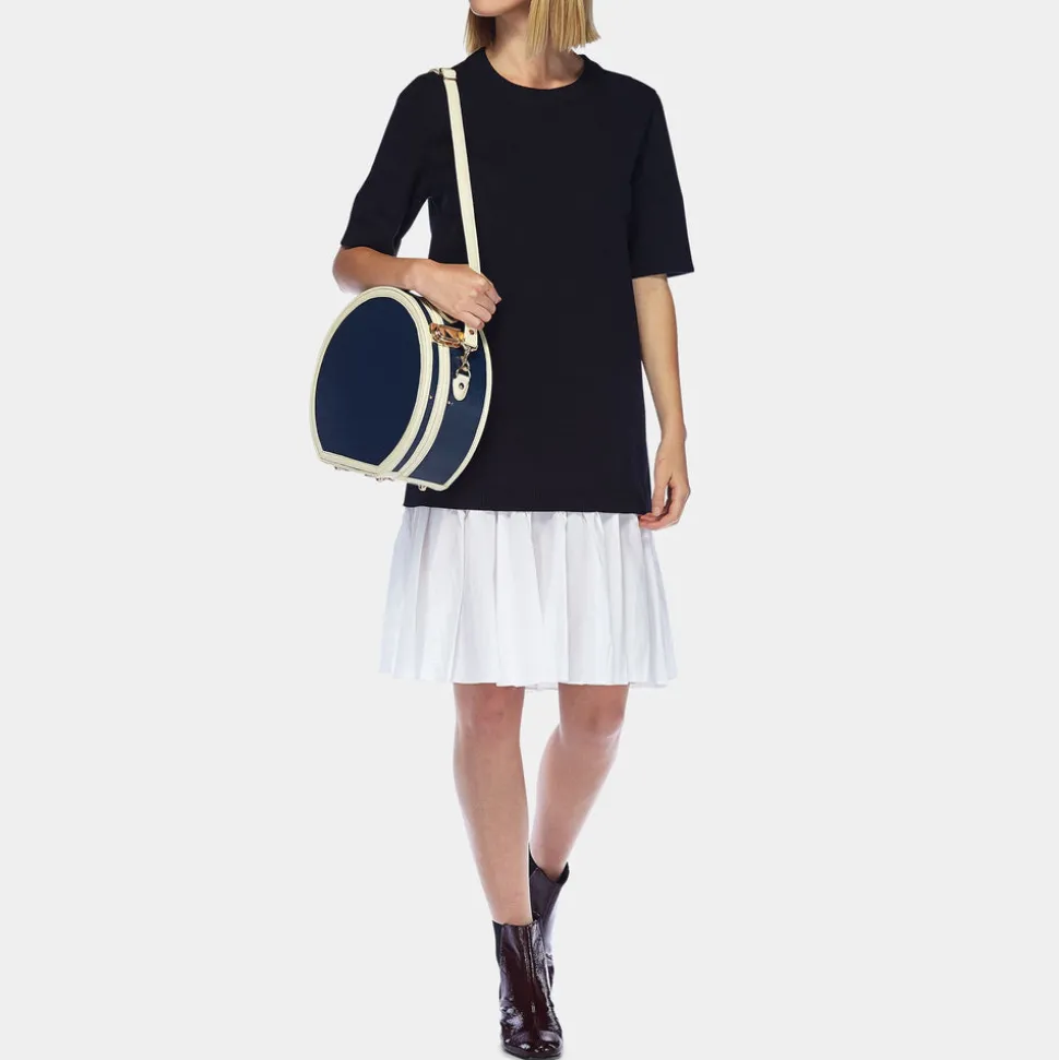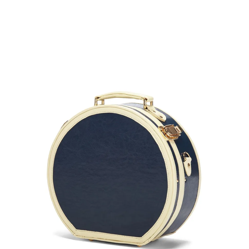 Meet the all-new Entrepreneur Hatbox. This vegan-leather hatbox luggage is the chicest way to take your hat off your hands and an impossibly charming caddy for your favorite things. Vintage-inspired, the elegant navy body is complemented by white trims and finished with gold latches that open to reveal the inner striped fabric lining with an elasticated pocket to secure small items. Indulge in traveling with your best hats knowing they will arrive in perfect form.