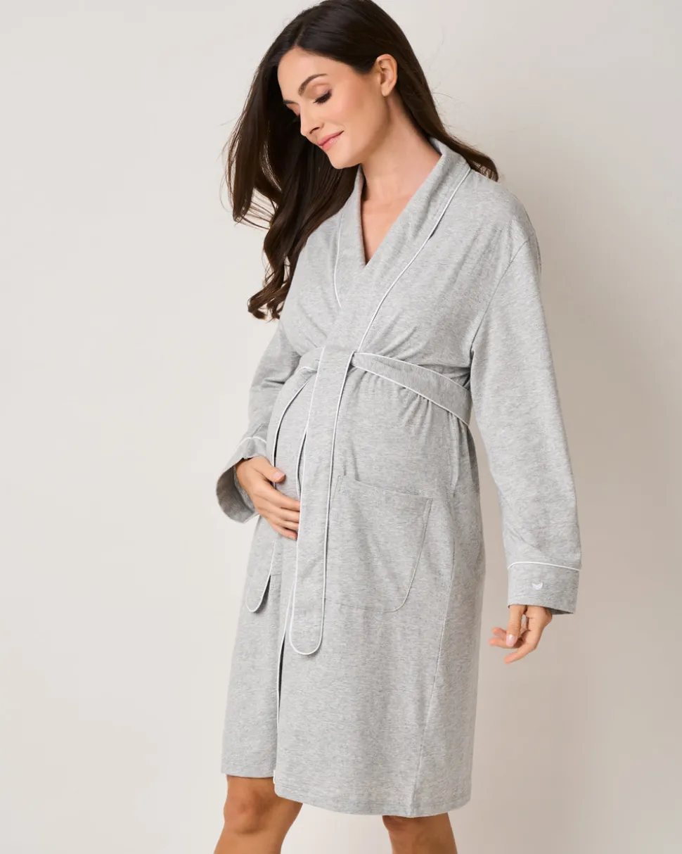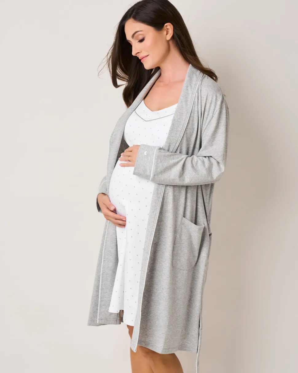 Petite Plume wishes you a “bonne nuit,” and in their luxury sleepwear, it’s hard not to oblige. Crafted from the softest 100% Pima Cotton with a gentle stretch, the Essential Maternity Set in Light Heather Grey & Grey Stars includes two key pieces—the signature robe and nightgown—that will make your pregnancy journey exponentially more luxurious. This comes in a gift box for a beautiful gift presentation.
