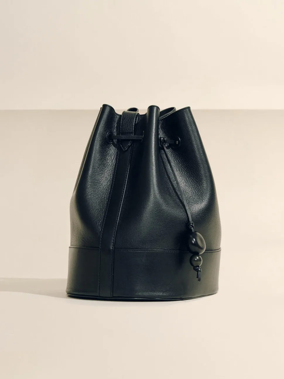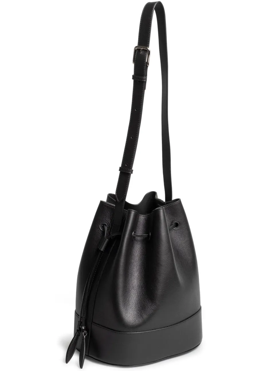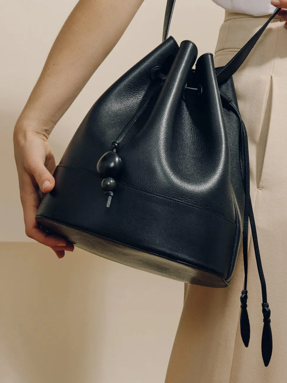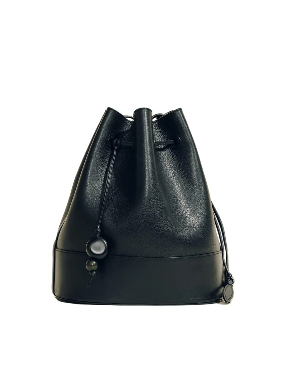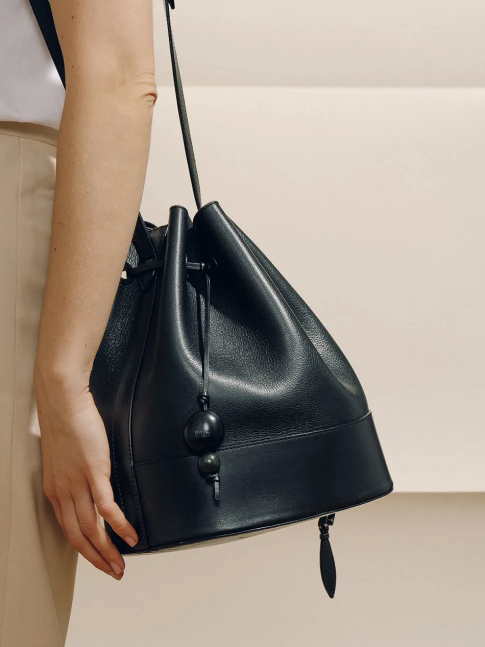 Nappa leather exterior. Adjustable shoulder strap. Custom drawstring closure. Fully lined interior. Signature tagua seed charm. Made in Spain.