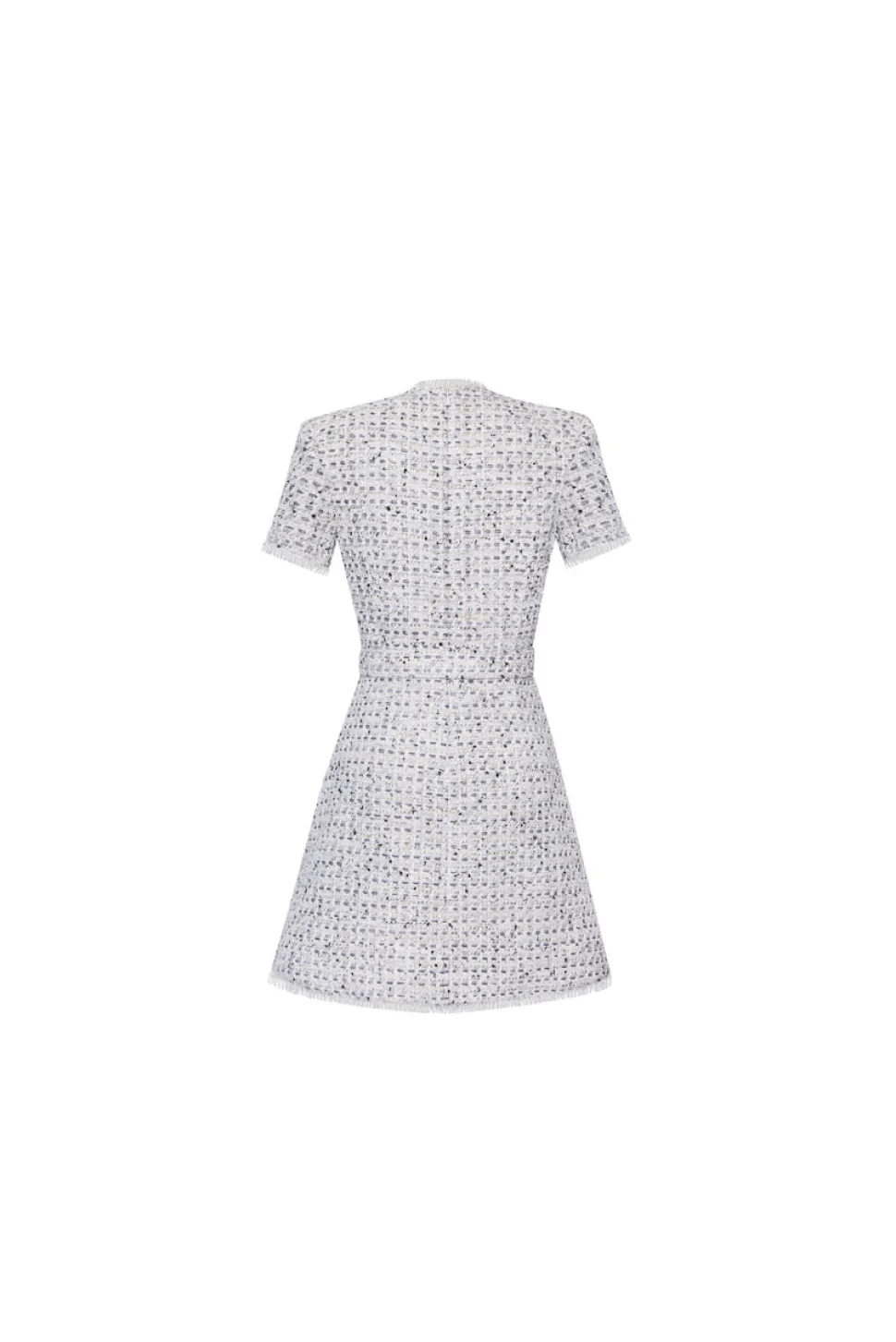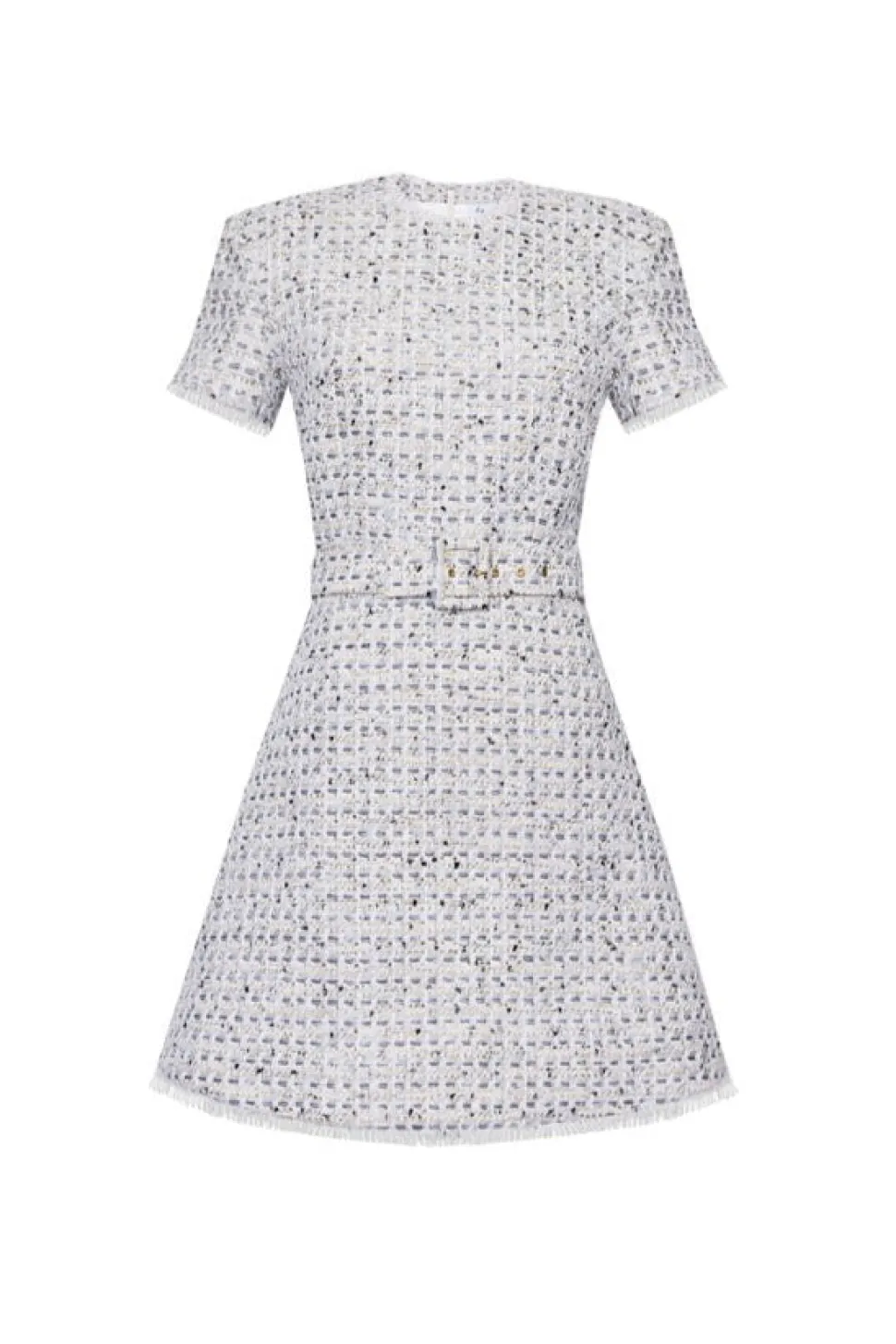 Born in India and raised in New York, where she eventually worked in finance, Natasha Das’s diverse background is at the essence of Danarys New York, a luxury womenswear label that asks its wearer to embrace their strength and fearlessness of their femininity. The Fritz Dress in Grey is crafted from elegant gray tweed, featuring a matching belt that adds a refined touch to its design. Fully lined in 100% silk charmeuse, it ensures a smooth and comfortable fit, with discreet side pockets for added practicality. The frayed edges throughout lend a modern, textured detail to this timeless piece.