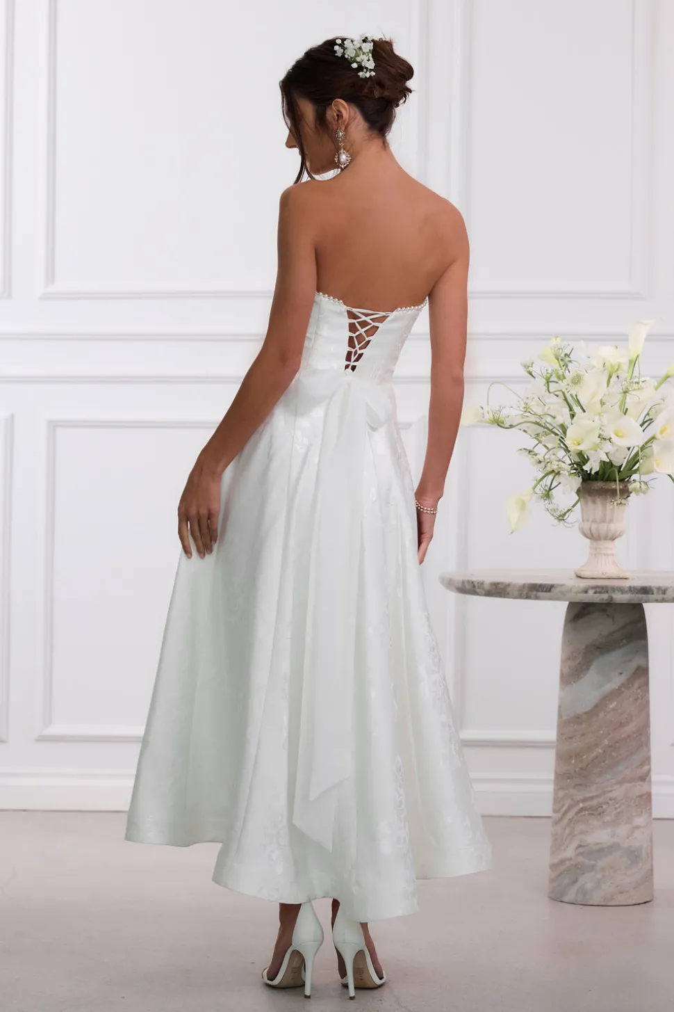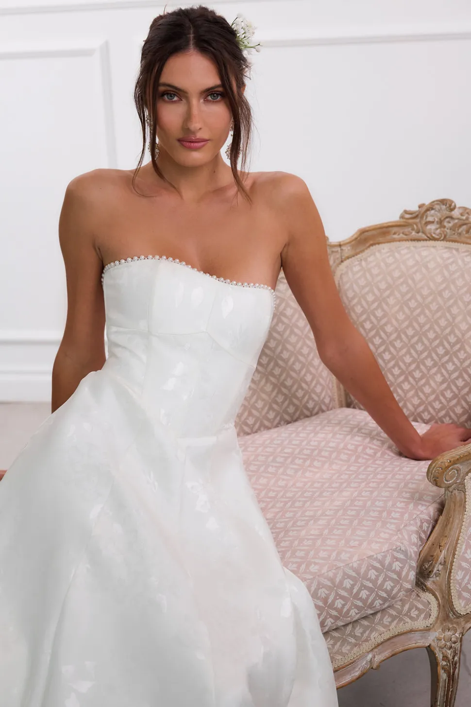 Named for her grandmother, who taught her to sew, Victoria Salisbury founded V. Chapman to bring unique, structured, feminine clothing to a new generation of women. Based in Los Angeles, V. Chapman masterfully updates vintage silhouettes with a modern flair, and contemporary touches. The Hazel Dress in White Baroque Floral is a strapless midi-length dress featuring a delicate pearl trim. It flaunts a corset bodice and a beautiful bow detail in the back. Made from White Baroque Floral brocade, which features white florals on a white background, this dress is the go-to choice for any occasion.