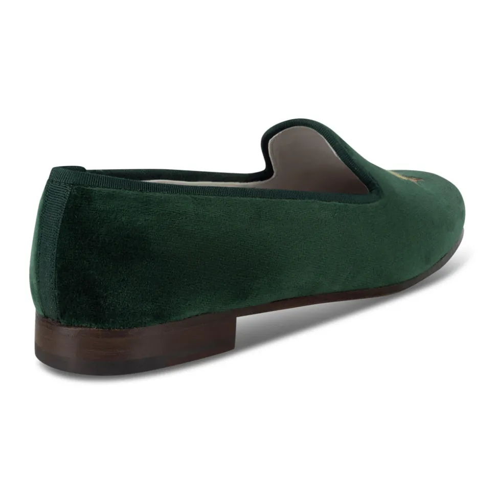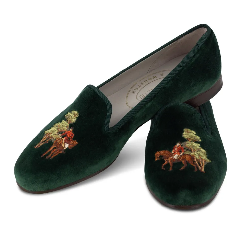 Founded in Palm Beach, Florida, Stubbs & Wootton has perfected the art of creating elevated, handmade women’s, men’s, and children’s shoes. Known for their exquisite needlepoint and embroidery, their slippers feature all-over patterns and intricate accents. The Hunt Evergreen Velvet Slipper is made from luxurious cotton velvet and trimmed with tonal silk cotton grosgrain. Its embroidery depicts a classic foxhunting scene with riders in traditional red coats, celebrating the heritage and tradition of the sport.