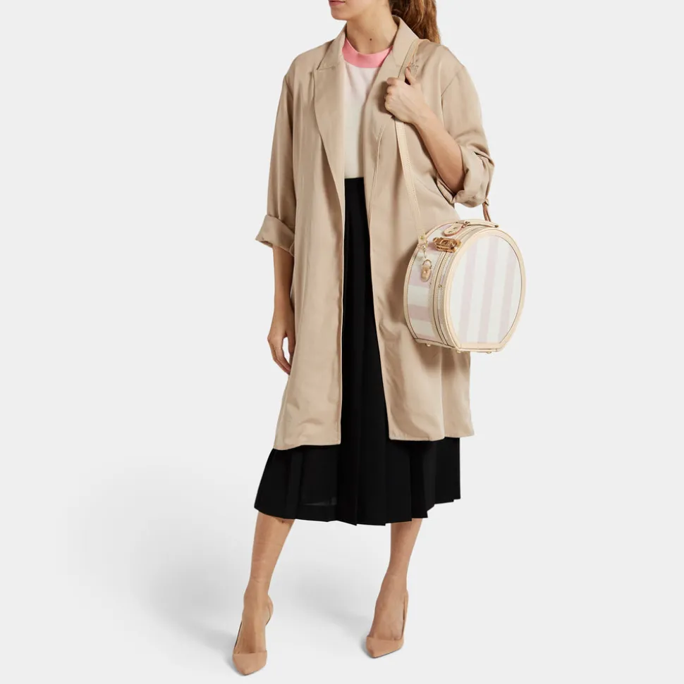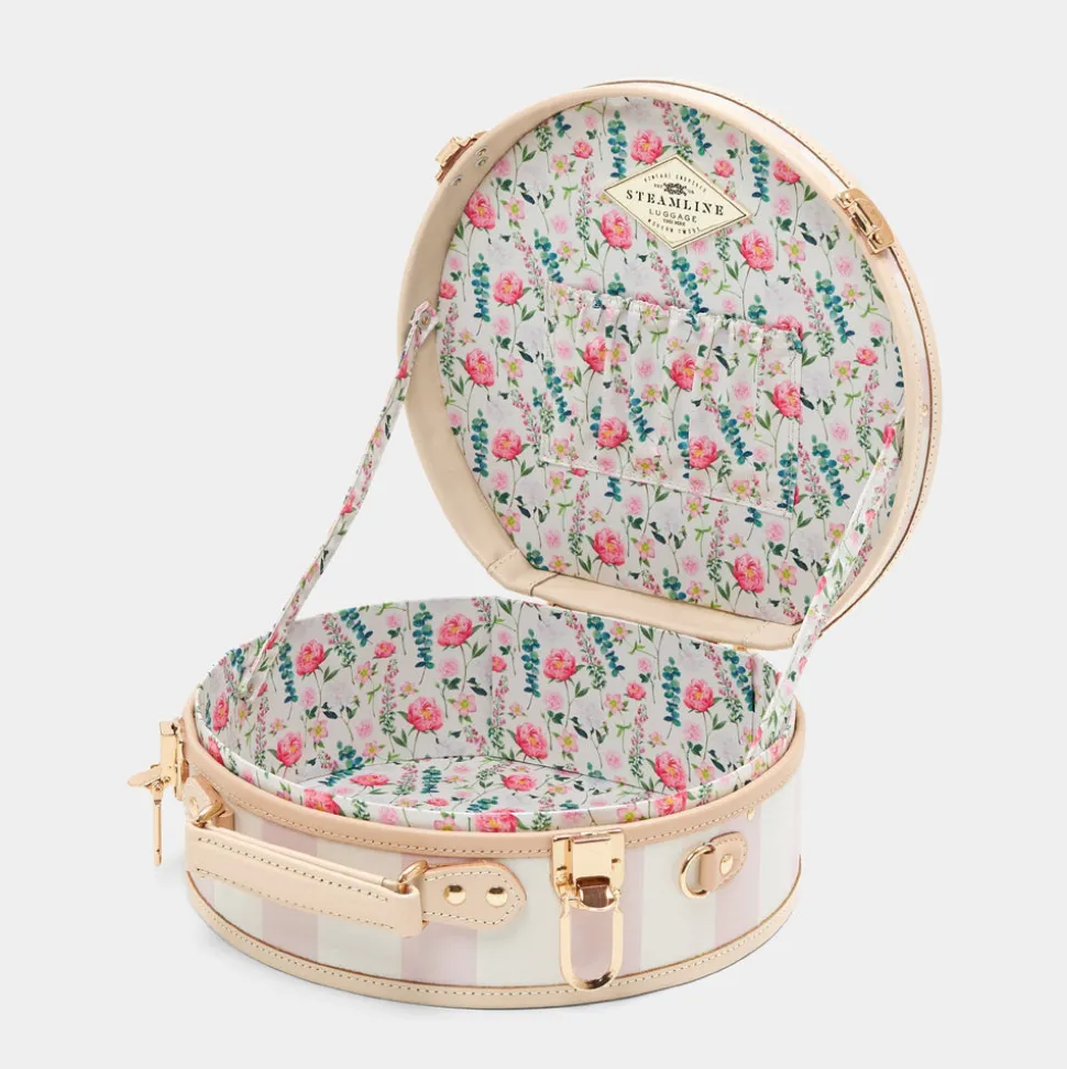 SteamLine Luggage brings glamor back to travel. Founded in 2005 by Sarah Banks, each piece of luggage honors the craftsmanship, beauty and style of suitcases from an era long since passed. Each SteamLine case is built for ease of movement, security and durability, while crafted in eye-catching colors and stunning interiors. An ideal way to protect your favorite items, the Illustrator Small Pink Hatbox‘s striped rose body opens up to reveal an interior lining with a print of wildflowers illustrated by Lauren Taylor. Featuring tan leather handles, corners, straps, as well as gold hardware details, a caddy fit for a queen.