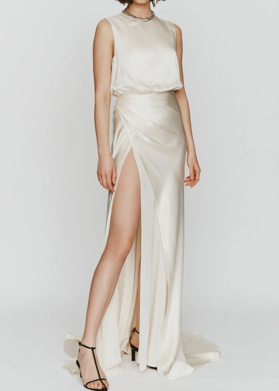 After honing her design vision and couture experience at Zac Posen, Narciso Rodriguez, and Chanel, Meredith Stoecklein emerges on her own with LEIN. The brand offers a new concept of tasteful, stylish wedding wear for the thoroughly modern bride. The Ines Dress boasts a high slit and a high neckline alike.