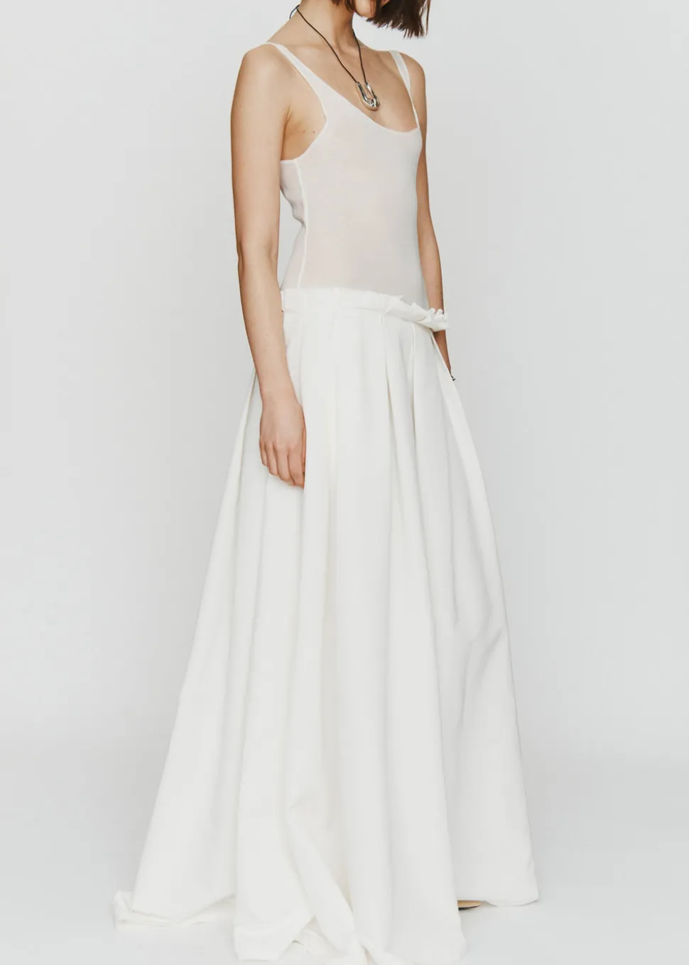 After honing her design vision and couture experience at Zac Posen, Narciso Rodriguez, and Chanel, Meredith Stoecklein emerges on her own with LEIN. The brand offers a new concept of tasteful, stylish wedding wear for the thoroughly modern bride. Cut exactly to your measurements, The Jennifer boasts a layered chiffon tank and silk faille skirt.
