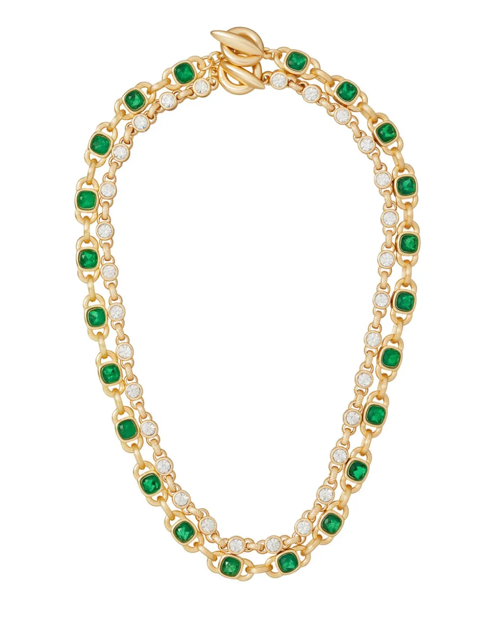 Gold tone link necklace with pavé detail. Gold tone chain necklace with emerald glass stones. Toggle bar closure.