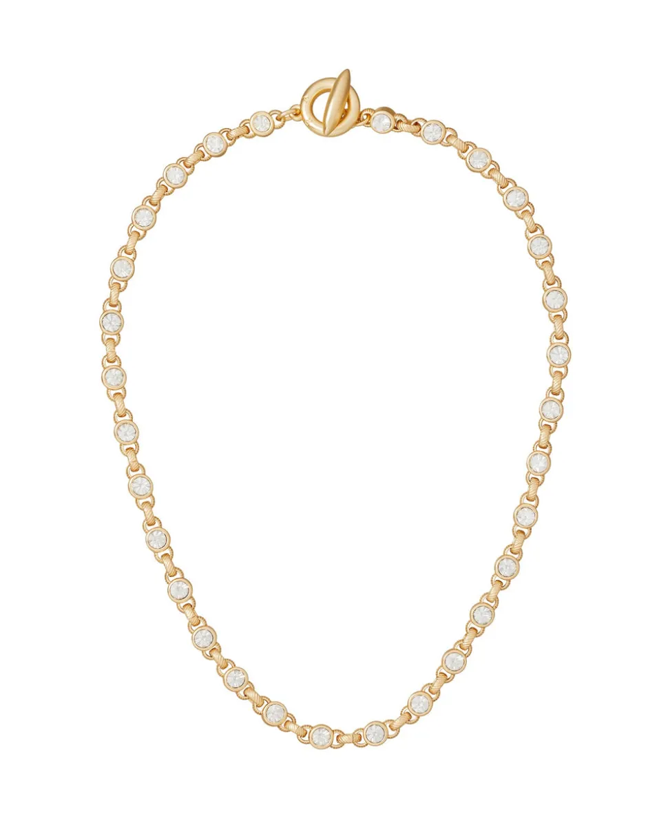 Whimsical, colorful, and crafted with tone-perfect details, Roxanne Assoulin’s four decades of experience—designing for the likes of Marc Jacobs and Oscar de la Renta—are expressed in every piece of her candy-inspired collection of bracelets, chokers, earrings, and more. As the brand likes to say, and as every “it” girl knows, it’s jewelry that makes you smile. The Jeweled Link Necklace Set layers a gold tone link necklace with pavé detail and a gold tone chain necklace set with emerald glass stones, both finished with a toggle bar closure for easy on-and-off styling.