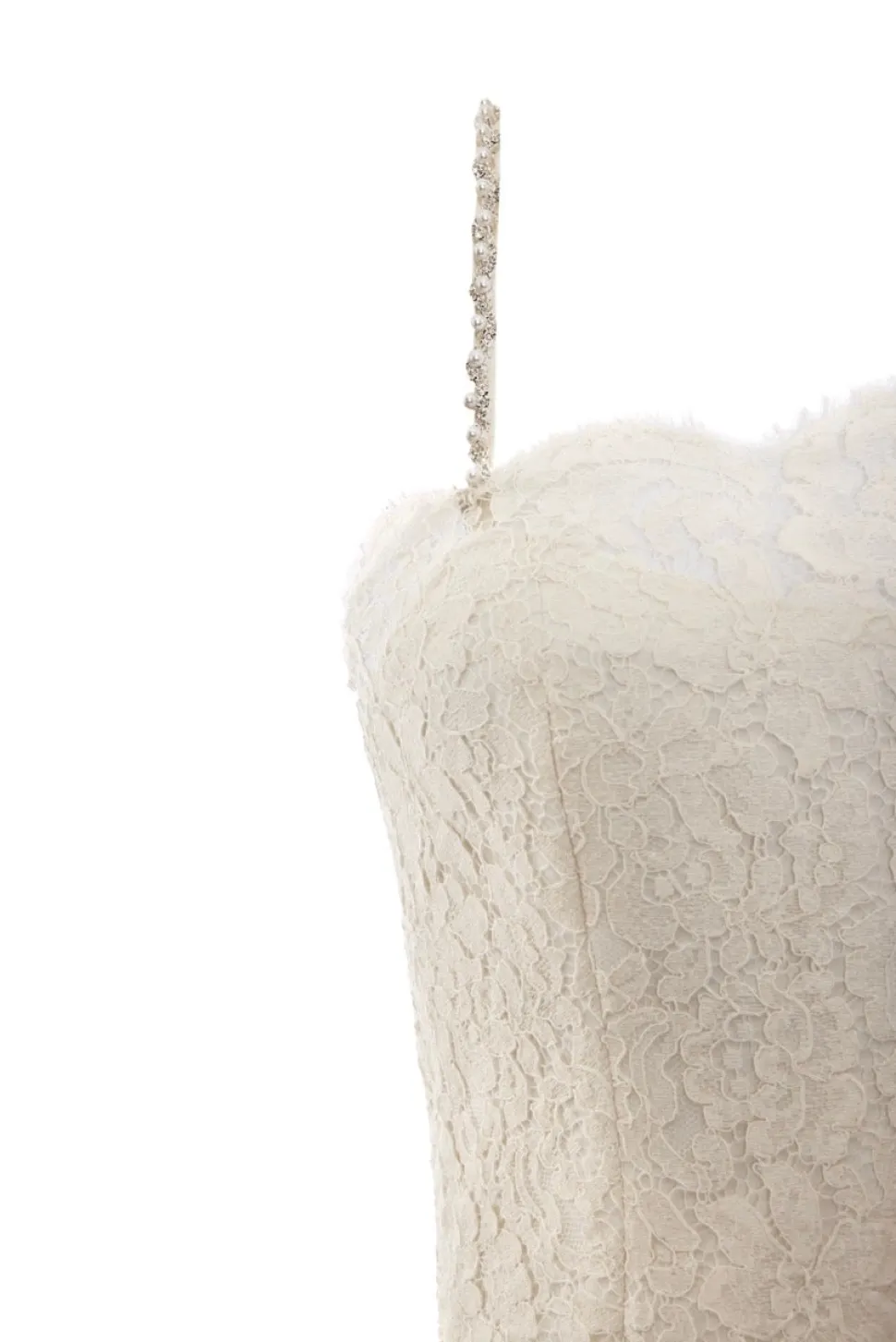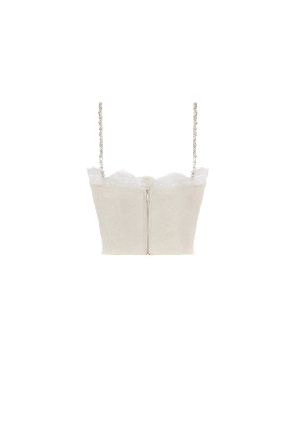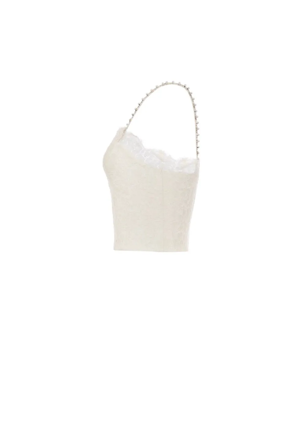Born in India and raised in New York, where she eventually worked in finance, Natasha Das’s diverse background is at the essence of Danarys New York, a luxury womenswear label that asks its wearer to embrace their strength and fearlessness of their femininity. The Keating, an ivory French lace top, features scalloped edging across the neckline and impresses with pearl and crystal-adorned strap details.