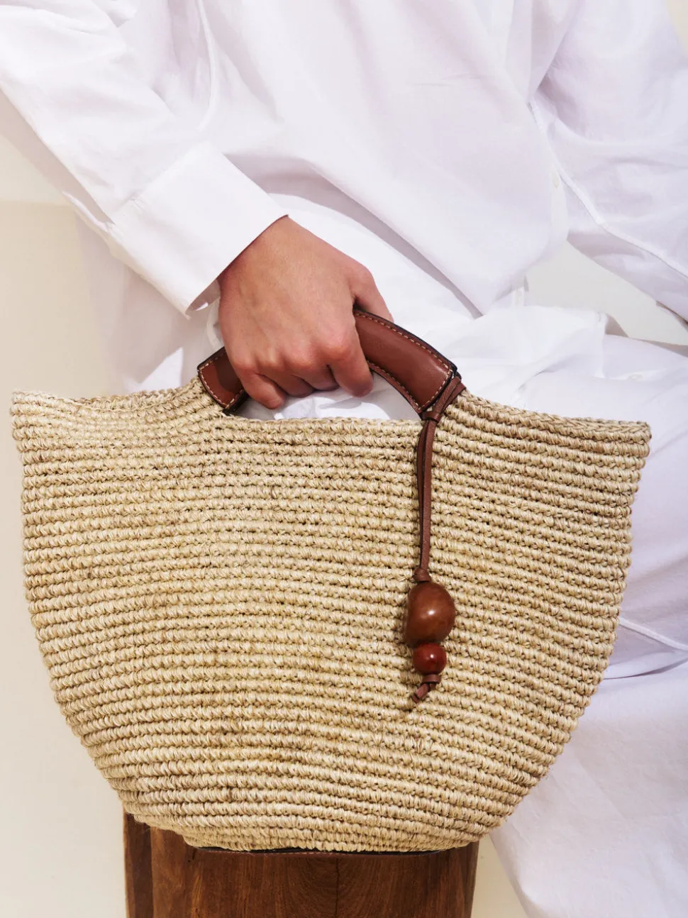 Handwoven natural fibers with leather-trimmed handles and removable crossbody strap. Signature tassel accent. Made in Colombia.