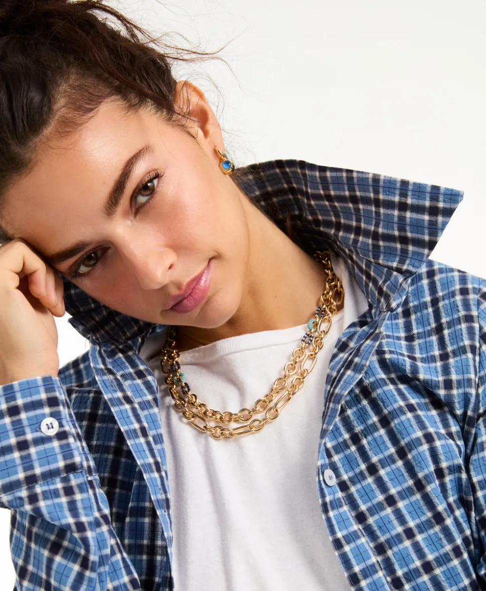 Whimsical, colorful, and crafted with tone-perfect details, Roxanne Assoulin’s four decades of experience—designing for the likes of Marc Jacobs and Oscar de la Renta—are expressed in every piece of her candy-inspired collection of bracelets, chokers, earrings, and more. As the brand likes to say, and as every “it” girl knows, it’s jewelry that makes you smile. The Marino Necklace Duo layers two different necklaces: The Marino Link Necklace and The Andiamo Link Necklace. Together the duo features hand-painted enamel stripes and turquoise pave detail with gold tone chain links.