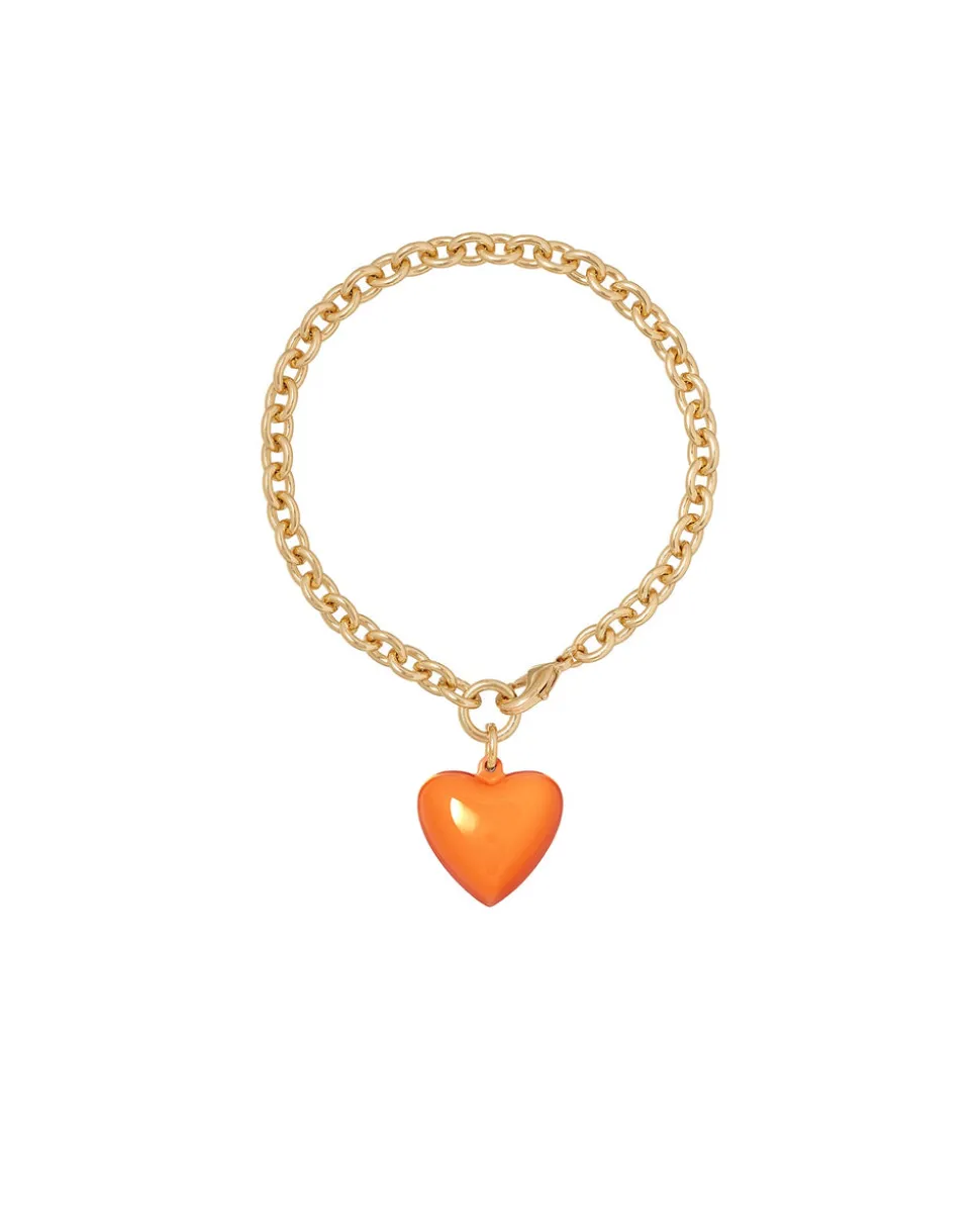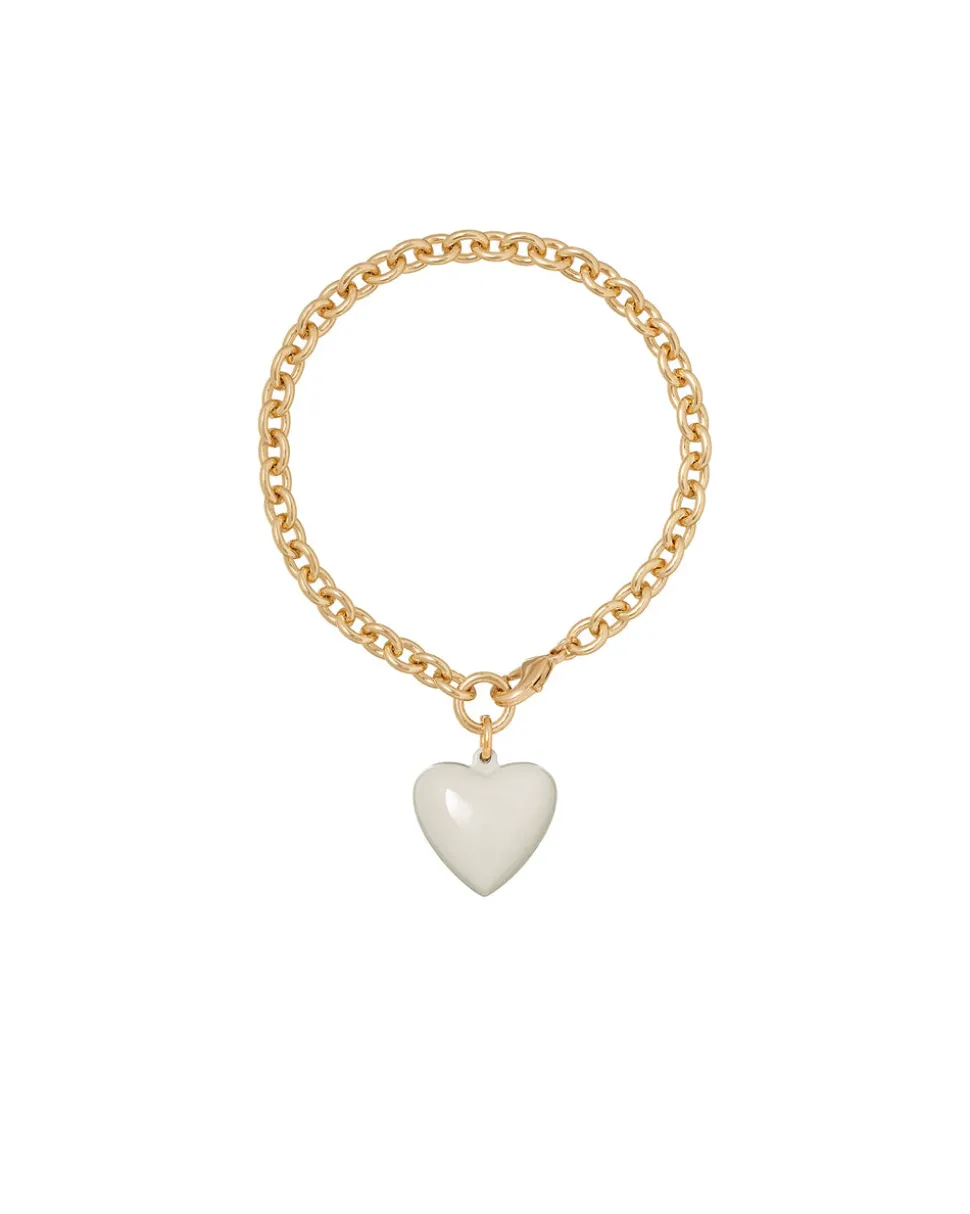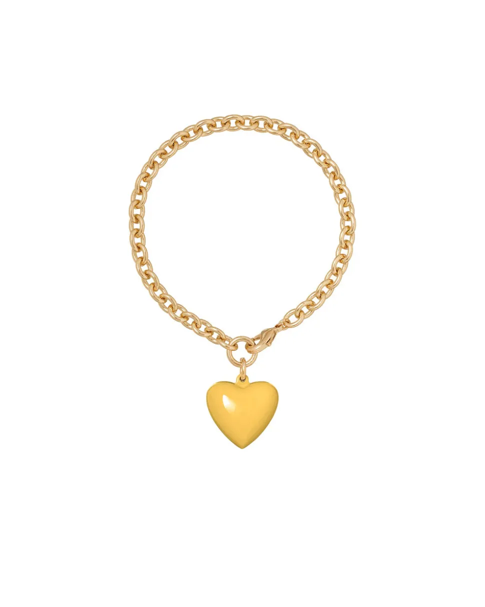 Gold tone brass chain bracelet & removable shiny gold tone or enamel puffy heart charm.