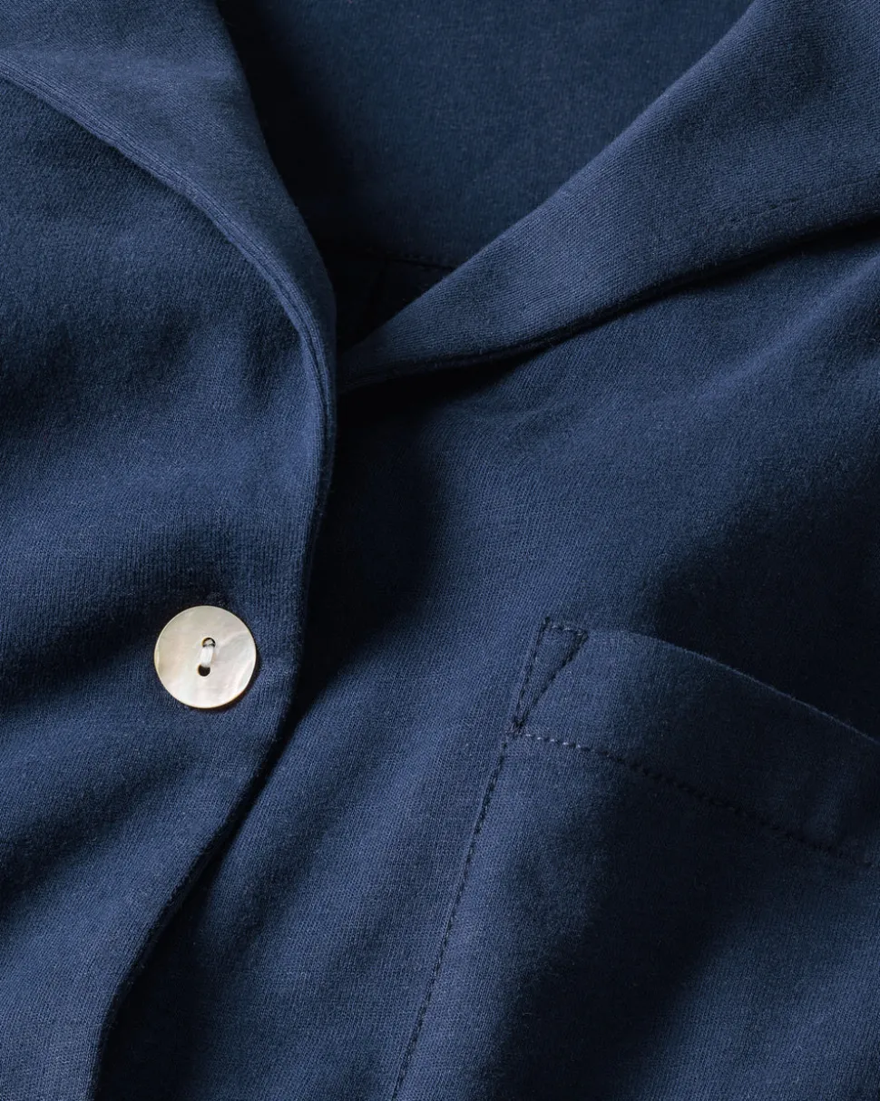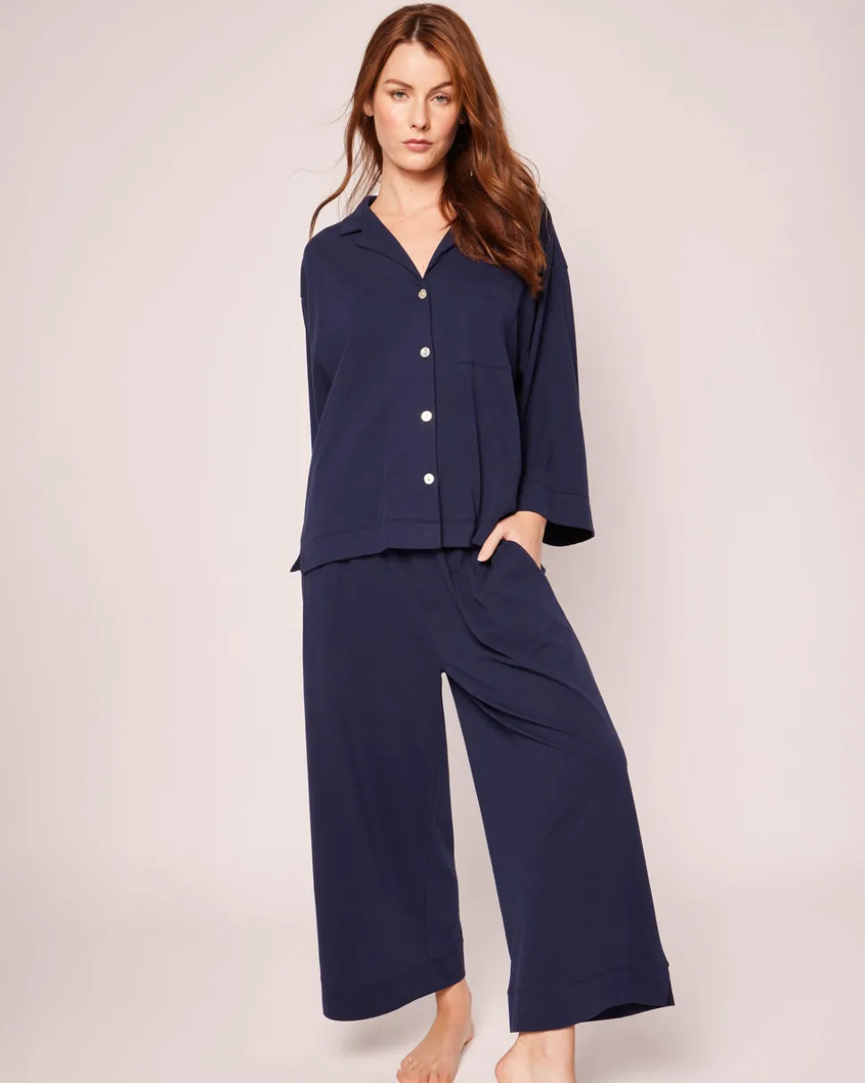 Petite Plume wishes you a “bonne nuit,” and in their luxury sleepwear, it’s hard not to oblige. Crafted in exquisite cotton, with the finest attention to detail, Petite Plume delivers the utmost comfort and sophistication. The Olivia Wide Leg Pima Pajama Set in Navy is the apex of comfort and feminine tailoring. This set features a well-considered three-quarter length sleeve and a more generous pant leg that results in that refined swish-swish sensation at your ankle as you walk down a long hallway. Buttery and smooth, yet breathable, this collection is yarn-dyed to prevent fading and is destined to become a fixture of your soothing bedtime ritual.