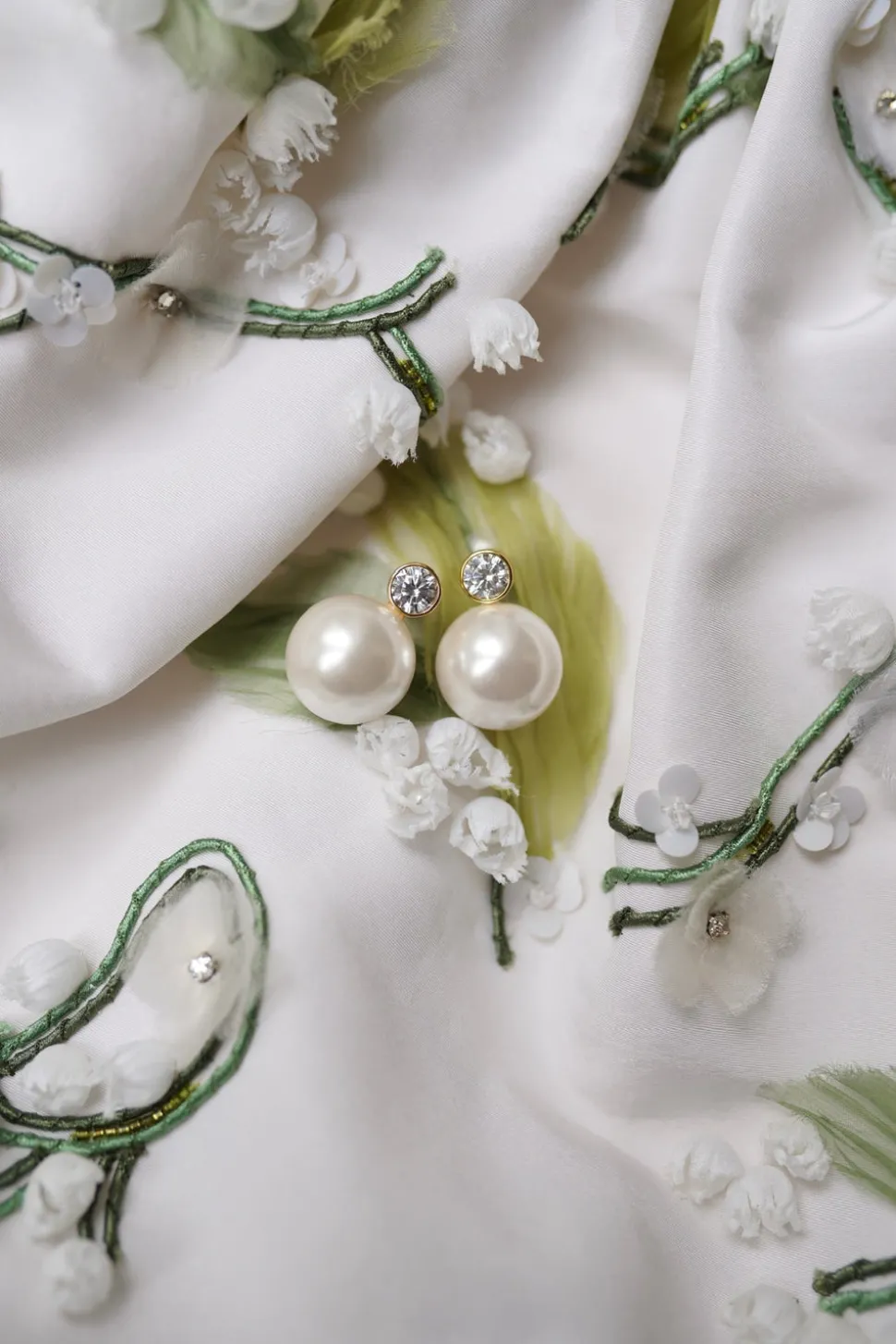OTM bride Nicola Bathie’s jewelry is a whimsical expression of art and adornment, inspired by her South African roots, her Texas home, and the romance of her travels. Designed in collaboration with Allie Provost, The Provost earrings are a petite yet striking style that pairs timeless elegance with subtle shine. Featuring faux pearls and glass accents set in plated gold, these lightweight earrings bring a sophisticated finish to any look.