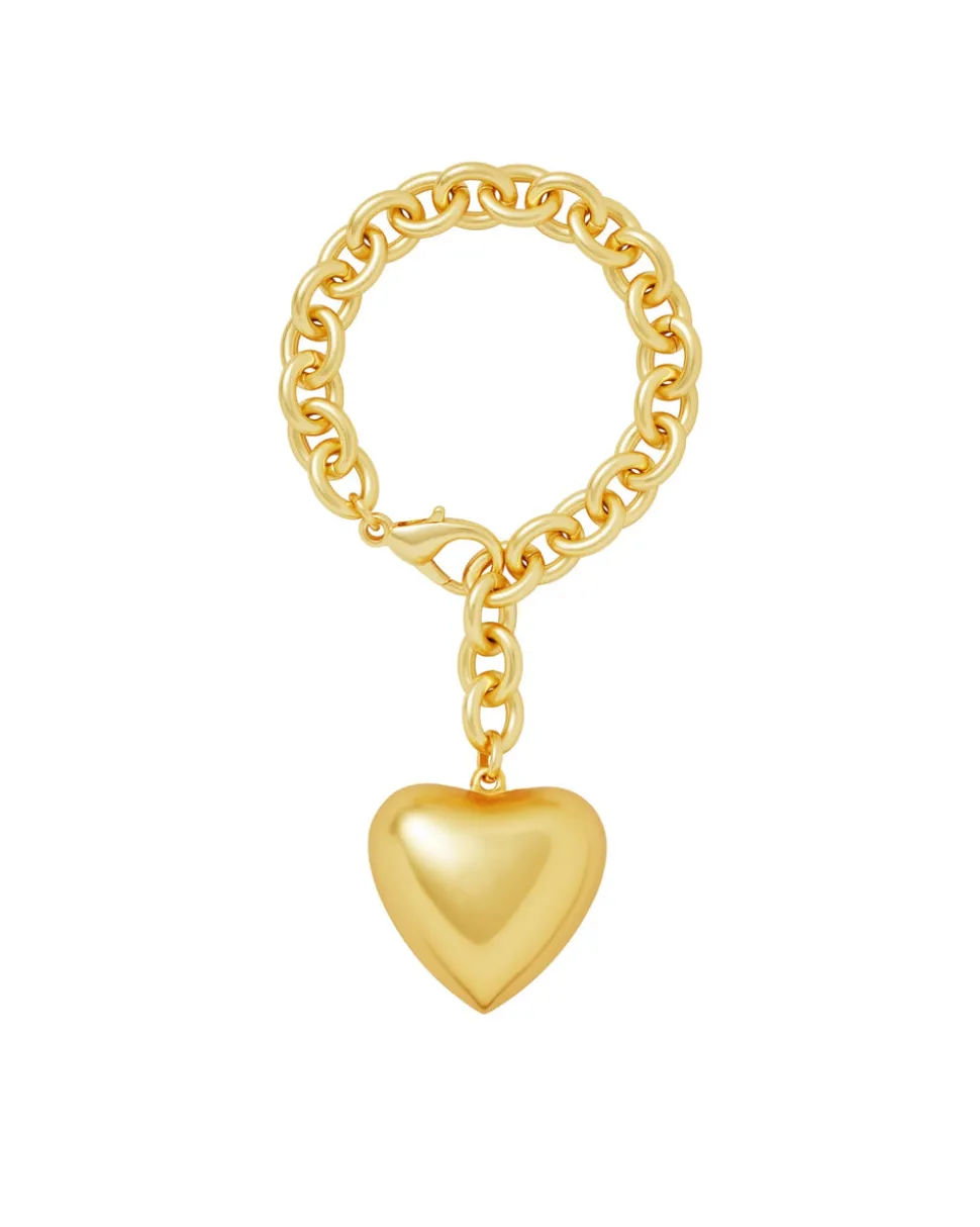 Gold tone brass chain bracelet and heart pendant. Can also be worn as a bag charm.