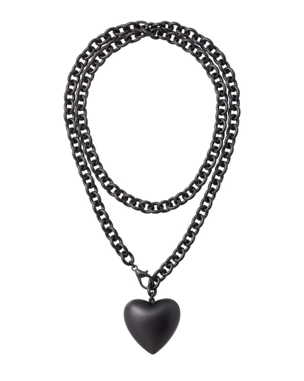 Brass chain with matte black finish and oversized heart pendant. Lobster closure.