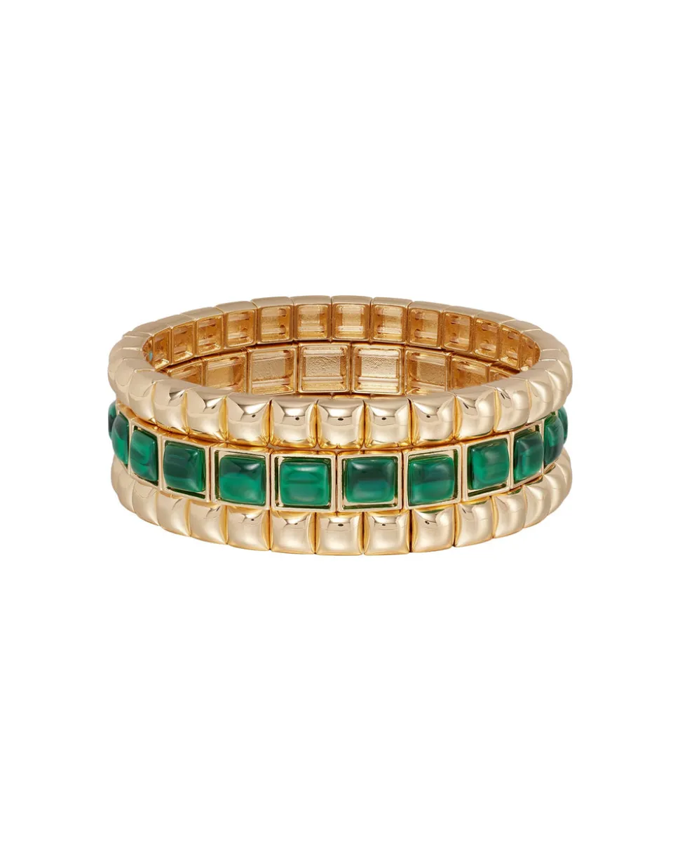Whimsical, colorful, and crafted with tone-perfect details, Roxanne Assoulin’s four decades of experience—designing for the likes of Marc Jacobs and Oscar de la Renta—are expressed in every piece of her candy-inspired collection of bracelets, chokers, earrings, and more. As the brand likes to say, and as every “it” girl knows, it’s jewelry that makes you smile. The Puffy Stud Bracelet Stack in Green is a chic stretchy bracelet with three layers. Gold tone puffy studs sandwich a layer of deep green puffy studs that are the epitome of elegance and wearability.