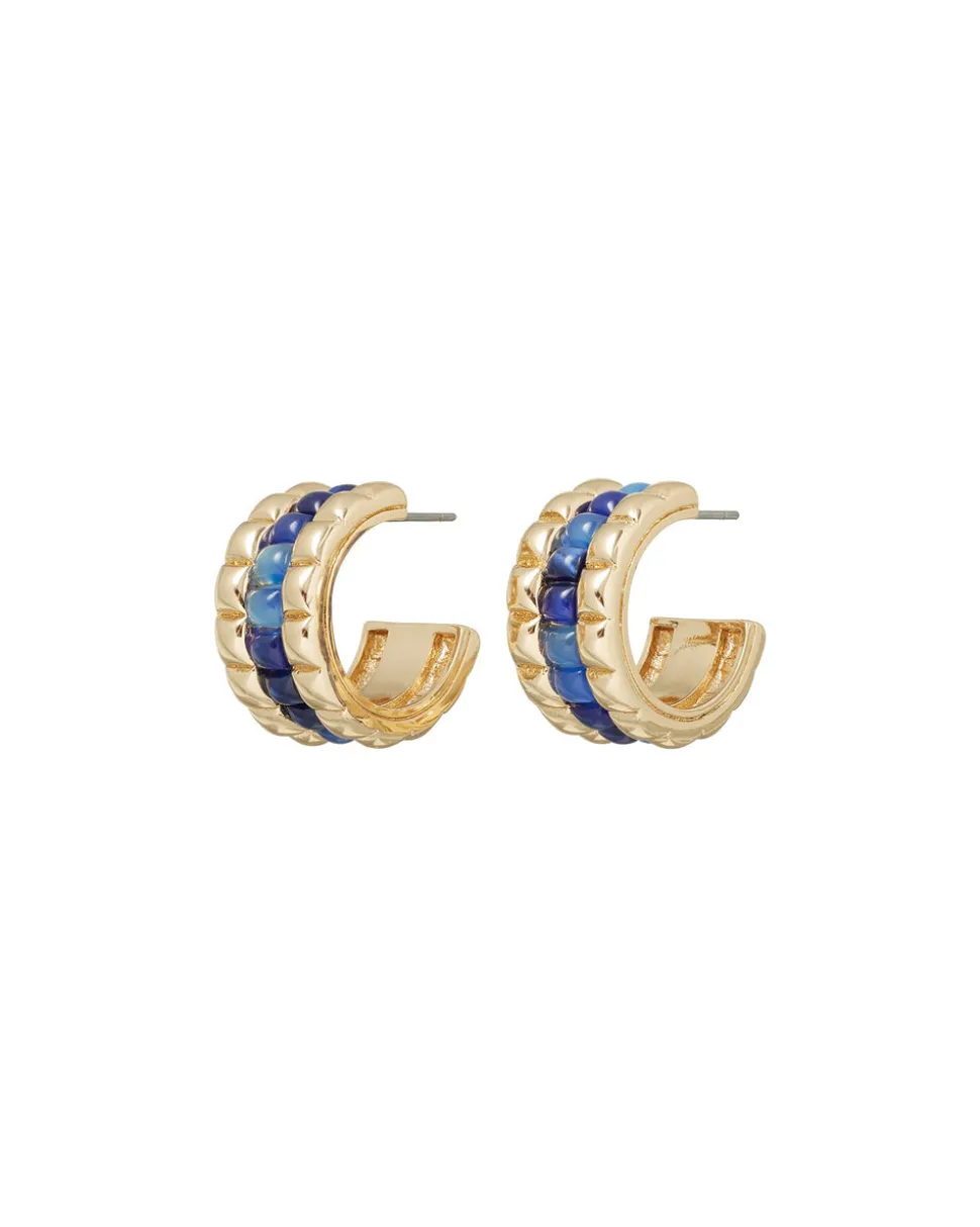Whimsical, colorful, and crafted with tone-perfect details, Roxanne Assoulin’s four decades of experience—designing for the likes of Marc Jacobs and Oscar de la Renta—are expressed in every piece of her candy-inspired collection of bracelets, chokers, earrings, and more. As the brand likes to say, and as every “it” girl knows, it’s jewelry that makes you smile. The Puffy Stud Hoop Earrings are chic hoop earrings with three rows of puffy studs and a pop of color. Navy stud stones add a touch of elegance that beautifully contrast with gold.