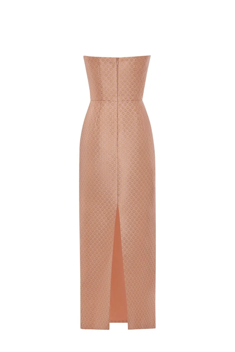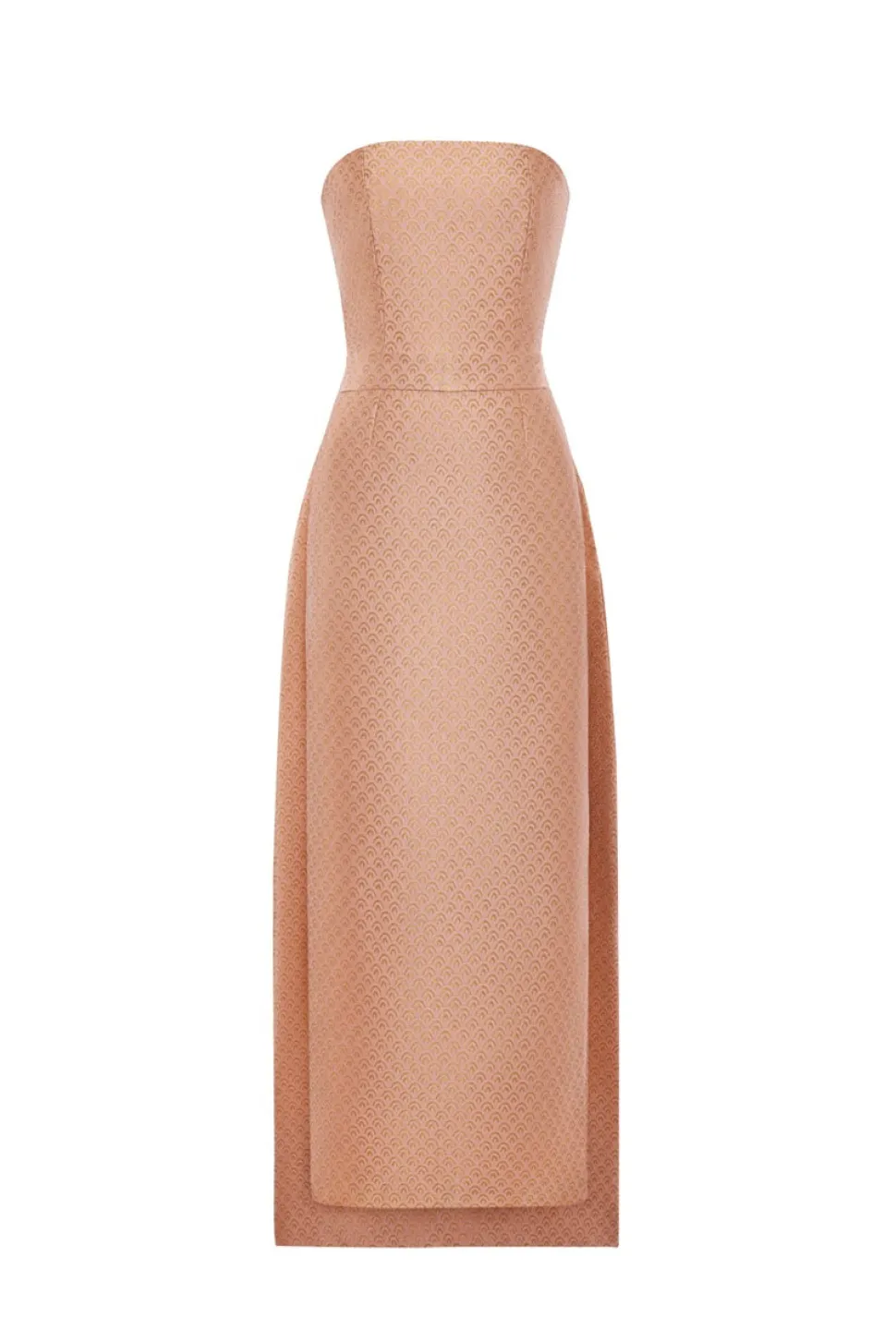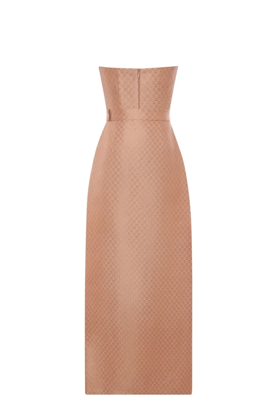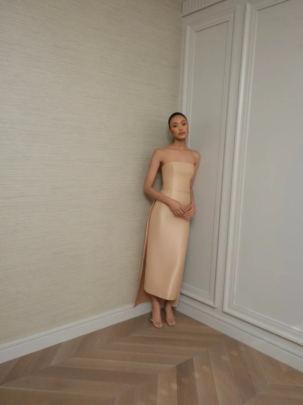 Born in India and raised in New York, where she eventually worked in finance, Natasha Das’s diverse background is at the essence of Danarys New York, a luxury womenswear label that asks its wearer to embrace their strength and fearlessness of their femininity. The Rosalie Gown features a striking rose and gold scalloped print. With a strapless boned bodice, column skirt, and a detachable waist belt with draped train detail, this dress is a stunning choice for any special occasion.