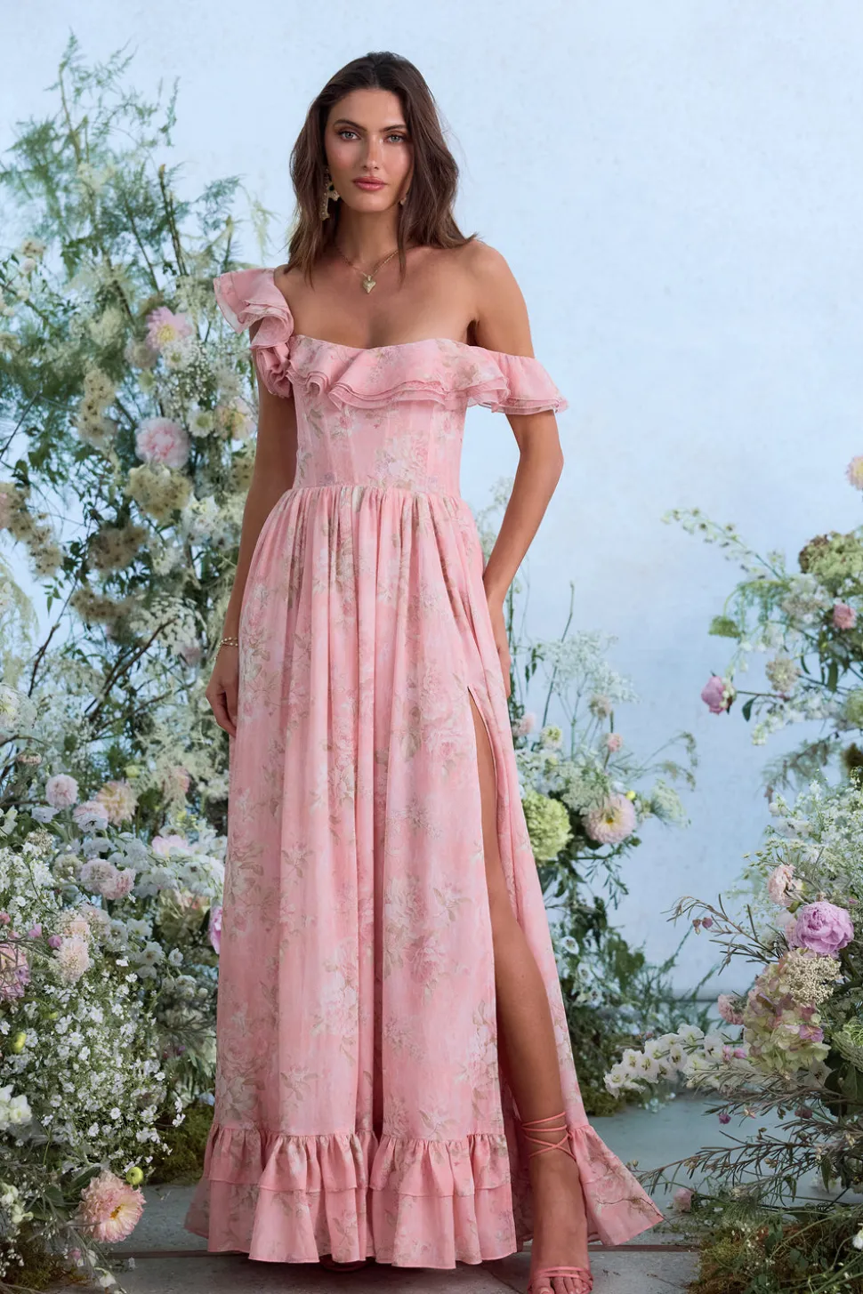 Named for her grandmother, who taught her to sew, Victoria Salisbury founded V. Chapman to bring unique, structured, feminine clothing to a new generation of women. Based in Los Angeles, V. Chapman masterfully updates vintage silhouettes with a modern flair, and contemporary touches. The Rosetta Dress in Light Pink Tapestry Rose is a dreamy, delicate, floor-length corset gown featuring a high front slit and adorned with asymmetrical off-shoulder straps. Made from solid Light Pink Tapestry Rose chiffon and accented with organza neckline ruffles and a stunning rosette. Rosetta is the ideal dress for the garden party of your dreams.