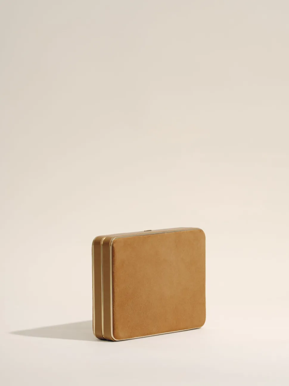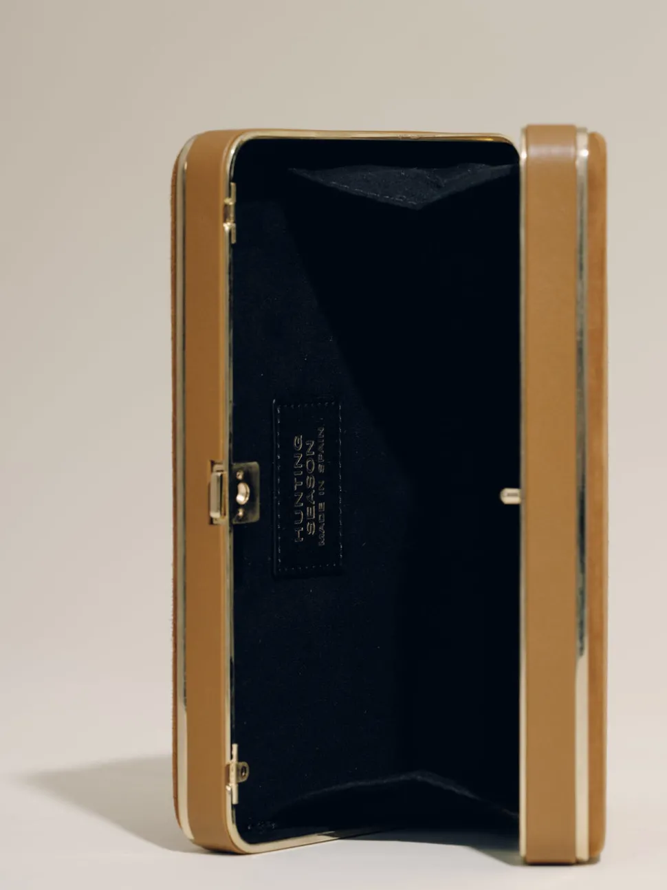Every Hunting Season collection includes a selection of woven handbags crafted by female artisans in Colombia, furthering the brand’s mission to promote heritage craft to a luxury level while supporting the livelihoods of fellow creative women. The Square Compact in Camel Suede is inspired by vintage cigarette cases and is a study in architectural contrast. Its strong, structured silhouette is framed in polished metal, highlighting luxe materials like velvet and satin. Finished with a sleek push-lock closure in light gold hardware, this streamlined clutch is an elegant complement to evening looks and a timeless favorite for formal occasions.