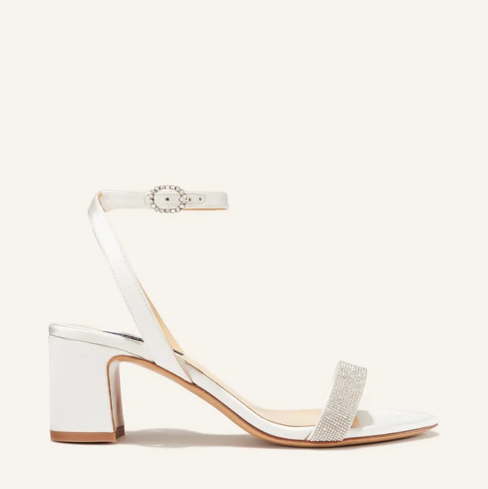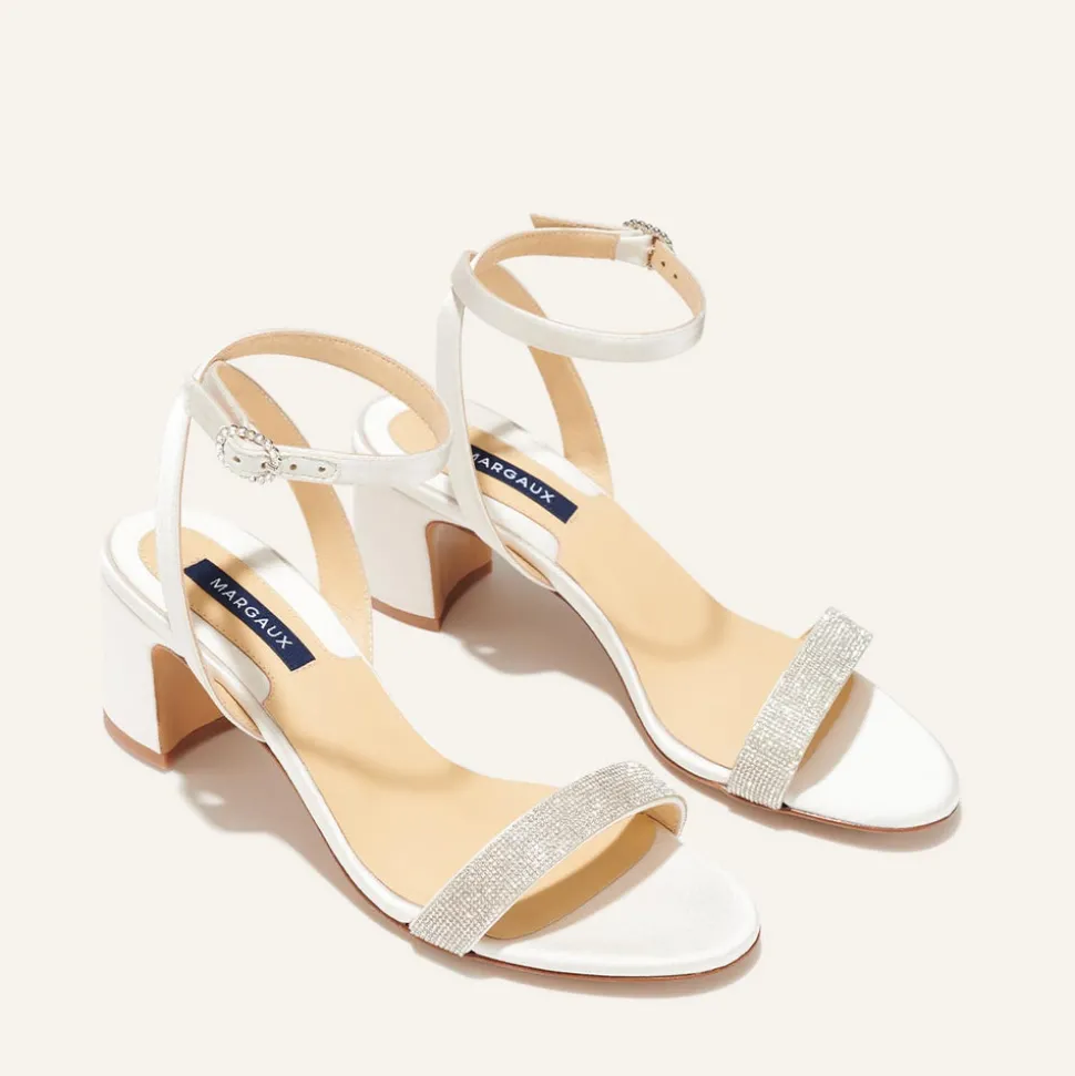 Margaux makes wear-anywhere, and everywhere, shoes that keep you comfortable no matter where they day takes you. The New York shoe brand is all about size inclusivity and offers three widths, from sizes 3 to 14, as well as virtual fit sessions, to help you find that marriage of comfort and style every step of the way. Crafted with a luxurious satin upper, lined in leather, The Stella Sandal in Ivory Satin with Crystals boasts a placed strap for a comfy fit and minimal coverage, and a walkable, 2.5 inch block heel. At once, super elegant and chic.