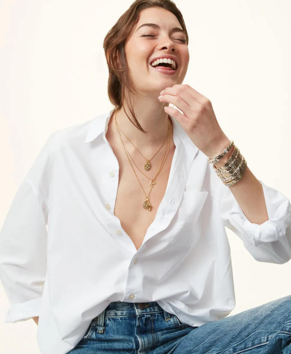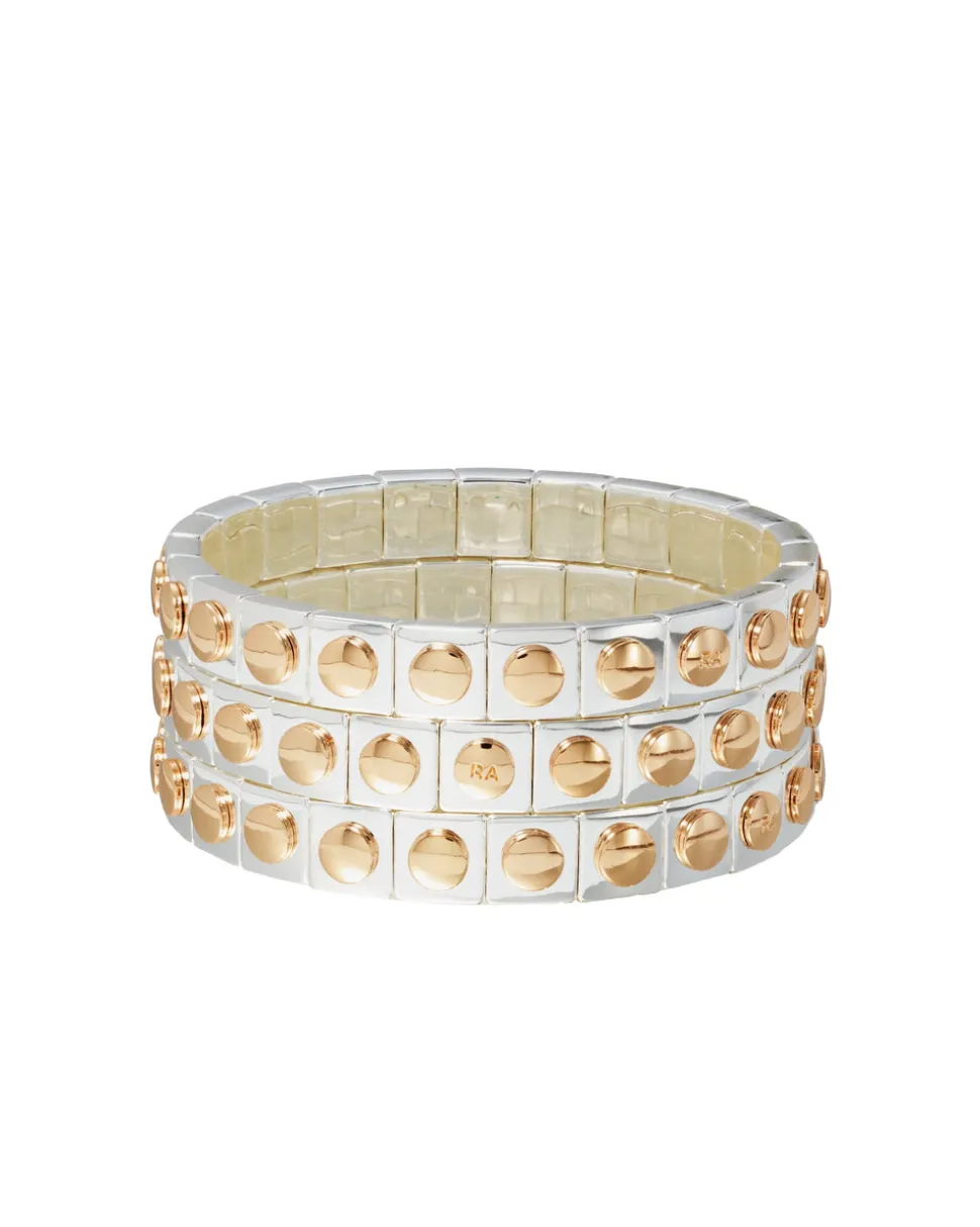 Whimsical, colorful, and crafted with tone-perfect details, Roxanne Assoulin’s four decades of experience—designing for the likes of Marc Jacobs and Oscar de la Renta—are expressed in every piece of her candy-inspired collection of bracelets, chokers, earrings, and more. As the brand likes to say, and as every “it” girl knows, it’s jewelry that makes you smile. The Stud Bracelet will bring a chic mixed-metal look to every wrist, whether worn single or as a set.