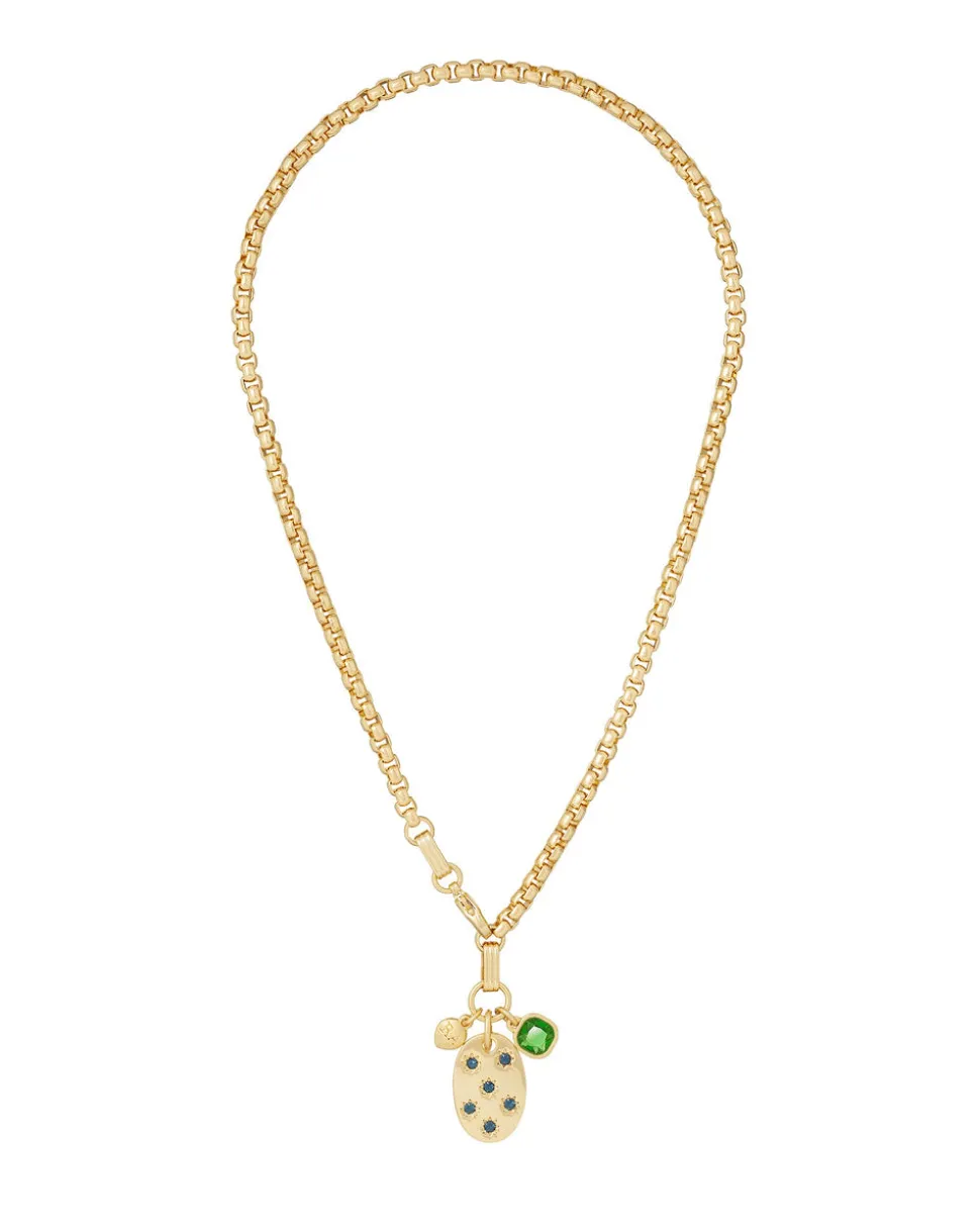 Gold tone box chain necklace with star-set sapphire pendant charm and emerald charm. Lobster closure.