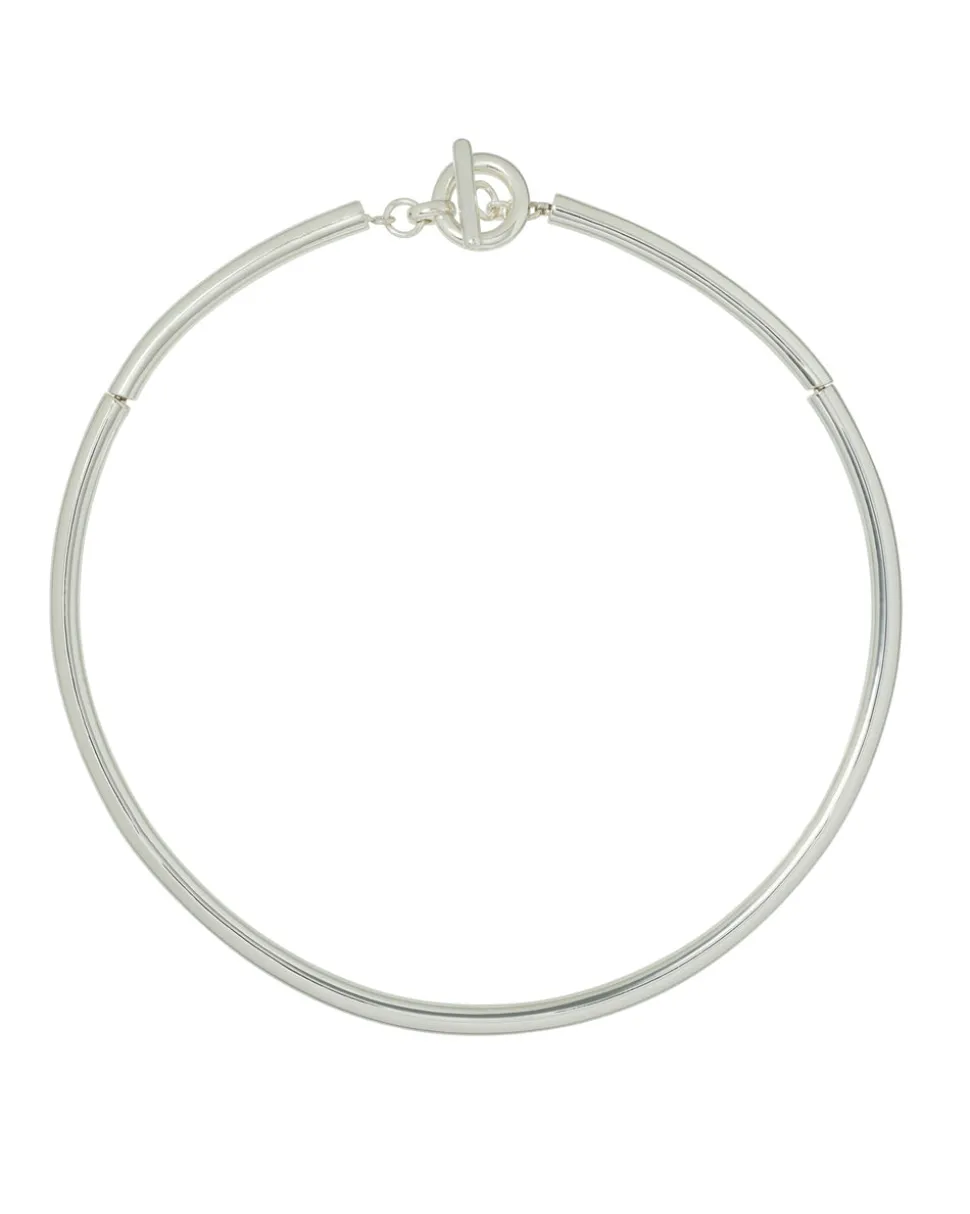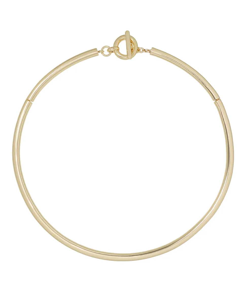 Gold tone or silver tone collar necklace with toggle closure.