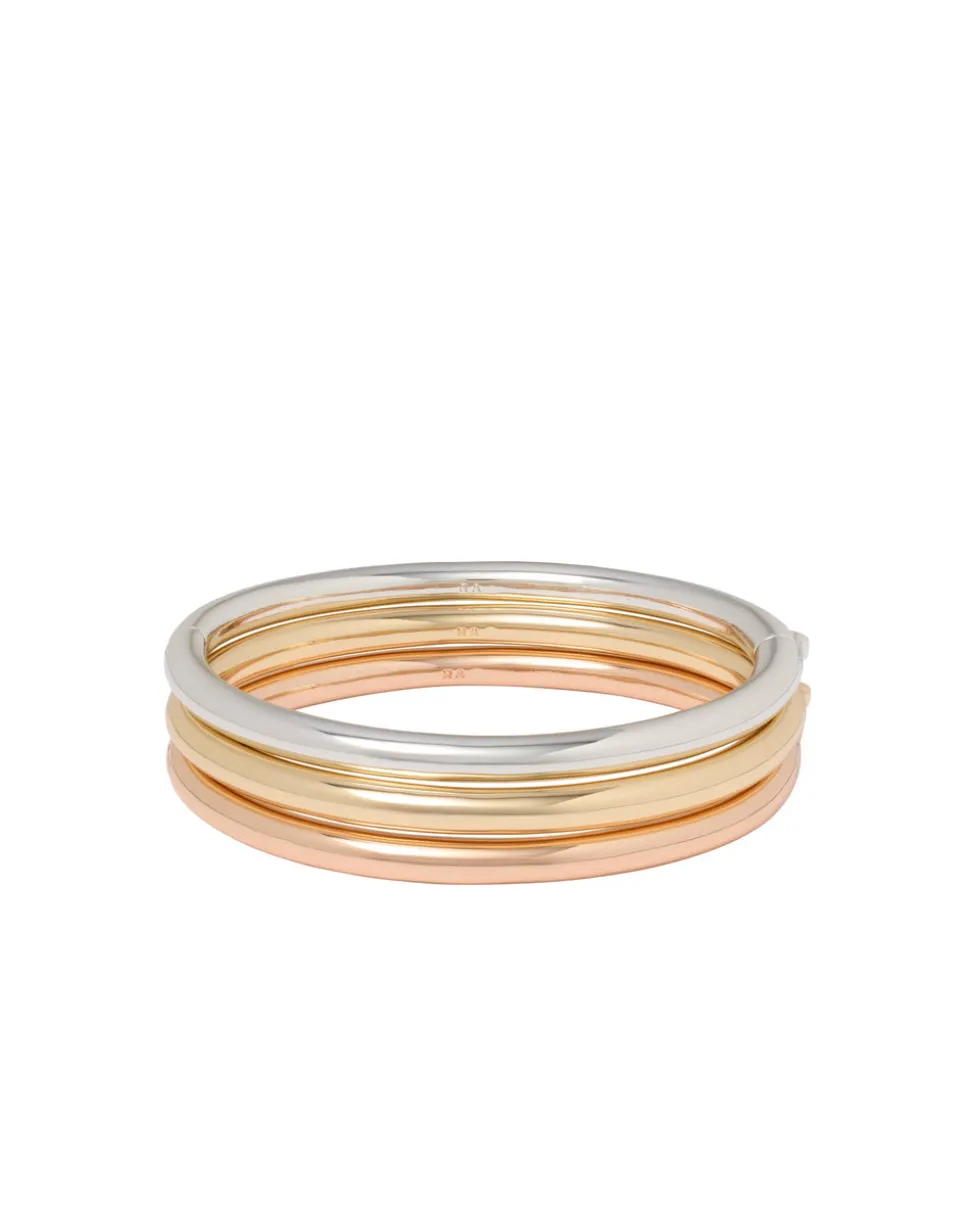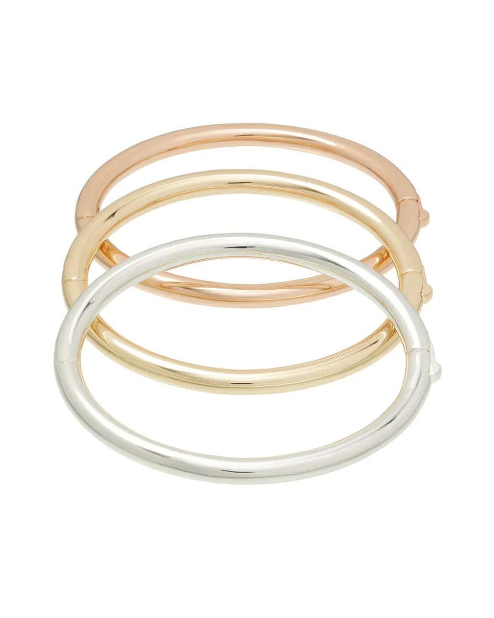 Gold, rose gold, and silver tone hinged bracelets with hinged clasp closure. Sold individually or as a set of three.