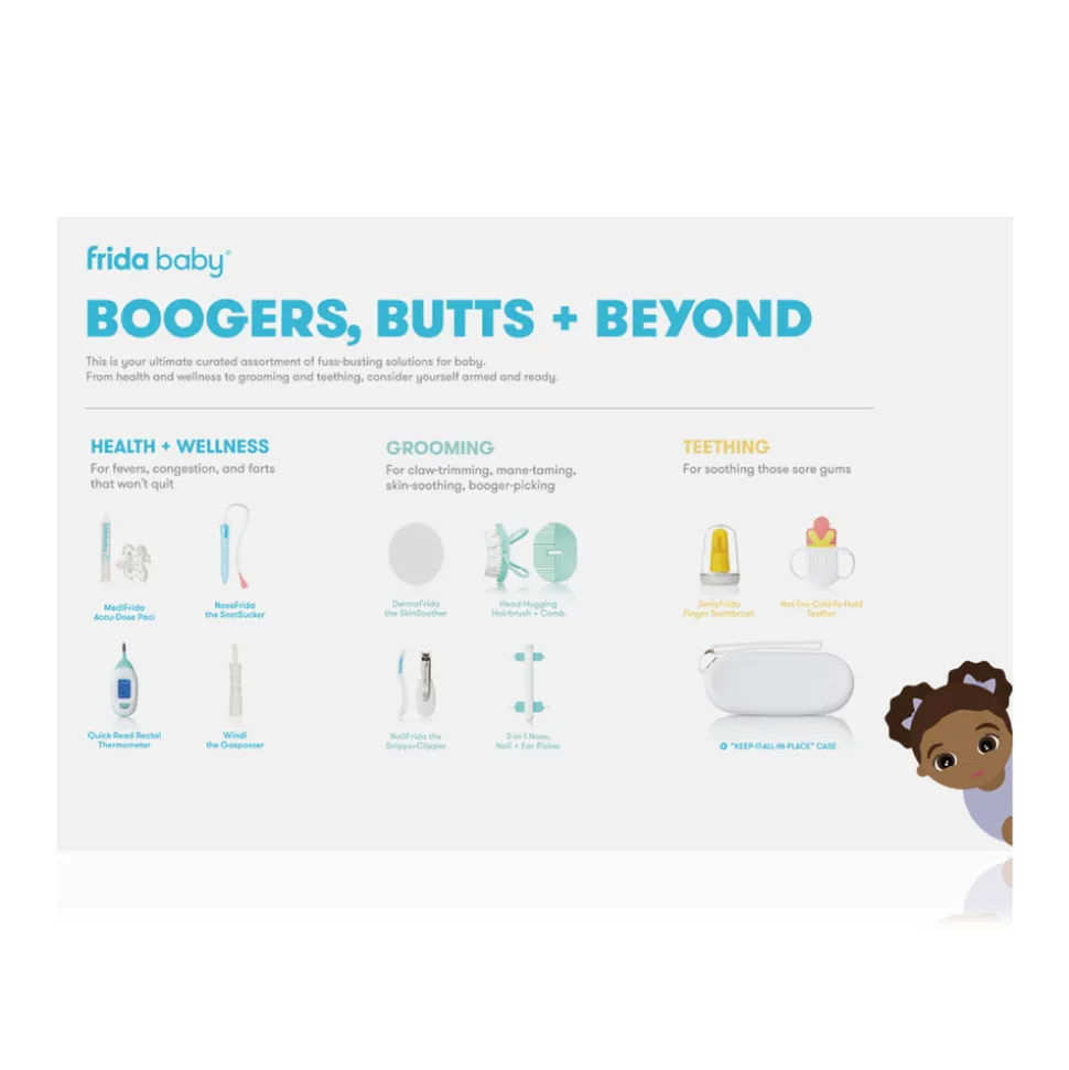 Frida Baby adopts a no-nonsense approach to everything related to babies and beyond, from care products and first aid to postpartum recovery and delivery kits. The brand playfully refers to many of its products as fuss busters. Its straightforward attitude and effective solutions have made it a cult favorite among parents everywhere. This comprehensive kit is your one-stop, curated assortment of solutions including ten health and wellness, grooming, and teething must-haves. Whether you need to conquer congestion, tame some mane, or soothe sore gums, this kit ensures you are ready for whatever comes your way.