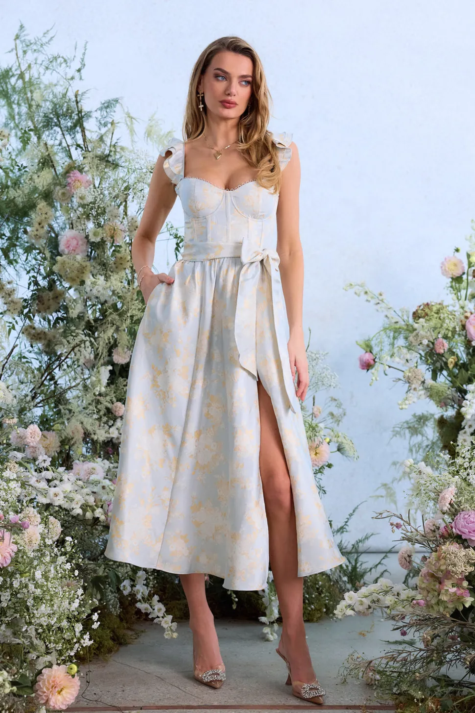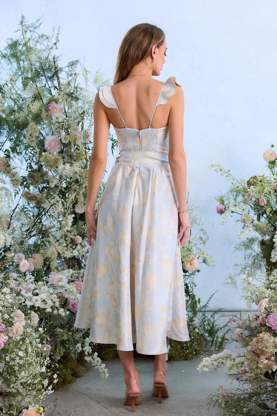 Named for her grandmother, who taught her to sew, Victoria Salisbury founded V. Chapman to bring unique, structured, feminine clothing to a new generation of women. Based in Los Angeles, V. Chapman masterfully updates vintage silhouettes with a modern flair, and contemporary touches. The Vera Dress in Sky Windsor Brocade is an ankle length corset dress featuring a side front slit and bow-tie belt. Made in romantic Sky Windsor Brocade and adorned with dainty loop trim and the sweetest ruffle details