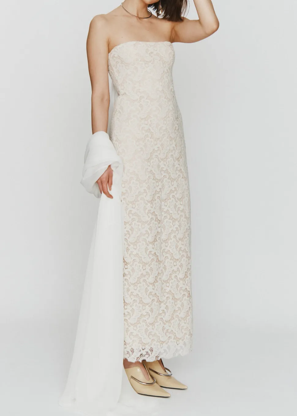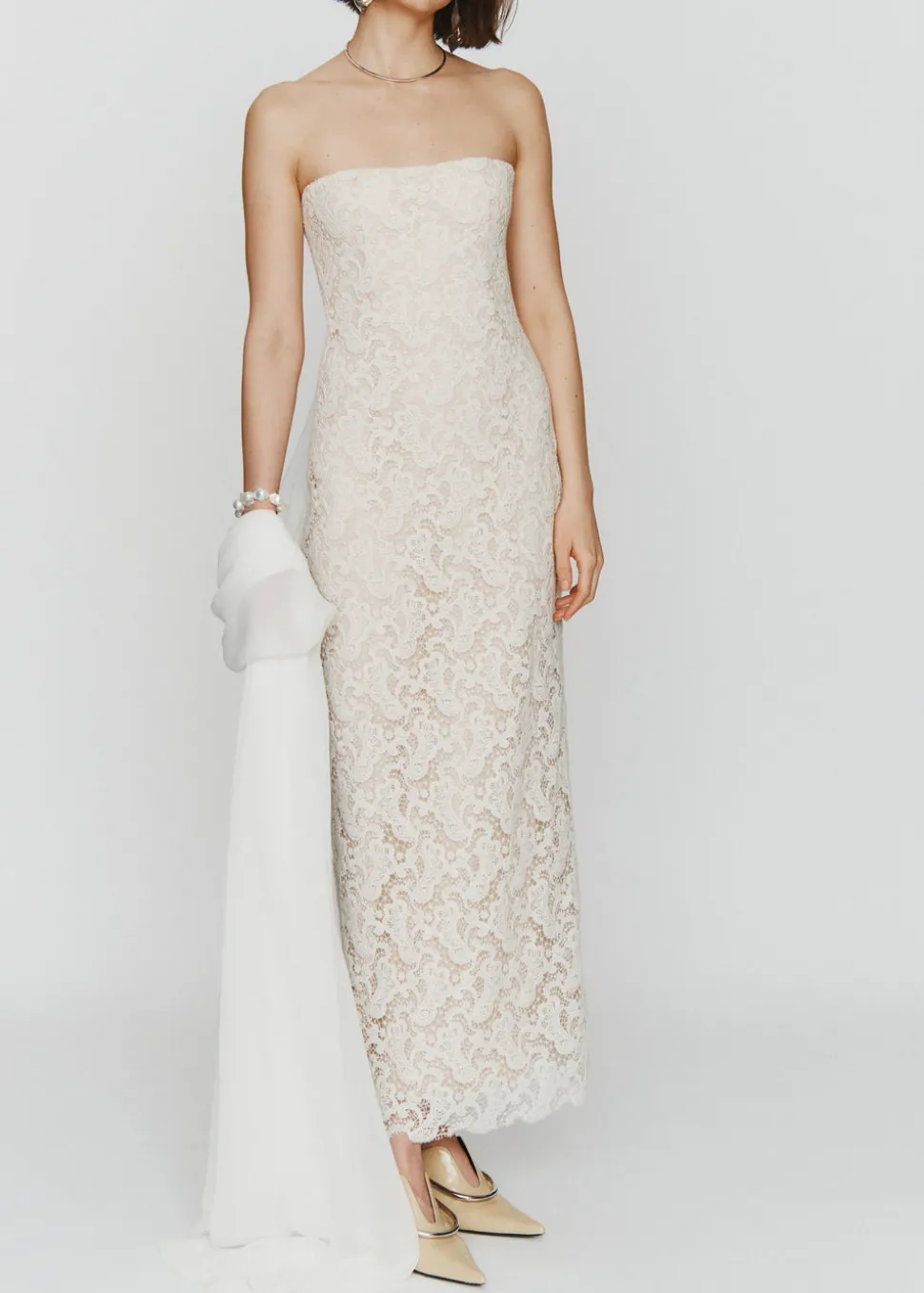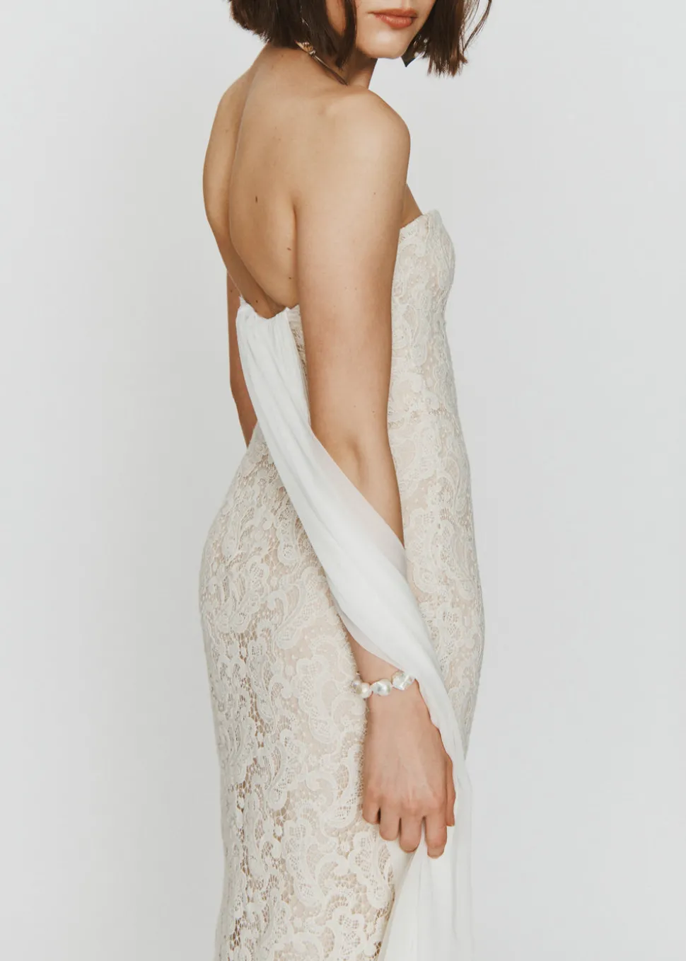 After honing her design vision and couture experience at Zac Posen, Narciso Rodriguez, and Chanel, Meredith Stoecklein emerges on her own with LEIN. The brand offers a new concept of tasteful, stylish wedding wear for the thoroughly modern bride. Tailored in Italian wool lace, The Veronika boasts an interior bustier, detachable chiffon cape, and soft blush lining.