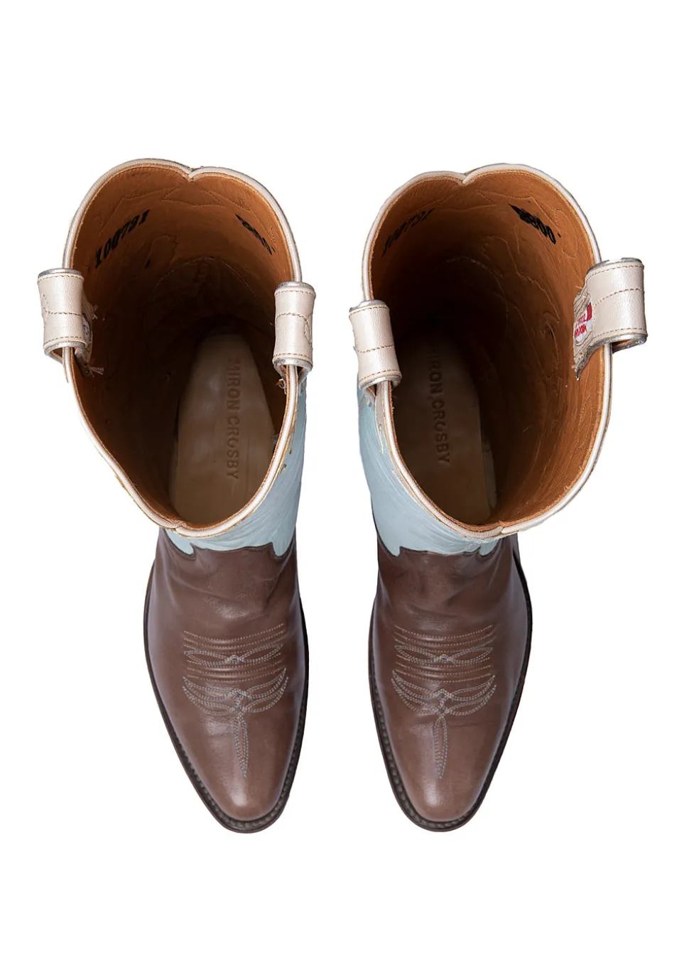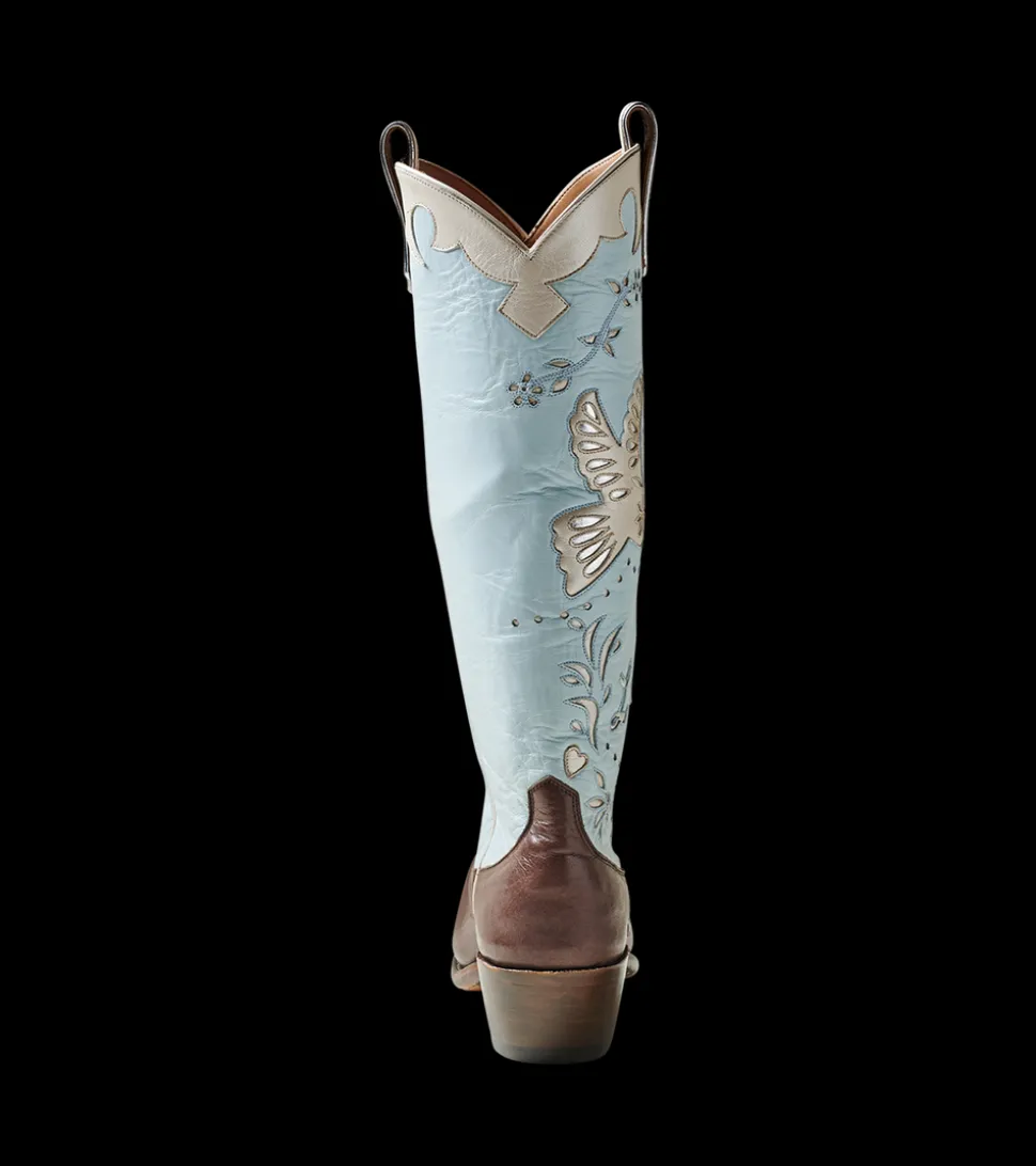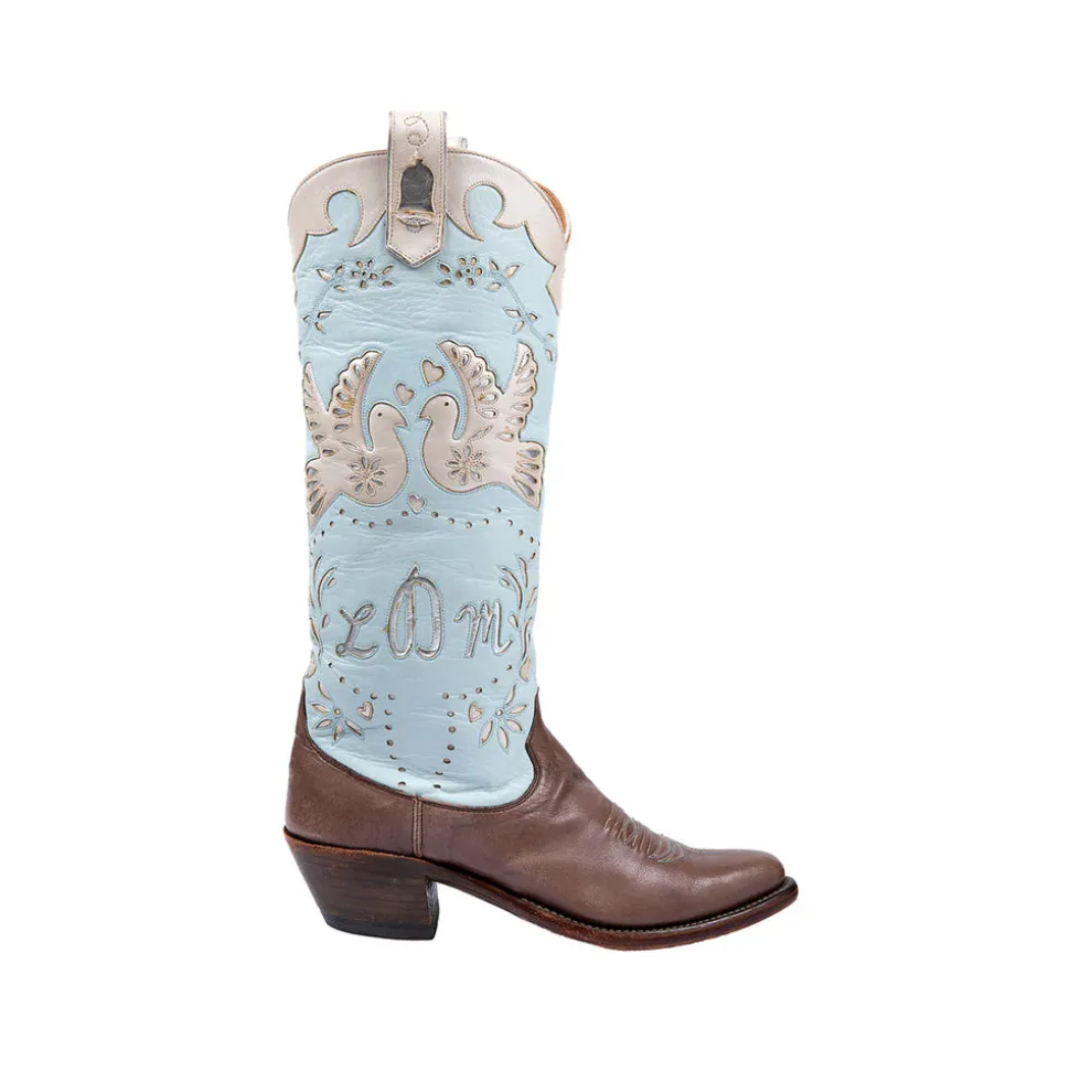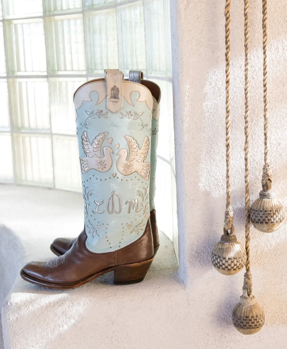 Founded by sisters Lizzie Means Duplantis and Sarah Means, Miron Crosby is inspired by the sisters’ experiences of growing up on their family’s West Texas cattle ranch, and later living and working in New York City. The artisanal boots are designed in New York, handmade in Texas, and created with love for every bride. Something borrowed, something blue, something old, and something new—this boot covers it all. Taking cues from traditional Mexican papel picado romantically strung above the streets during wedding parades, the Wedding Boot features kissing doves flanked by whimsical touches of floral on a powder blue background. There are even wedding bells. Handmade in Texas and crafted of the finest materials, these cowboy boots are a statement of quality, artistry, and style. Make them your own by customizing them with your new monogram on the exterior shaft uppers and your wedding date on the ear pulls! Available exclusively for custom order, please allow 6-8 months for production.