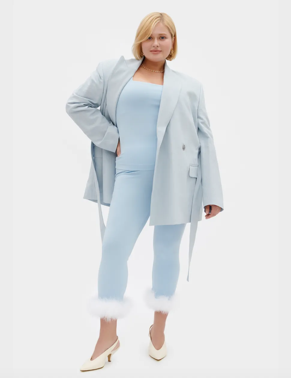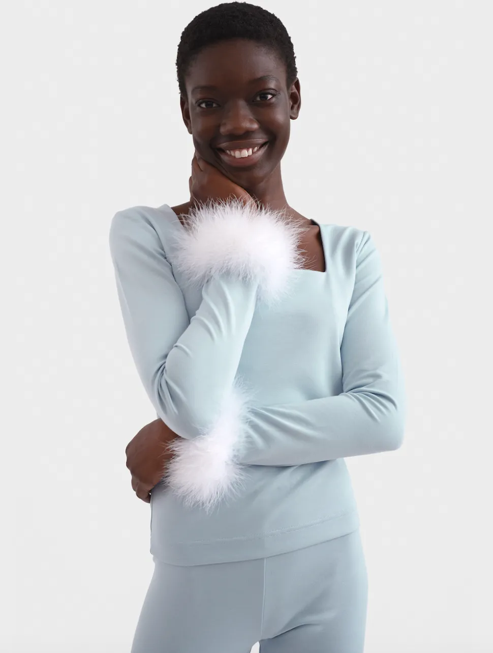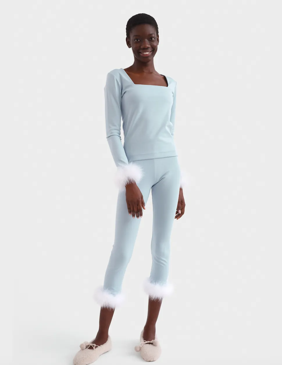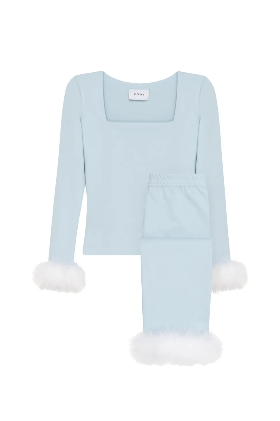 This sleek knitted set can be worn day and night. The Weekend Chic Set features one of the most iconic Sleeper silhouettes in powdery ice Blue. Thoroughly chic yet modernly practical, the set is even equipped with detachable fuzzy cuffs along the wrists and ankles.