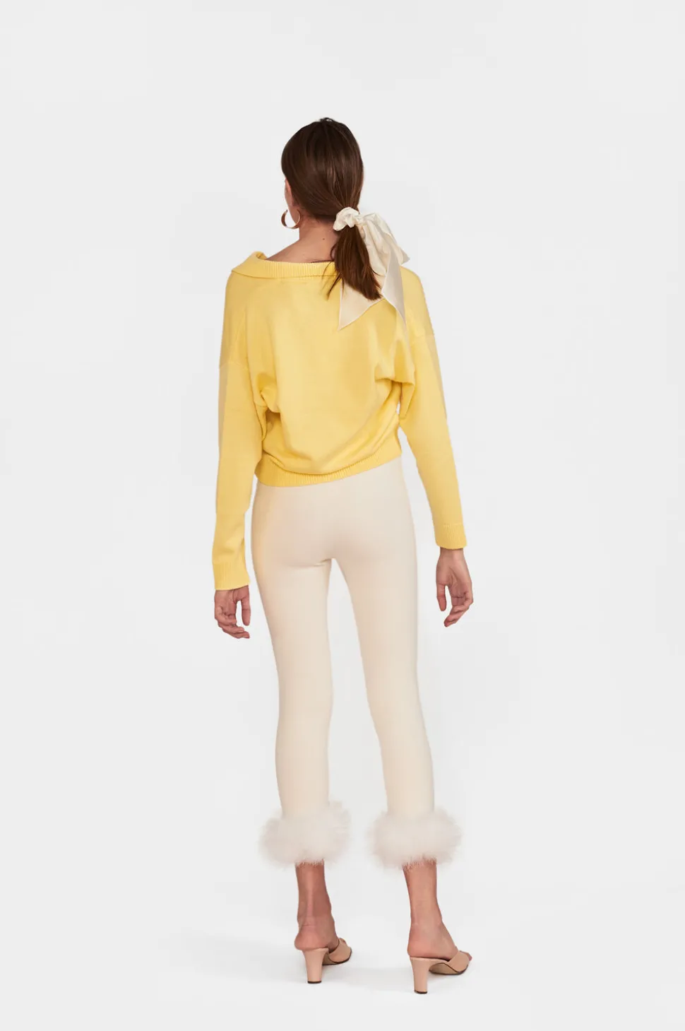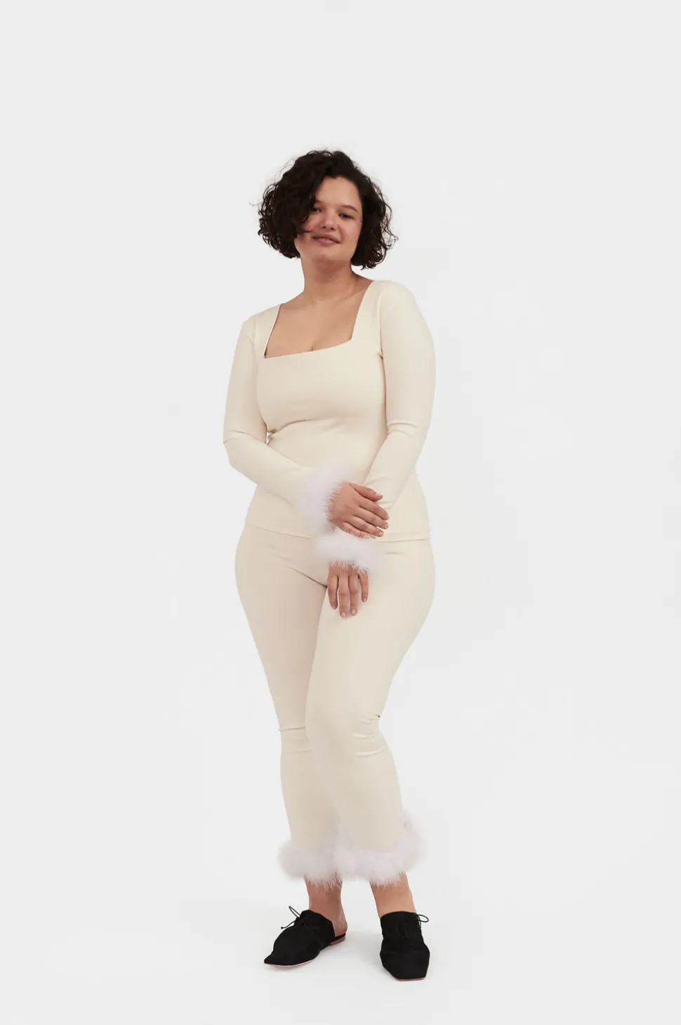 The Weekend Chic Set with Leggings is a knitted basic ensemble and is an ideal outfit for both your yoga class and a party with friends. Top and leggings are adorned with detachable fuzzy cuffs.