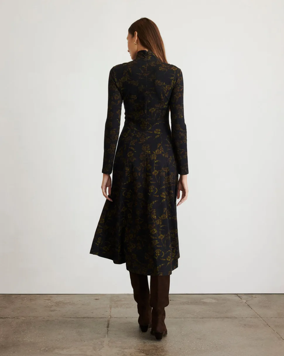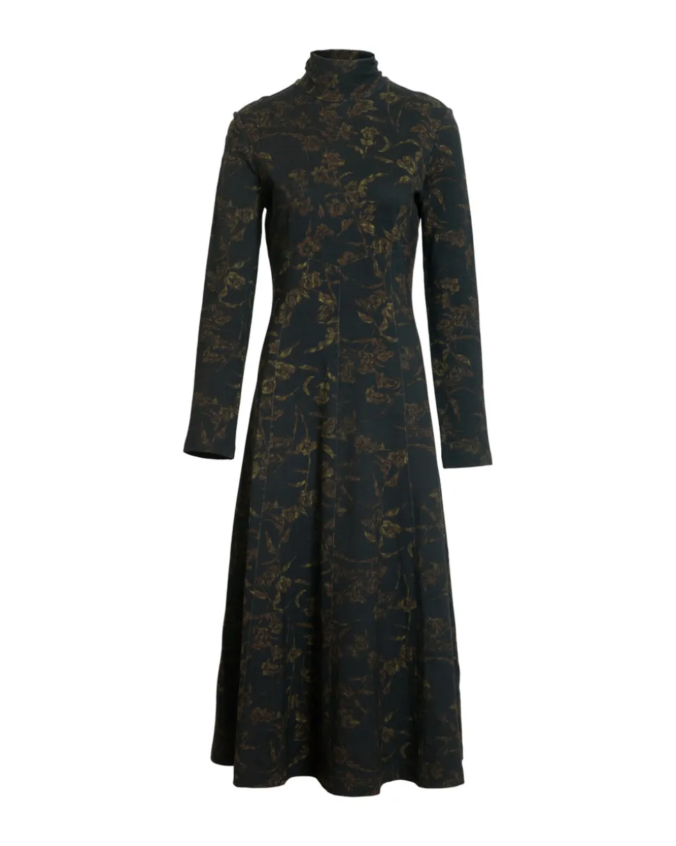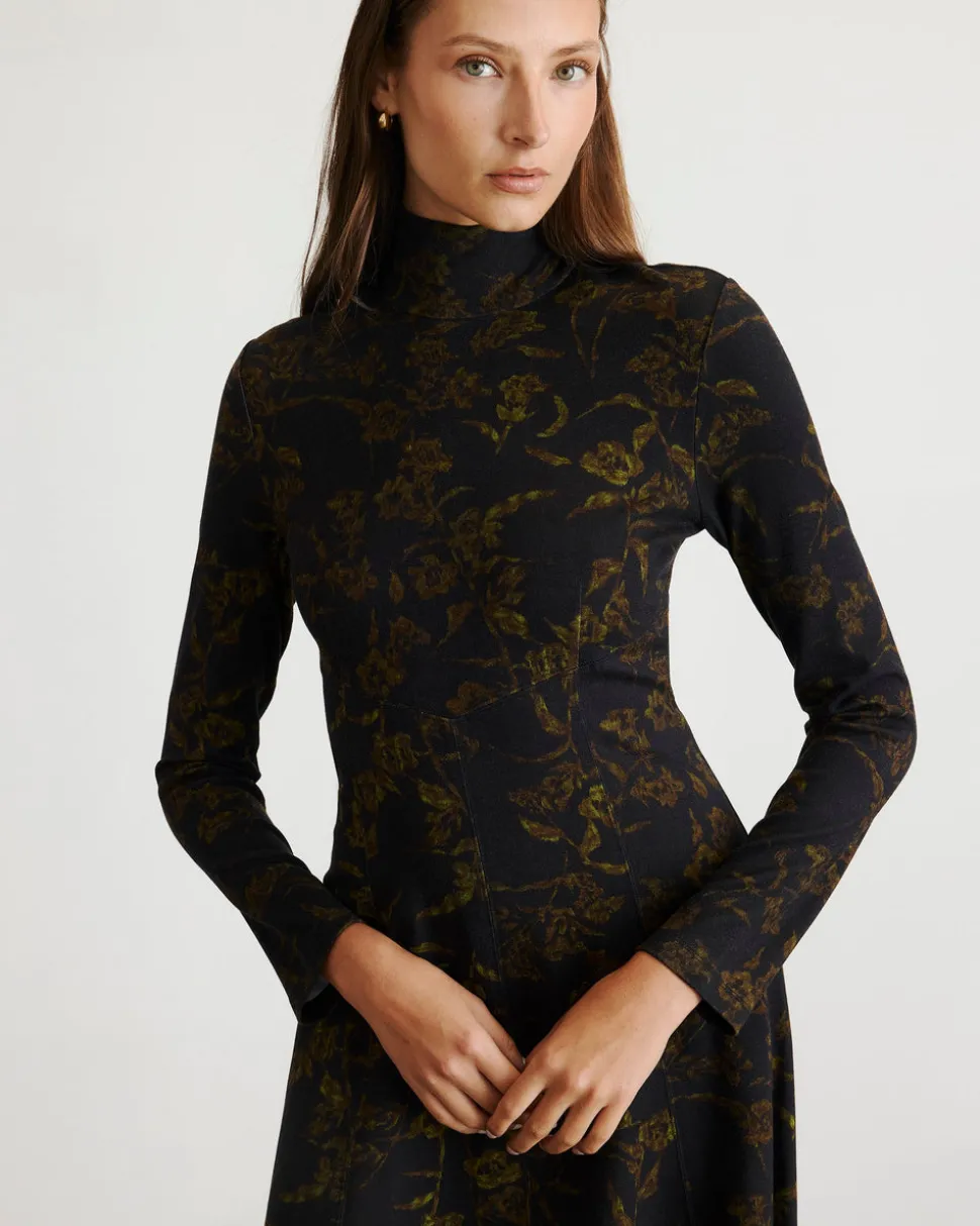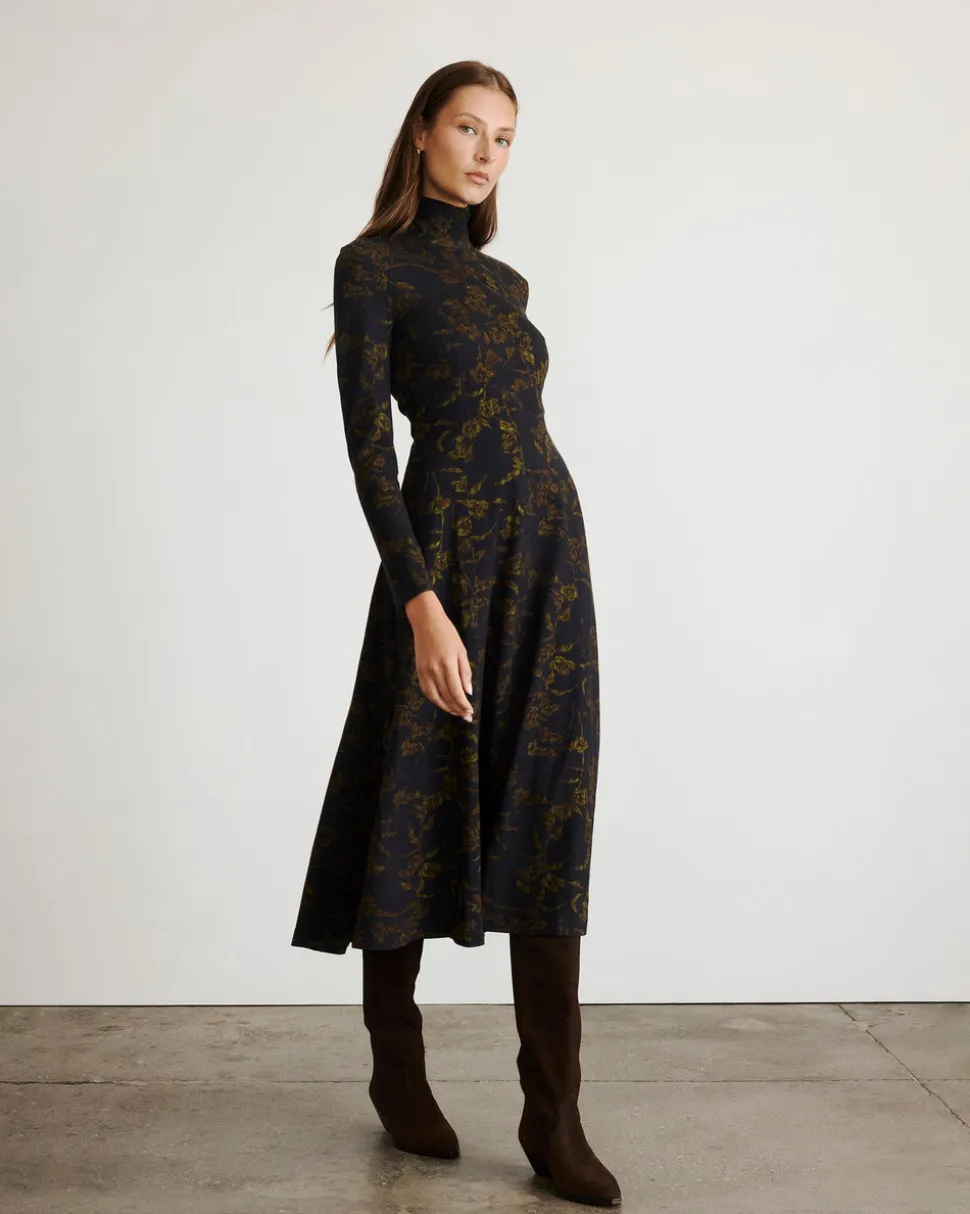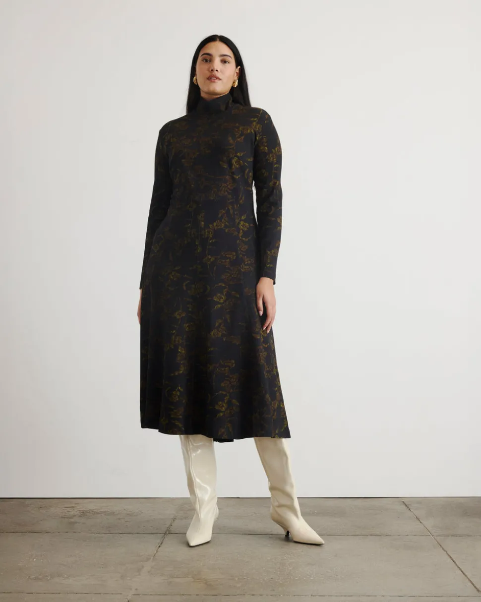 Creating clothing that inspires confidence, celebration, and community, Tanya Taylor is a New York-based womenswear brand whose mission is to provide practicality and style to a range of ready-to-wear in inclusive sizes. Each collection is thoughtfully designed through the artful use of color, texture, and original hand-painted prints. A signature silhouette, the Thea Dress in Black & Forest Green Multi returns for Fall as a transitional midi staple. Designed with a figure-grazing fit, turtleneck, and midi-length hemline, Thea is soft to the touch with comfortable stretch while retaining its feminine shape. Style it with tall boots by day and strappy heels by night for effortless versatility.