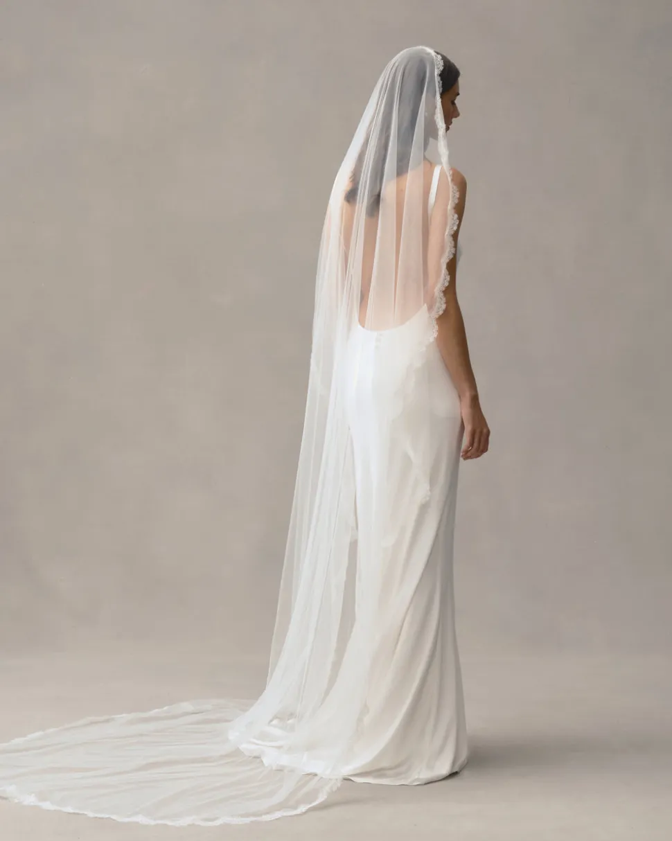 Famed for their comfort and wearability, Alexandra Grecco’s gowns and accessories find the balance between what is stylish and what is timeless. Handmade in New York’s garment district, these pieces embrace refinement and luxury from their graceful silhouettes to each immaculate detail. Elegant and subtle, the Theo Veil is edged in a delicate French lace border. Comb is attached to secure in place.